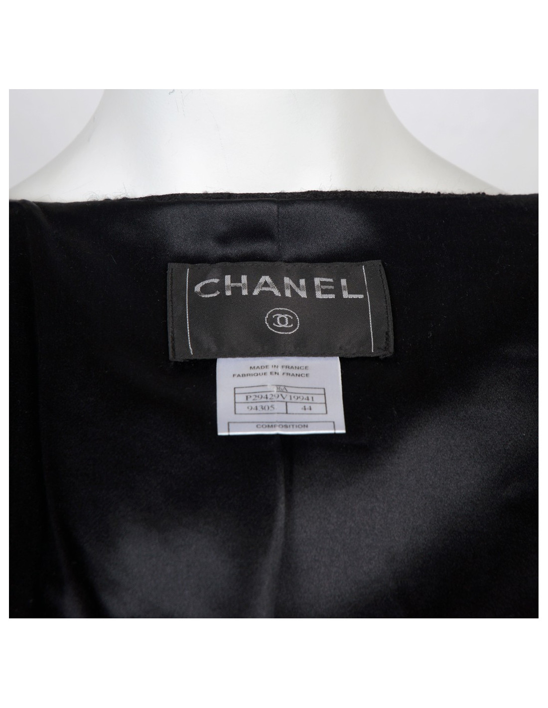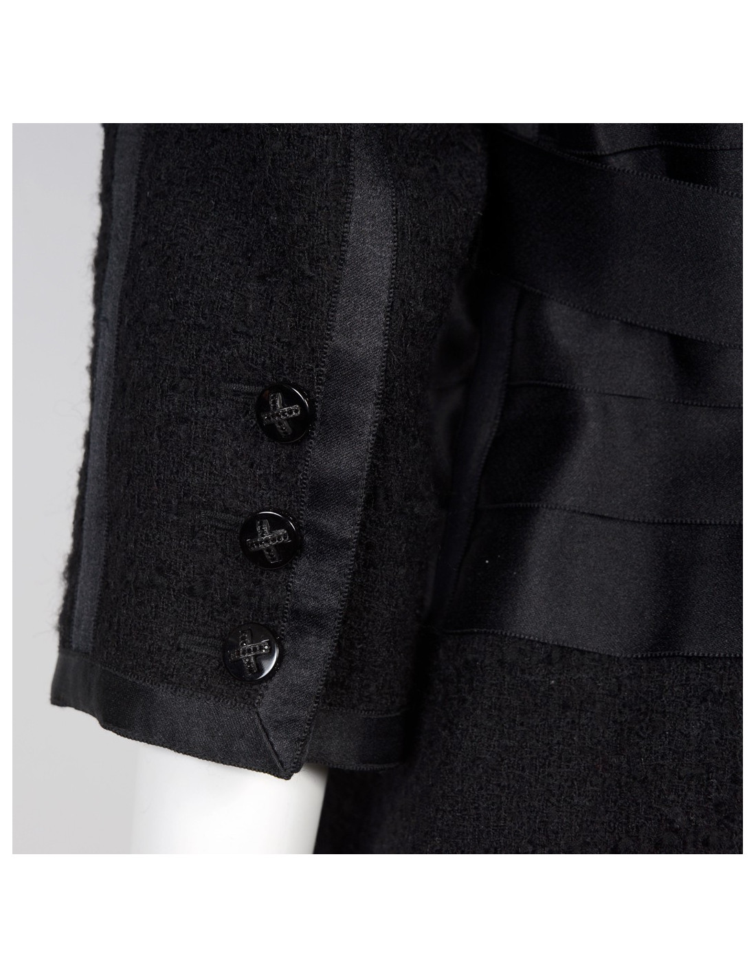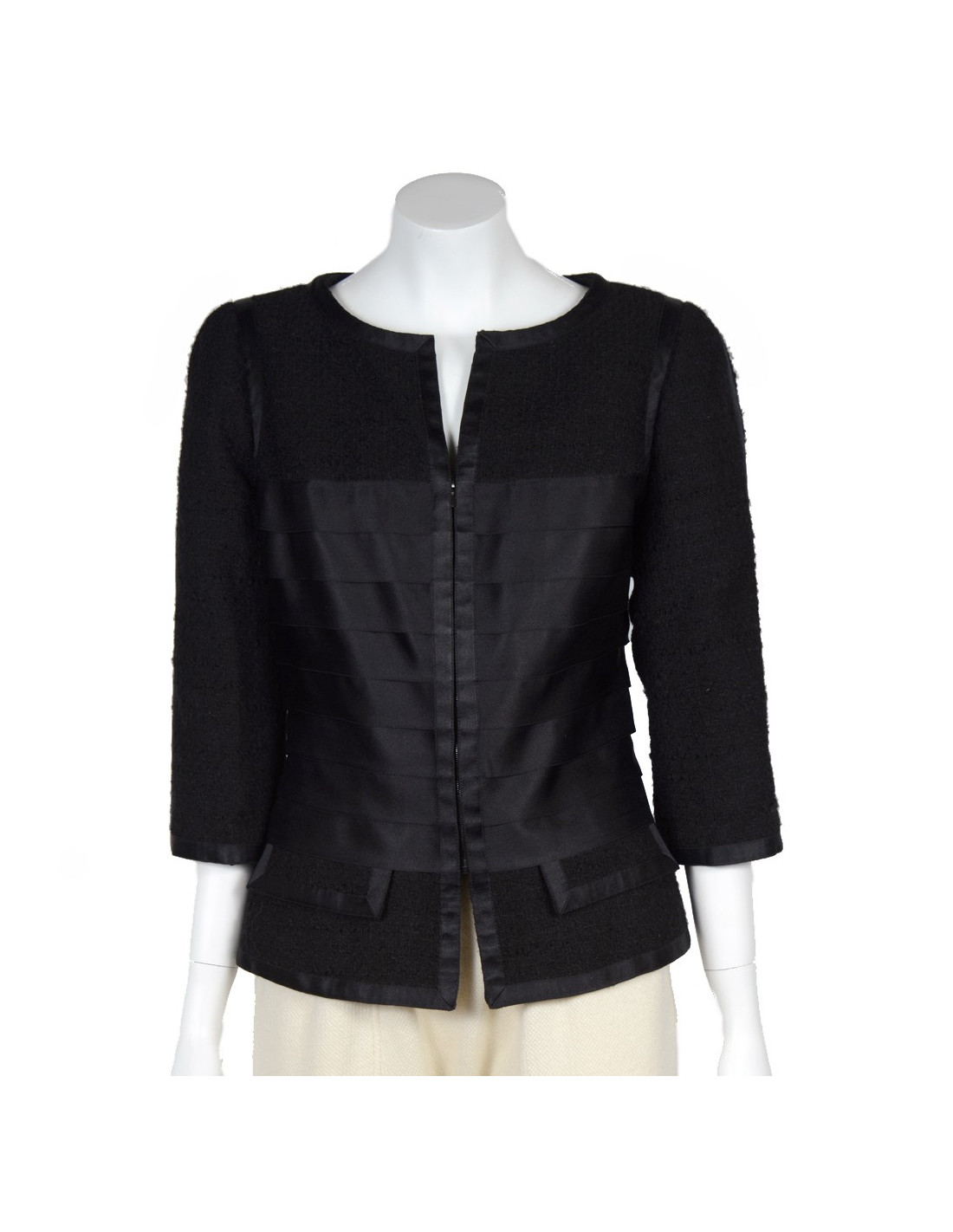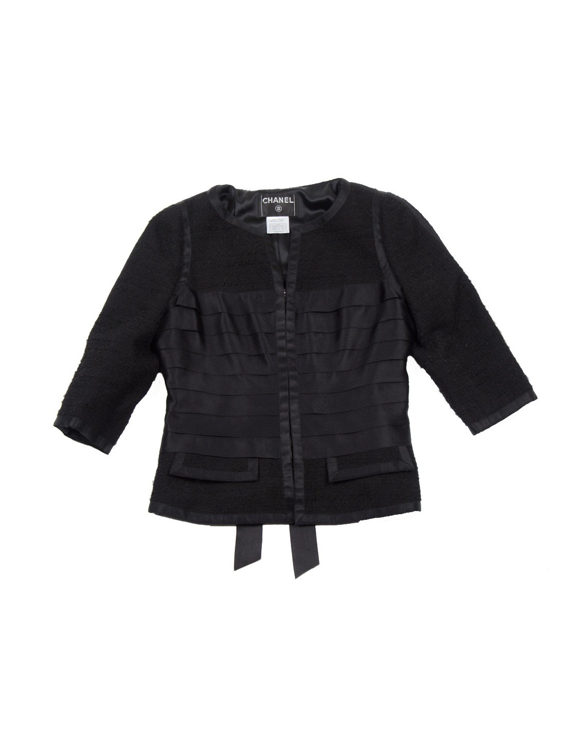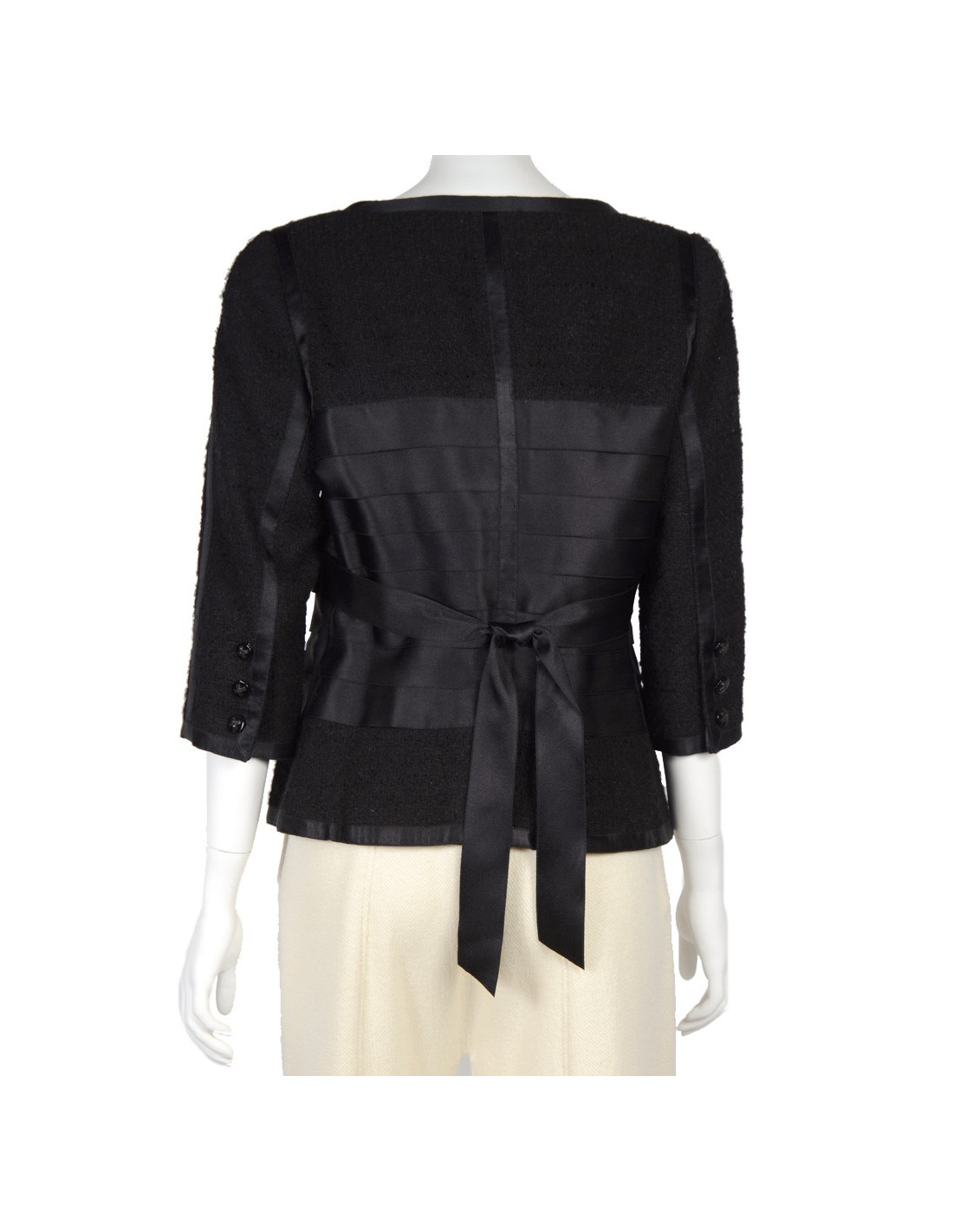 Veste Chanel en tweed noir. Taille 44. Veste noire en laine tweed avec des rubans noirs satinés. Manches trois quarts. Deux mini poches au bas de la veste devant. Ruban ceinturé au dos. Fermeture de la veste avec un zip. Trois boutons en croix avec strass de chaque côté du bas des manches.