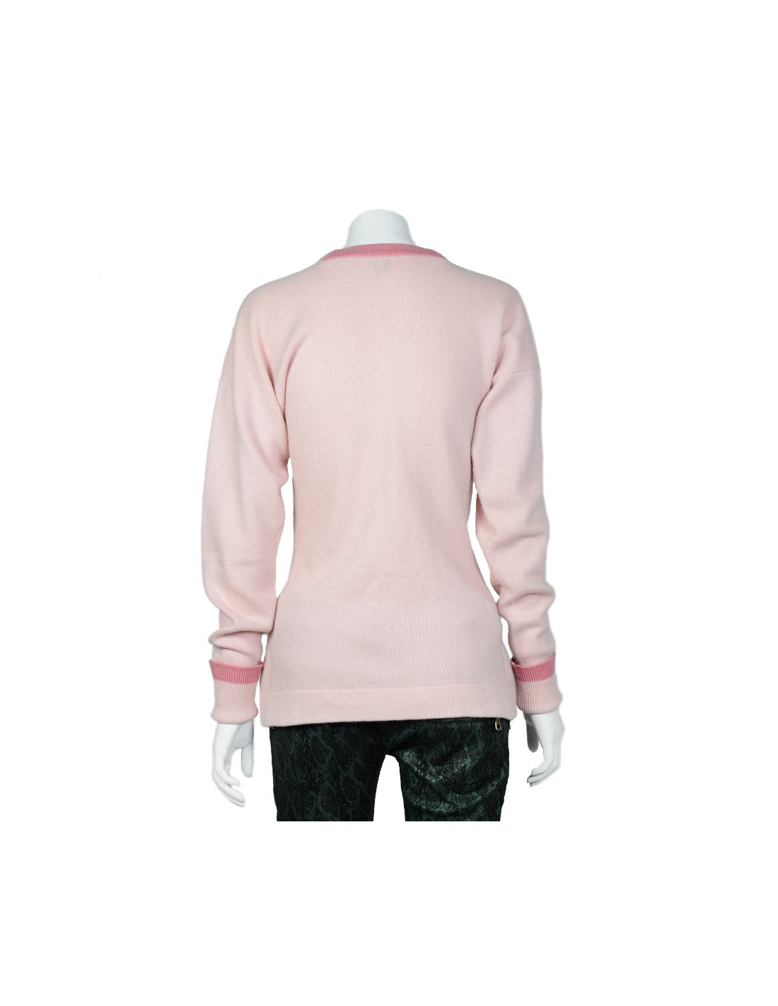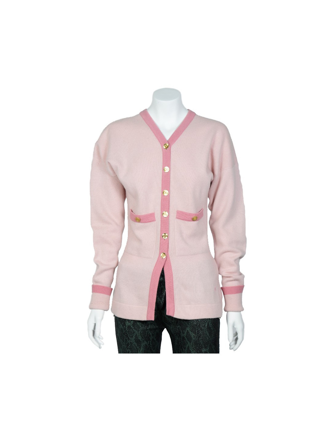 Cardigan Chanel vintage en cachemire rose. Pas d'étiquette de taille, équivaut à un 38. Fermeture 6 boutons couture dorés avec le sigle "CC" au centre. Il dispose de deux poches plaquées fermées par un bouton également. Les bordures sont de couleur rose pastel. En très bon état.