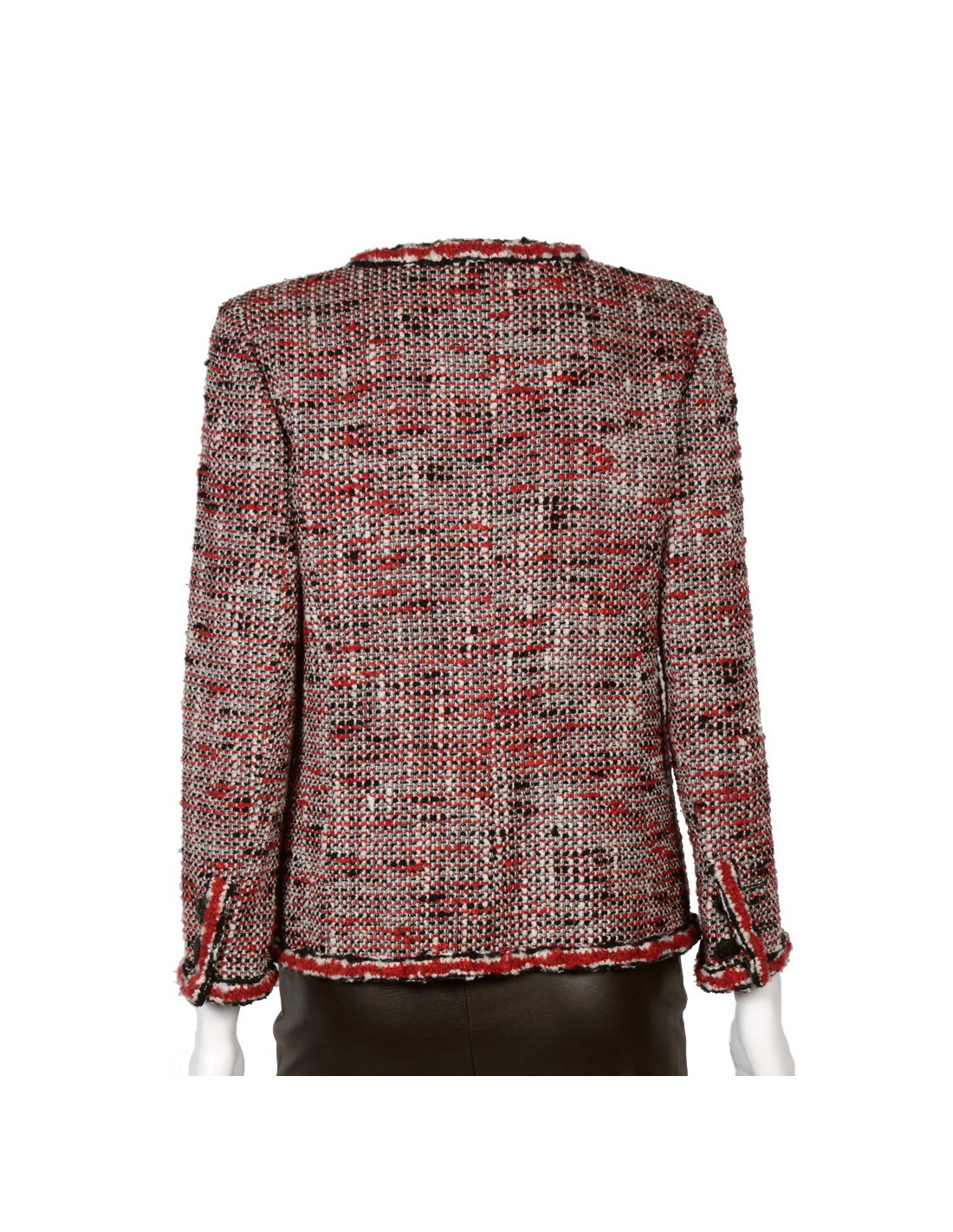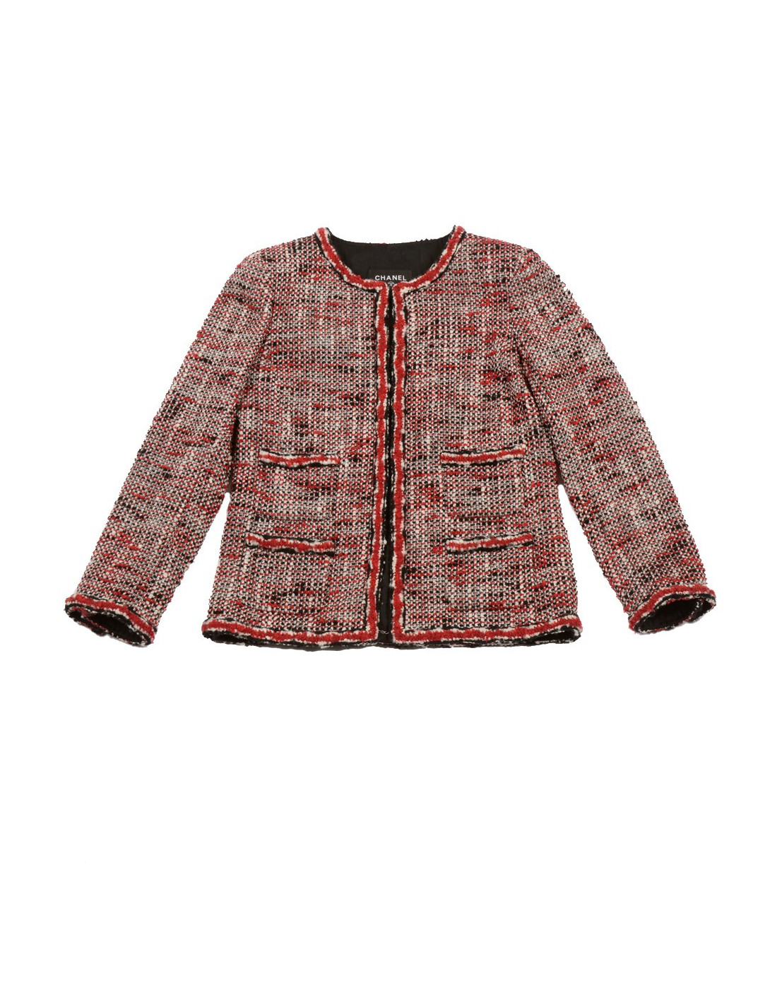Veste Chanel en tweed rouge T38 (l'étiquette de taille a été coupée), sublime modèle indémodable en tweed rouge, noir et blanc. Quatre jolis poches sur le devant de la veste et deux ravissants boutons noirs surmontés de couronnes et CC noir. Fermeture par un petit crochet au niveau du col. Doublure en soie noire siglée de CC, de camélias et de "Chanel". Chaîne de maintien en métal argenté dans le bas de la veste.