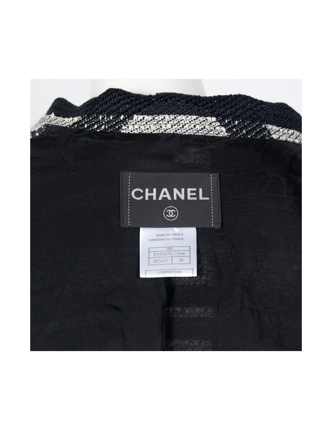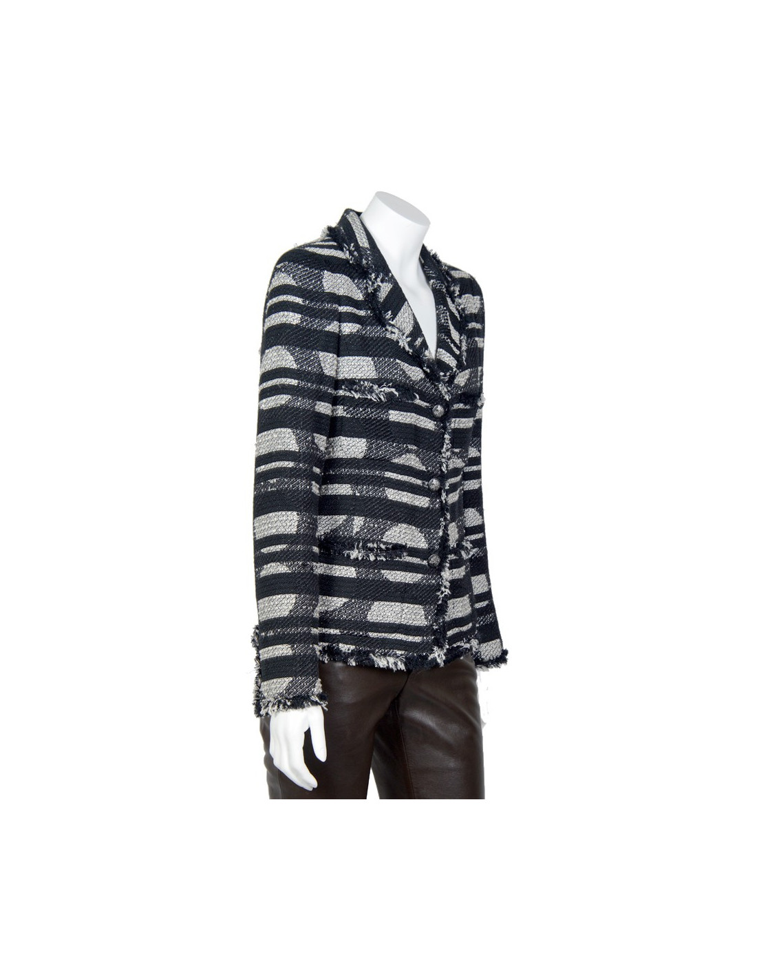Veste Chanel T36, en coton, polyamide et soie noir et blanc, issue de la Collection Printemps 2008. Ravissants boutons noirs à têtes de lion argent mat et strass noirs surmontés d'un CC. Quatre poches sur le devant de la veste. Doublure en soie noire représentant les camélias, CC, "Chanel", "Cambon". Très bon état.