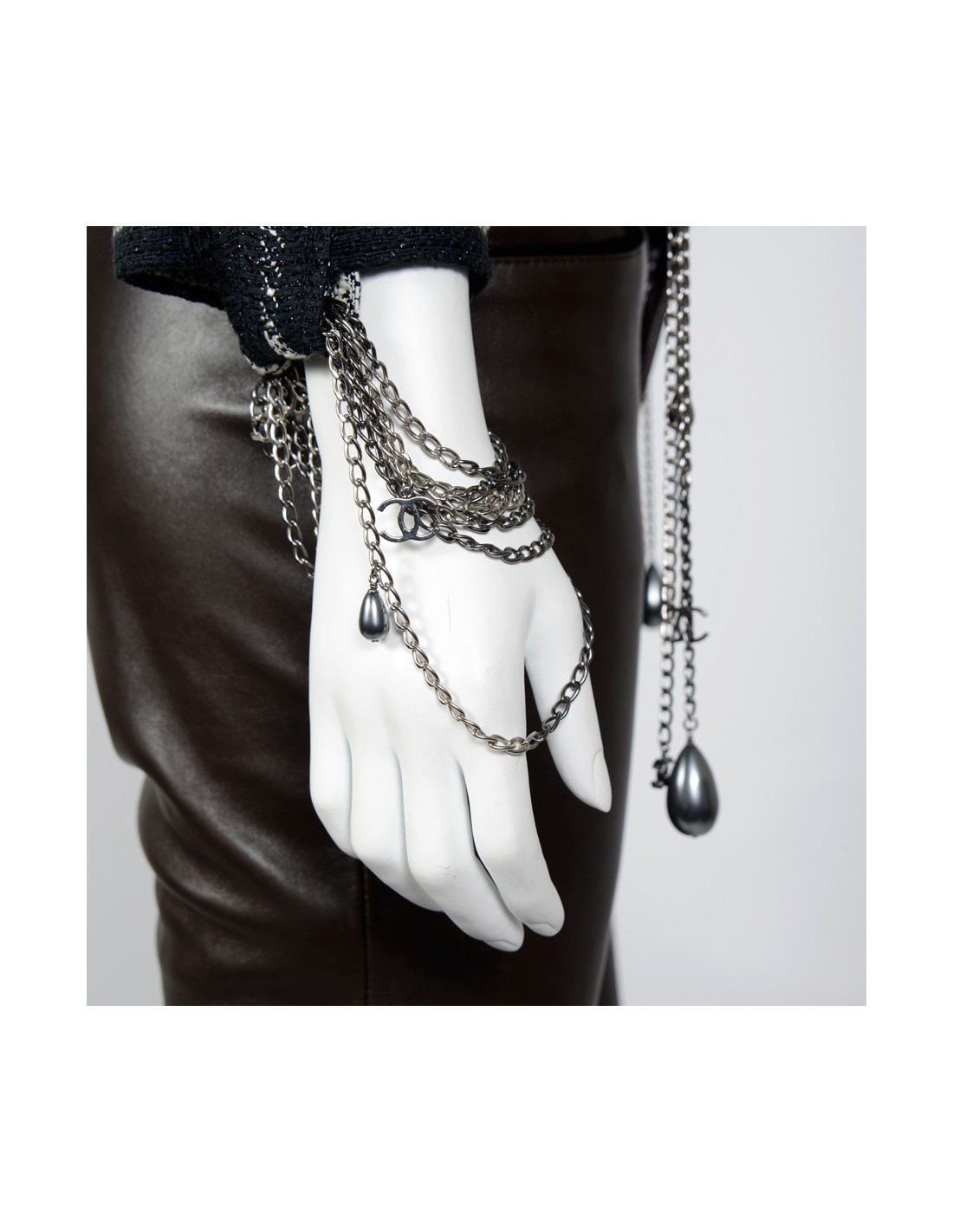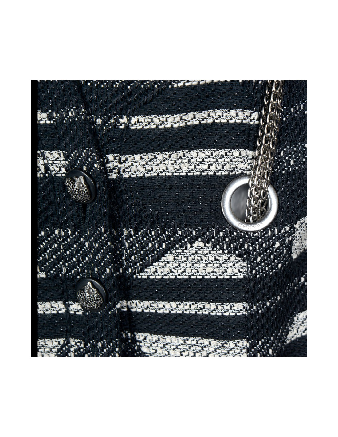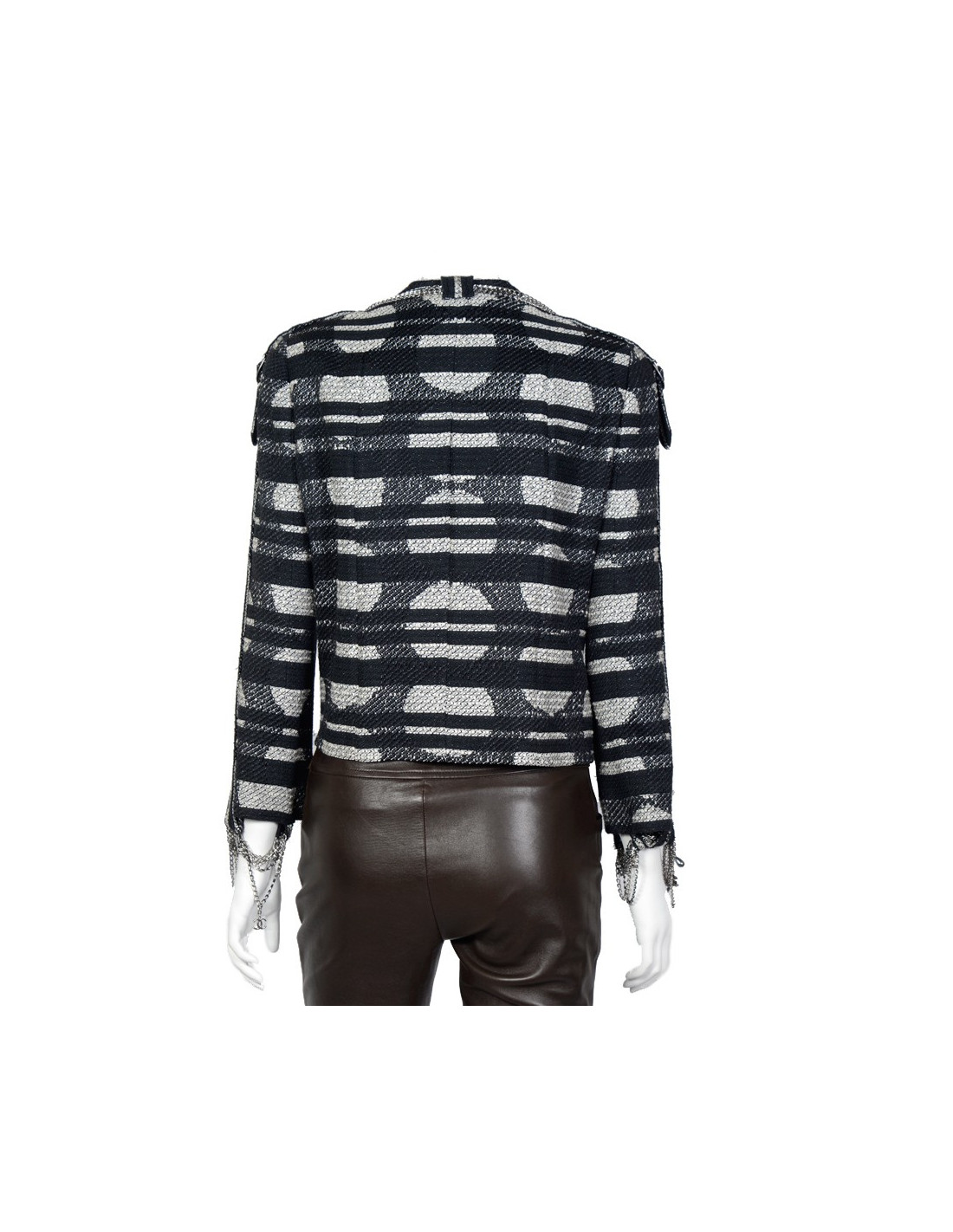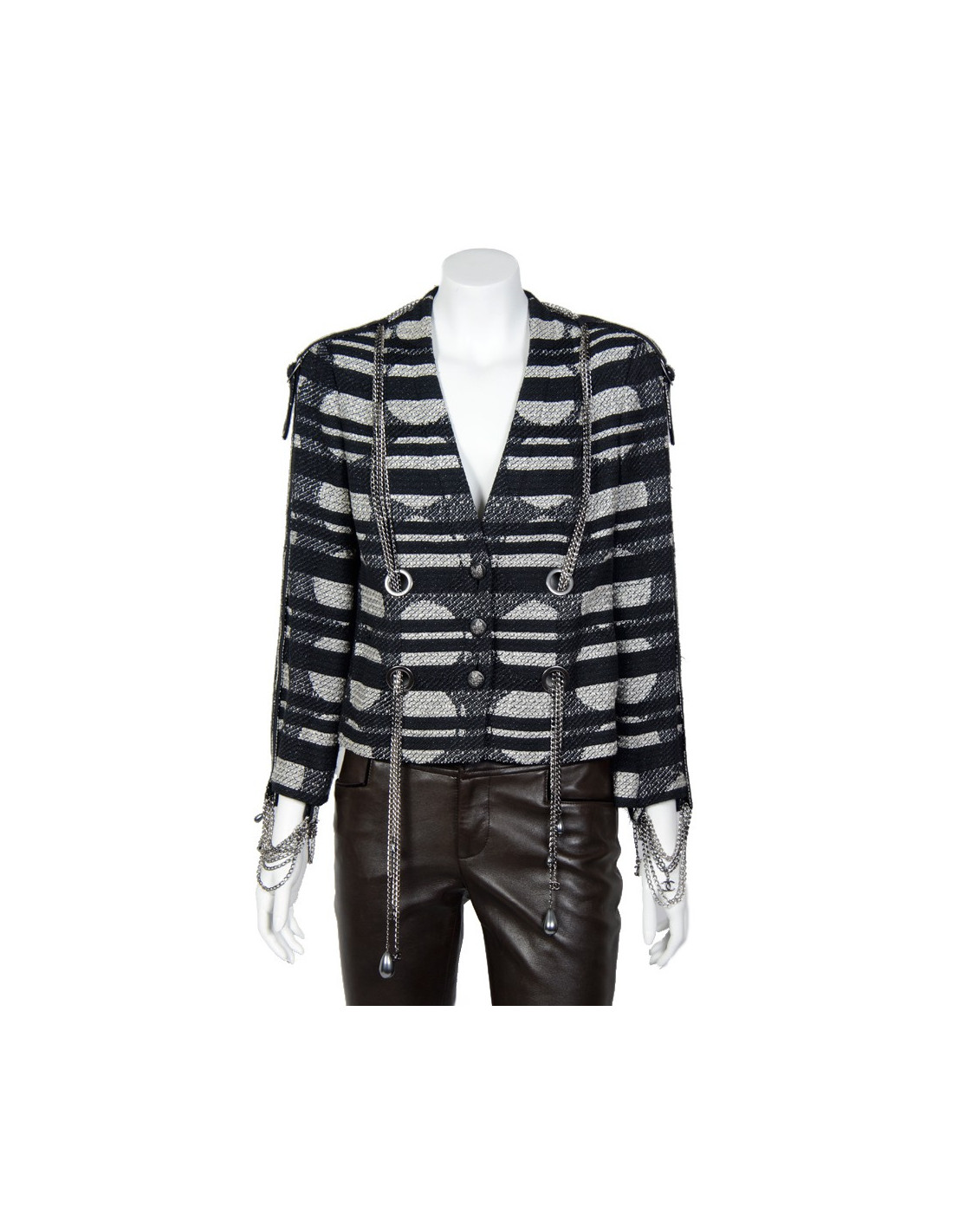 Sublime Veste courte CHANEL t 38 de la Collection Printemps 2008, de couleur noir et blanc, cousu de fils noirs brillants. Les boutons représentent la tête du lion (emblème cher à Mademoiselle Coco) Elle est parée de bijoux. Quatre chaînes argentées parcourent la veste en se terminant par des perles grises et des doubles "C" ainsi que sur les poignées, retenues par des pattes de tissu qui se referment par des pressions .