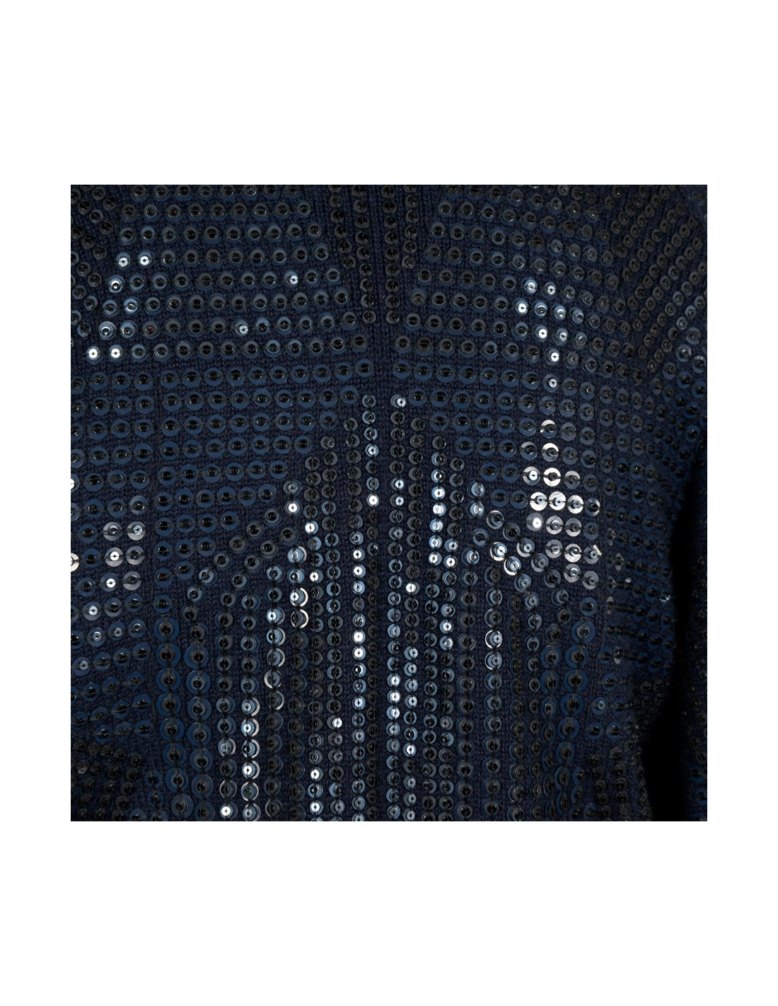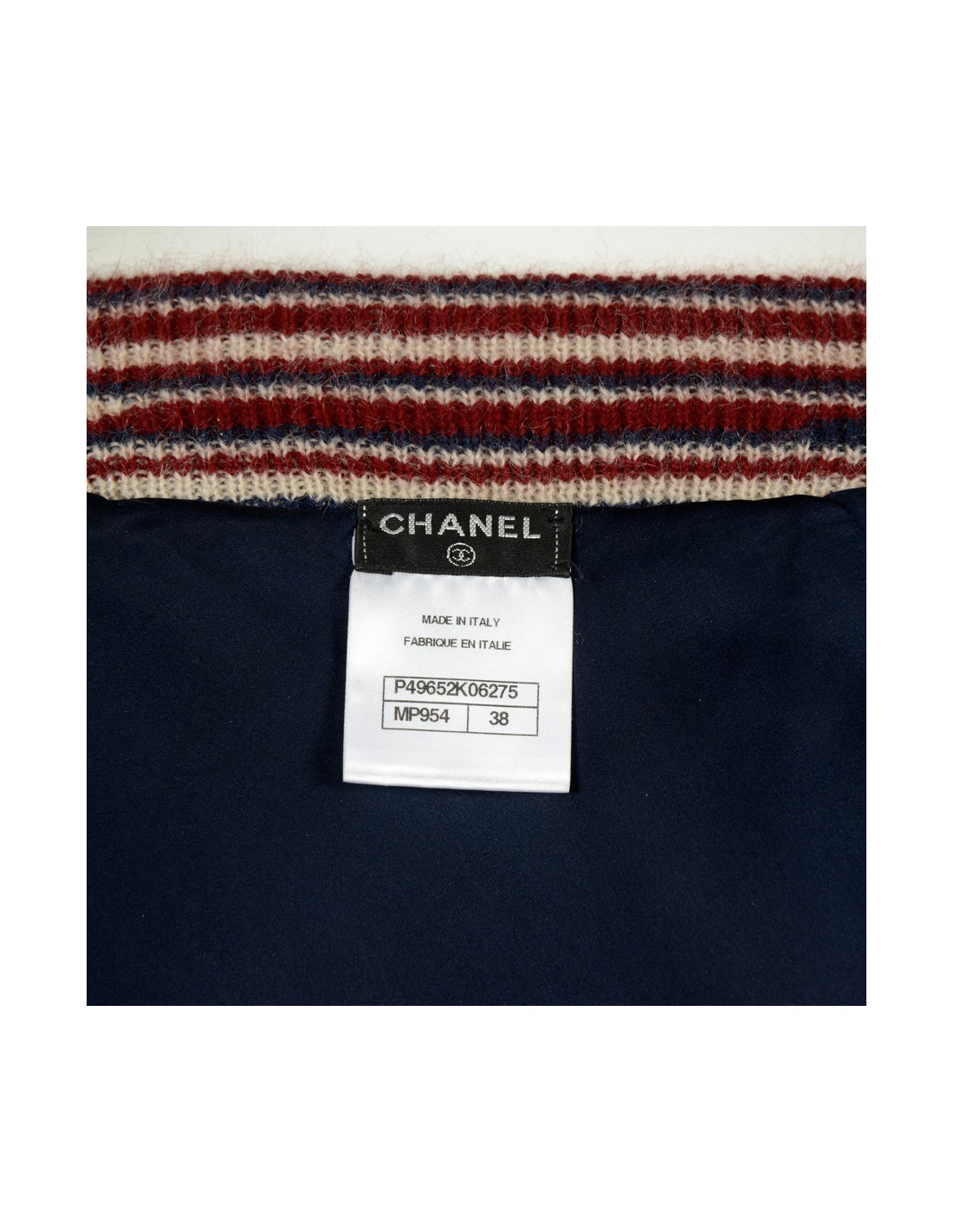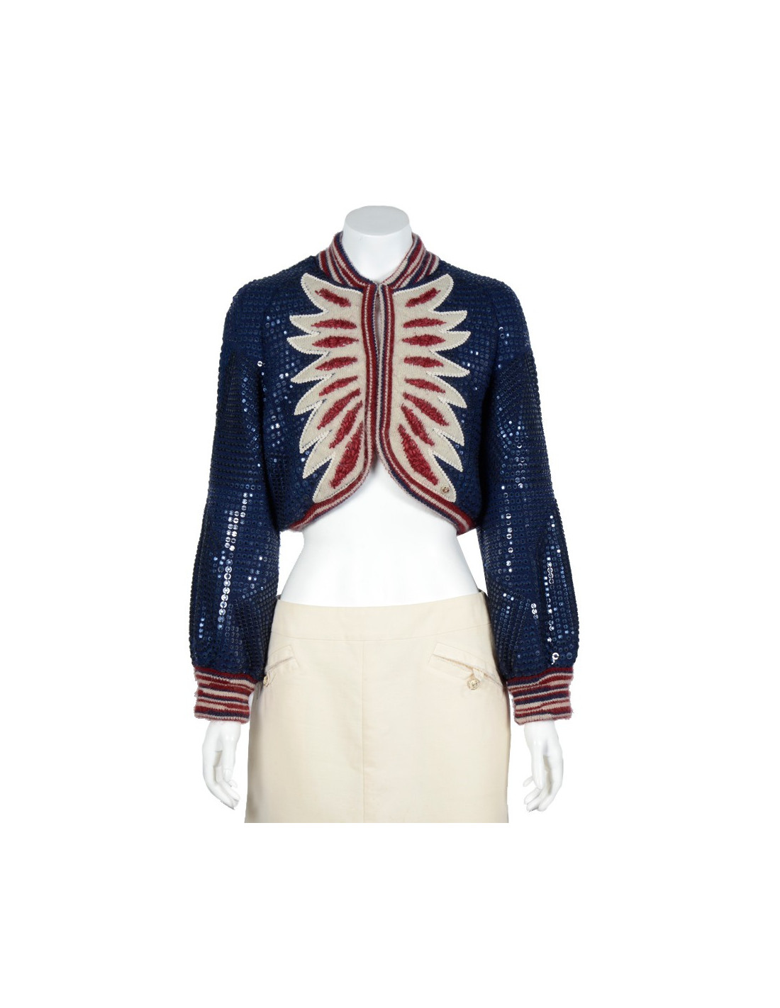 Magnifique Gilet Chanel (col Teddy) de la collection "Paris Dallas" (2014), taille 38. Il est en cachemire bleu, rouge et beige. Les sequins sont brodés sur la partie en cachemire bleu marine, la doublure est en soie. Veste courte, elle tombe légèrement sur la taille. Les manches sont bouffantes, fermeture par trois crochets intérieurs. Pièce d'exception pour un look sophistiqué et décontracté