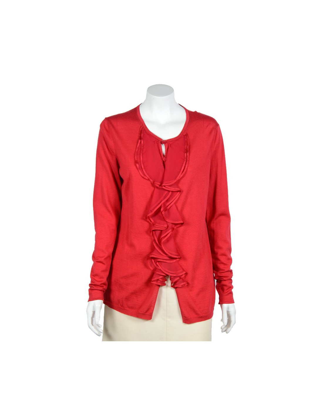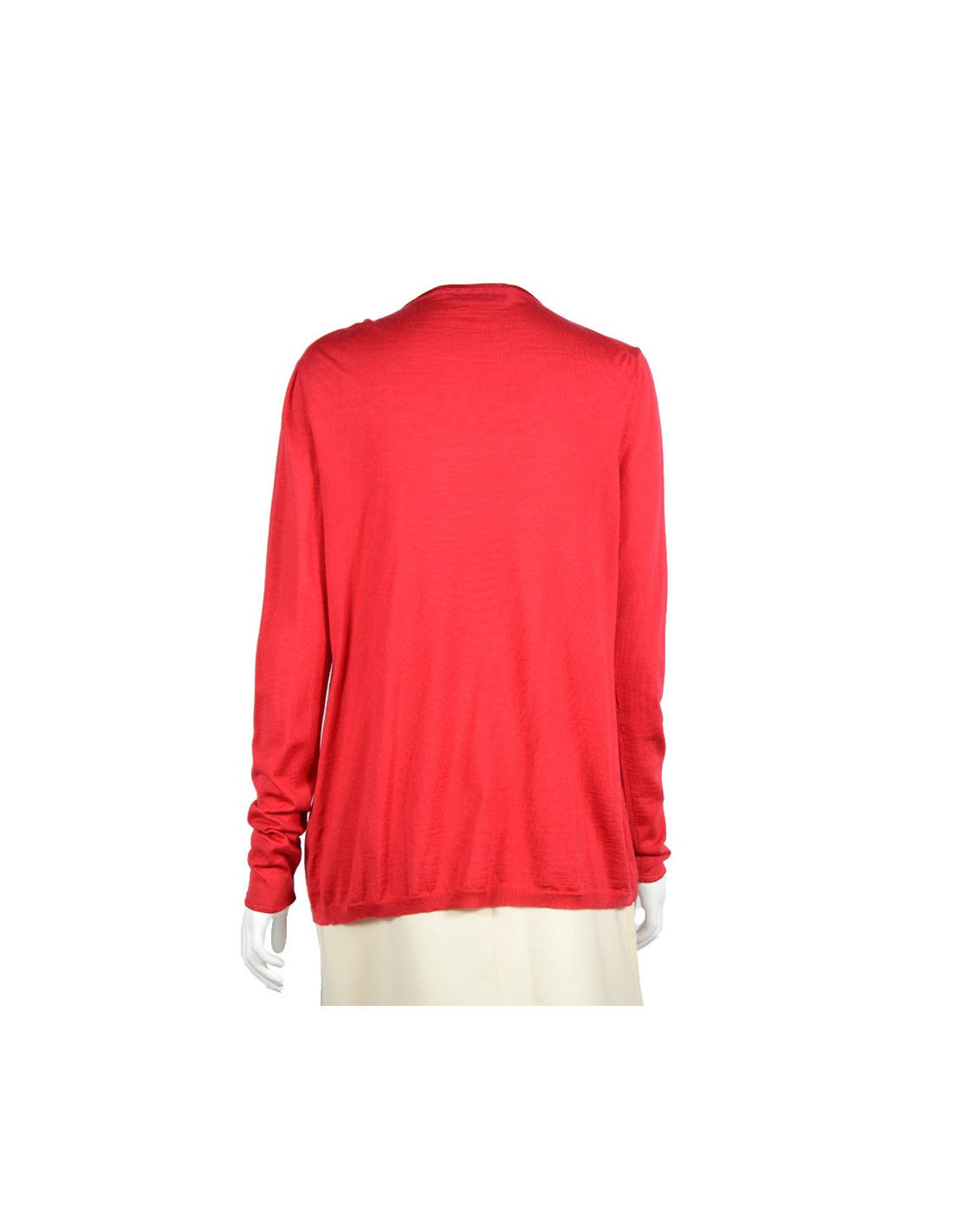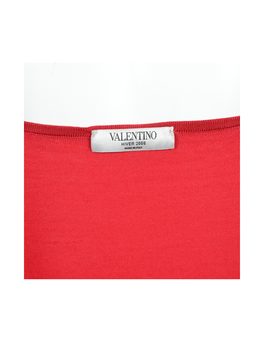 Gilet Valentino en soie et laine rouge. Pas d'étiquette de taille, équivaut à un 40. Il se ferme par neuf petits boutons rouge dissimulés derrière des gondoles. (il y a une tâche sur le gilet). Il est en très bon état.
