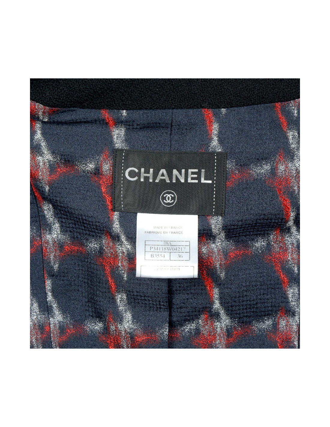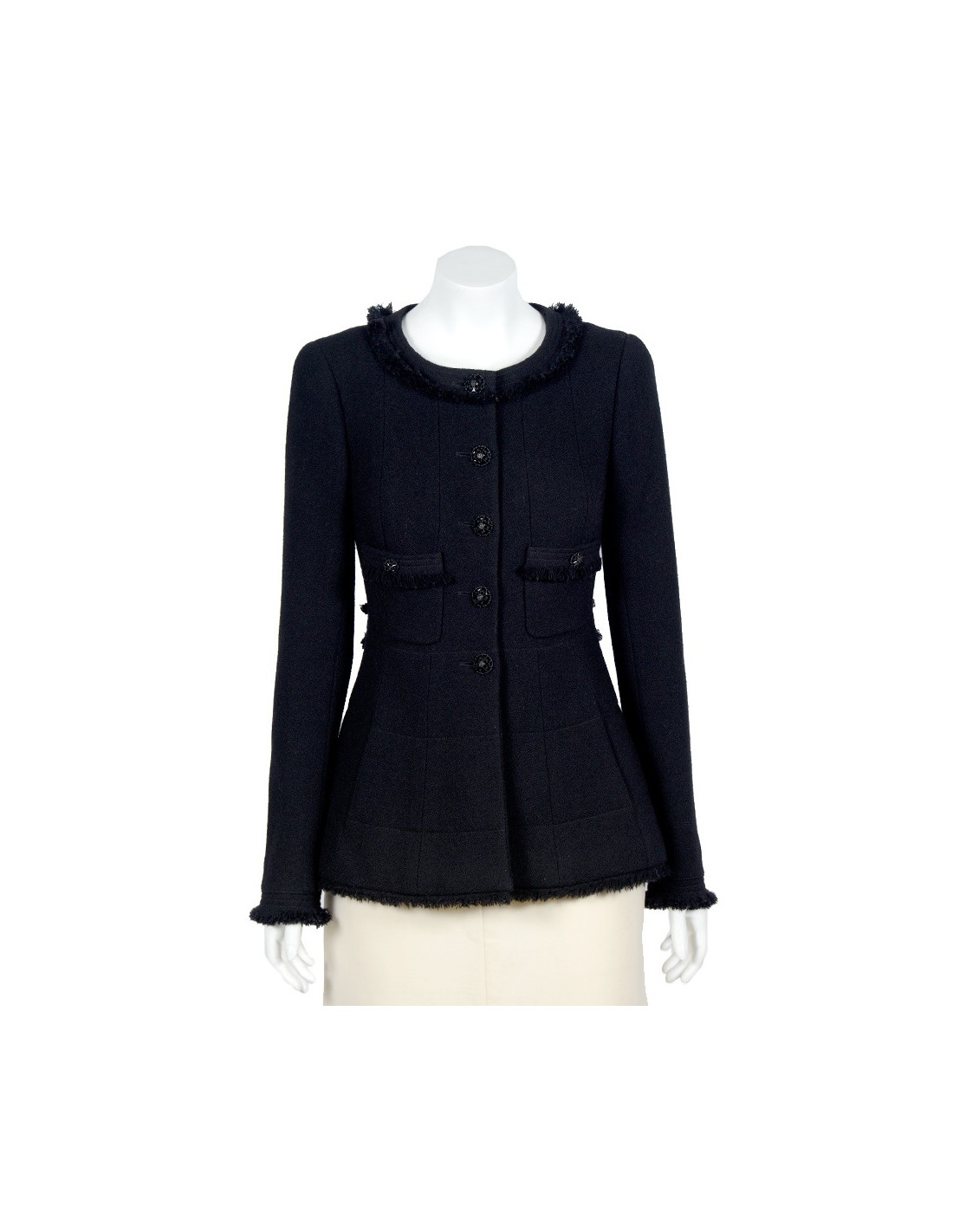 Veste Chanel T38 en tweed noir (100% laine), quatre jolis boutons bijoux noirs sur chaque manche et un à l'arrière rendent cette pièce extrèmement élégante. Légère usure sur certains boutons. En très bon état.
