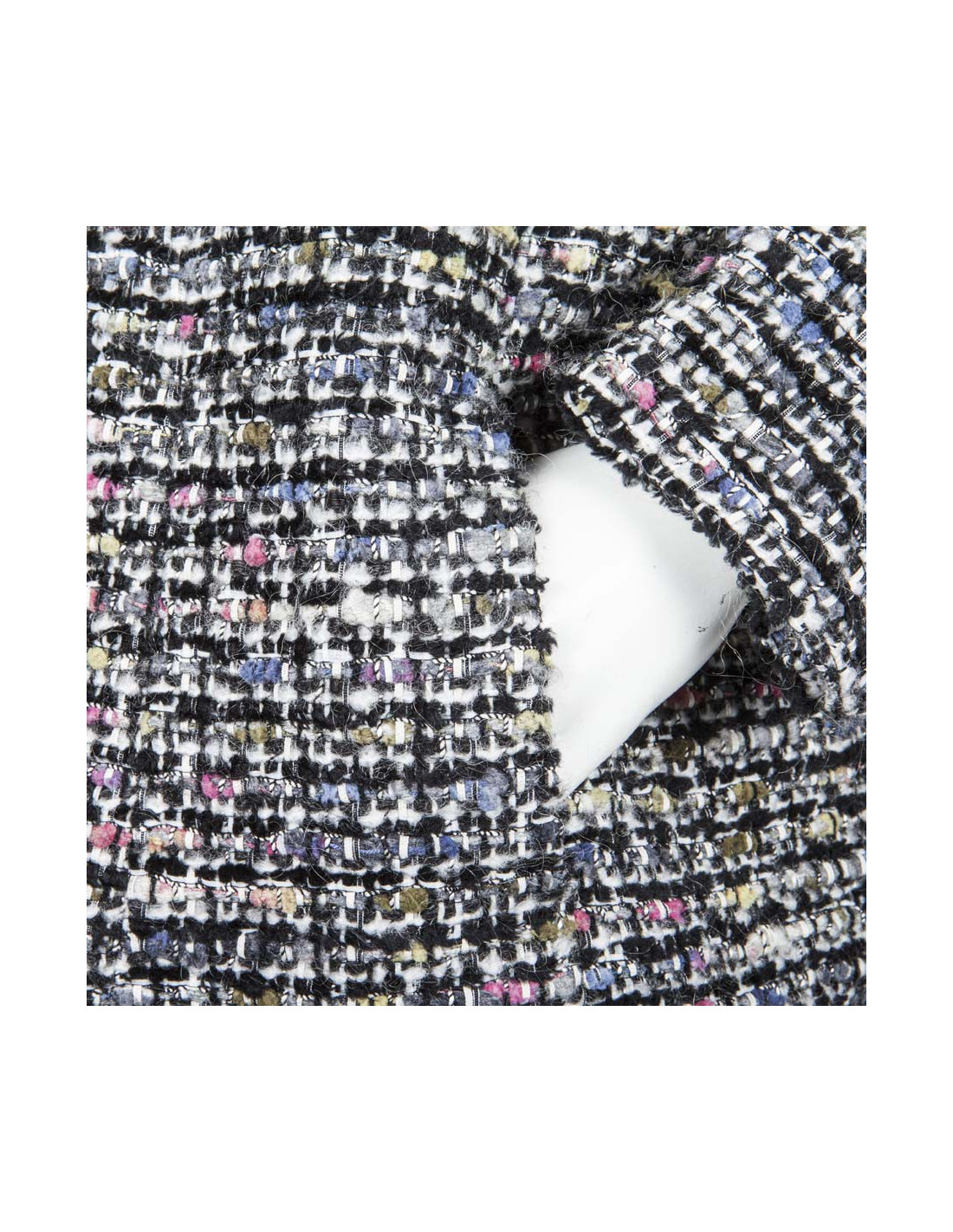 Le bas de la veste est orné d'une fine chaîne argentée.