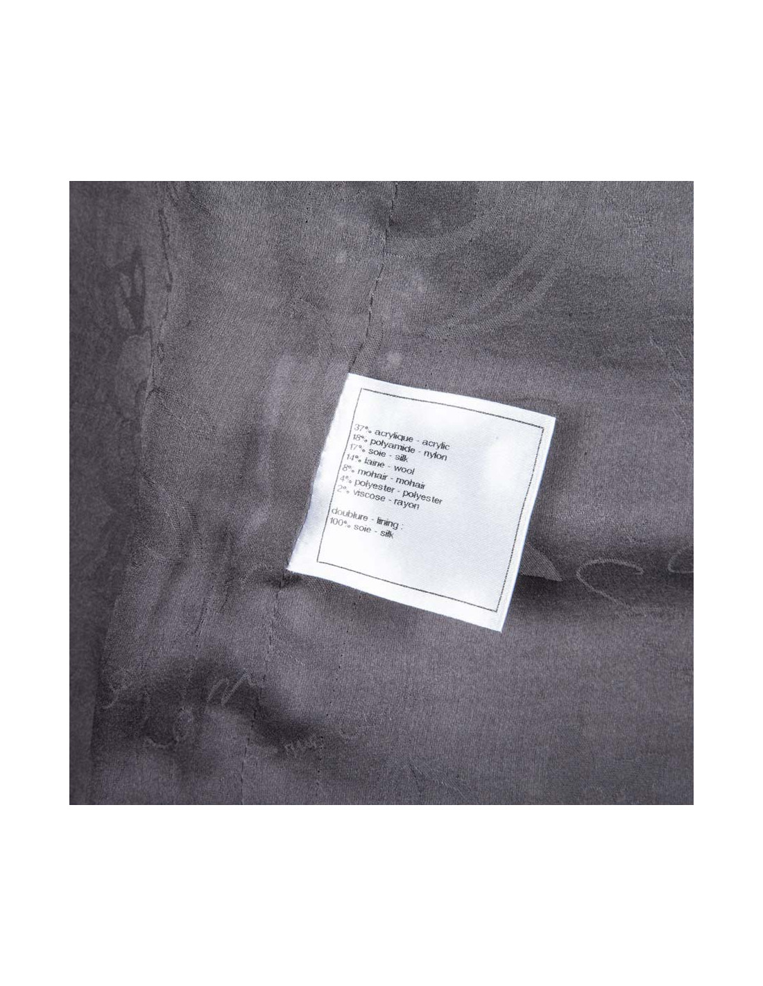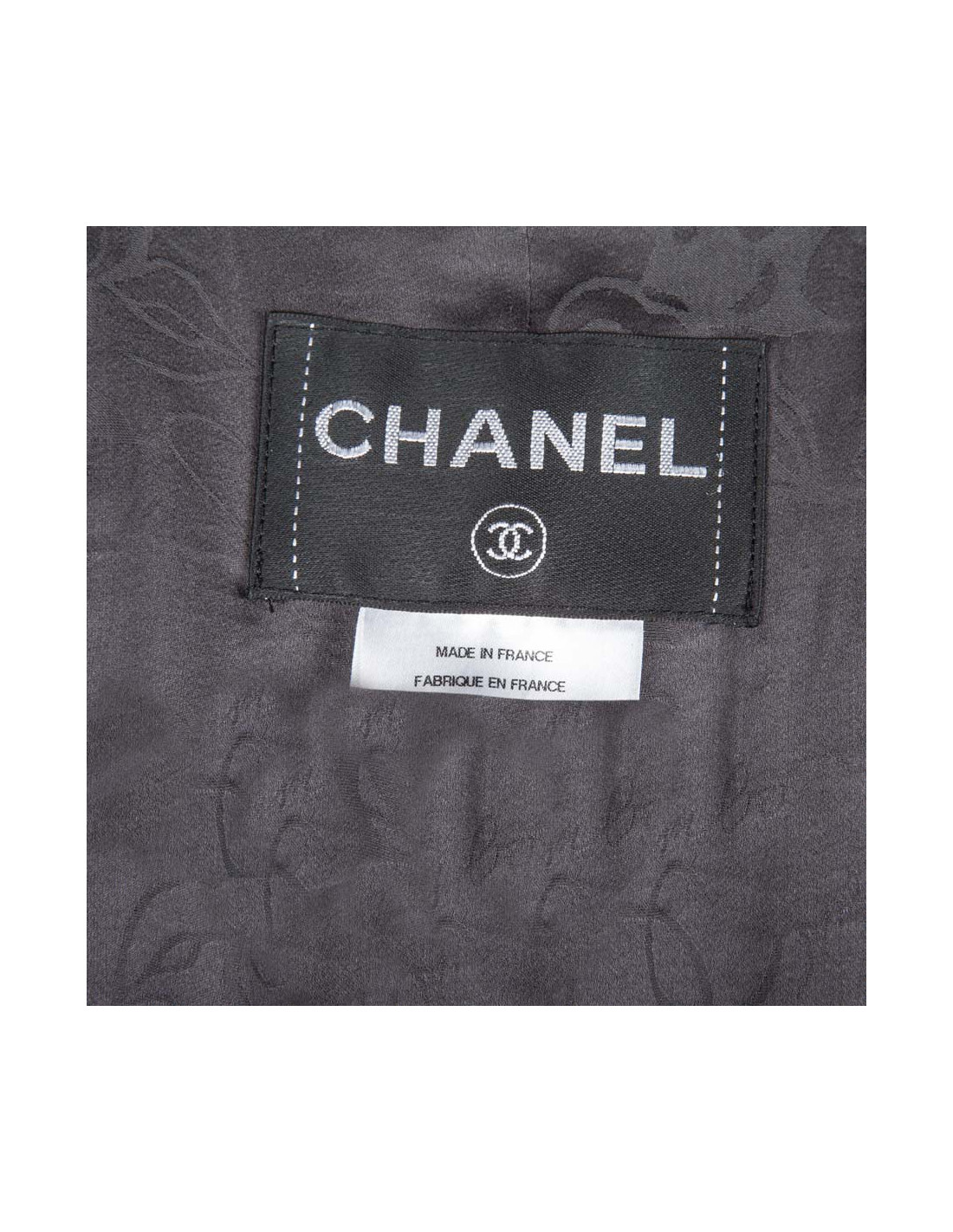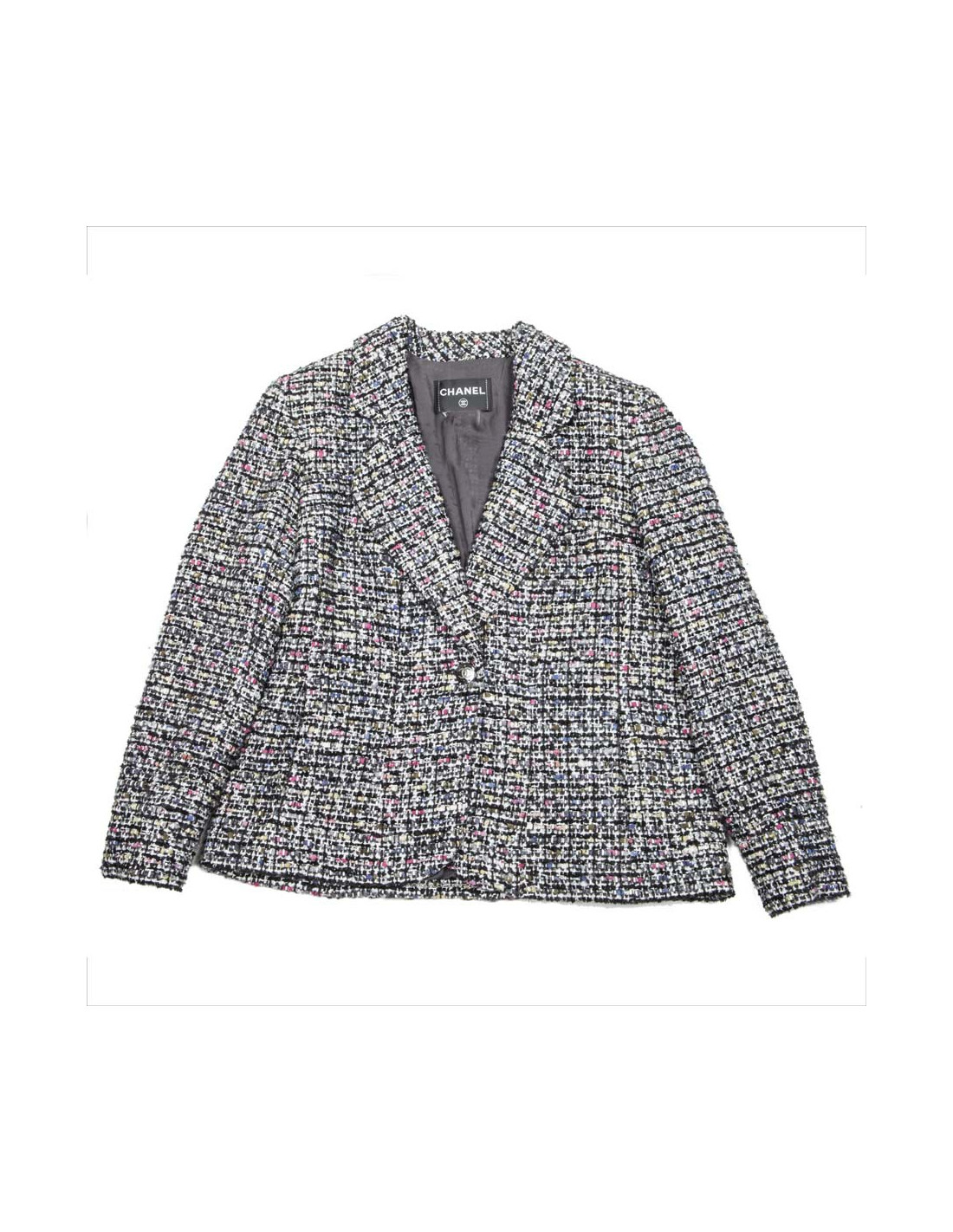 Veste en Tweed Chanel de collection récente, taille 46. Coupe droite, boutons métallisé siglé double CC. La doublure, de soie grise, est monogram.