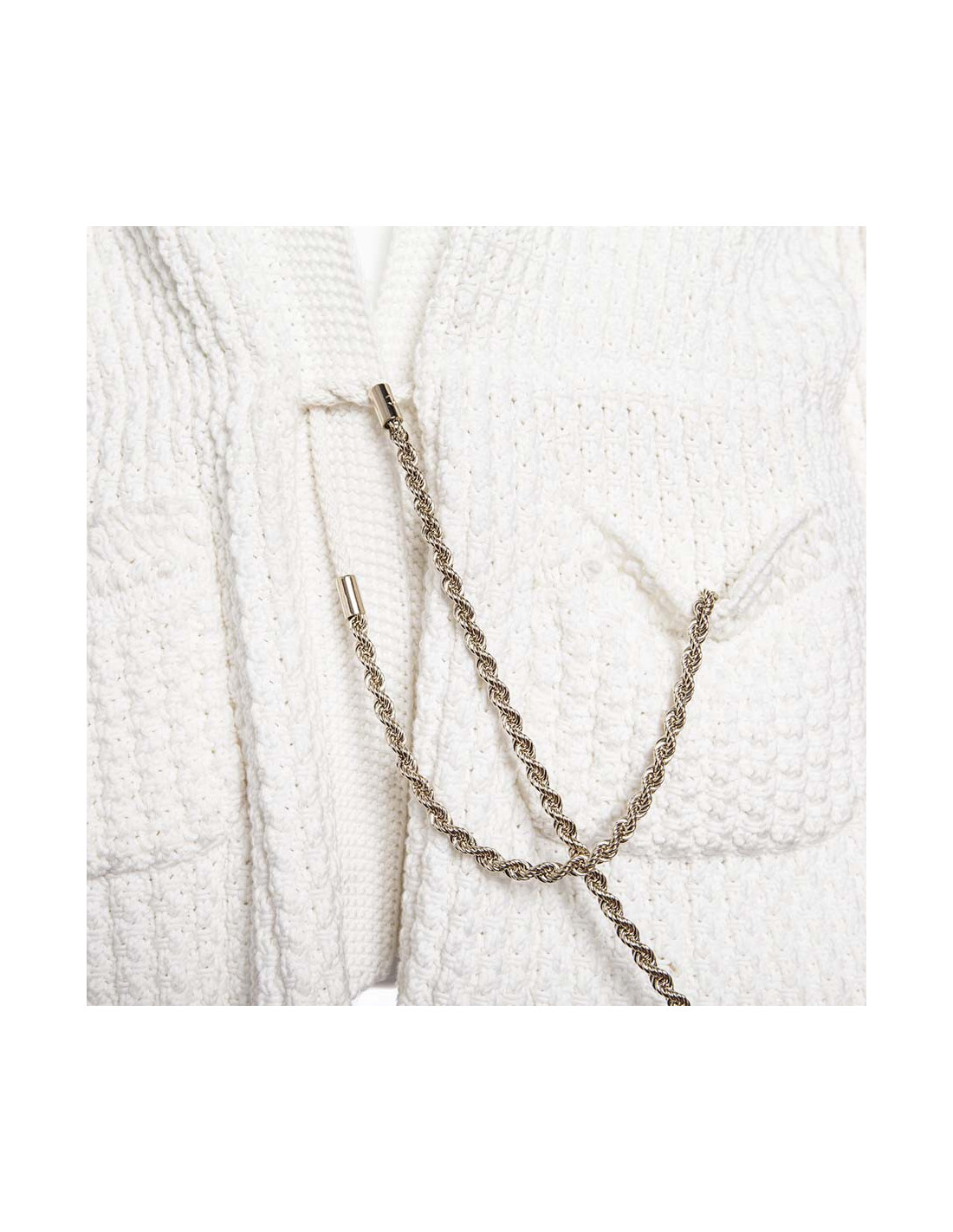 Long Gilet CHANEL en coton blanc, taille 42. Se fronce par une bandoulière se terminant par une chaînette.