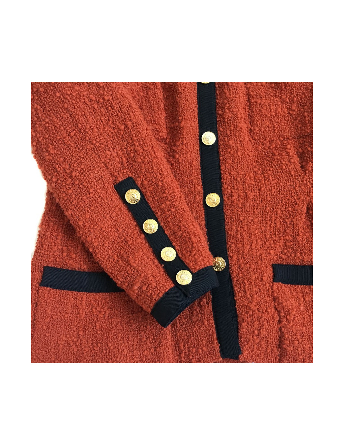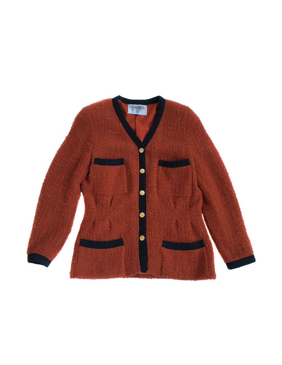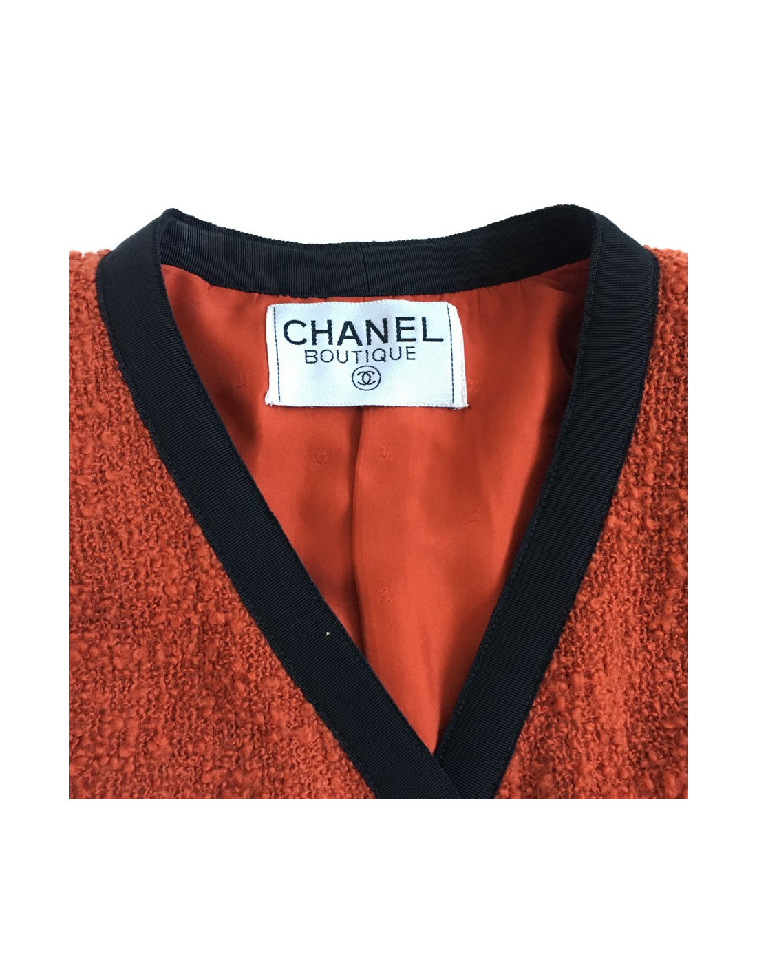 Belle veste classique de la maison "CHANEL" en tweed de couleur rouge orangé et gros grain noir bordant la veste.