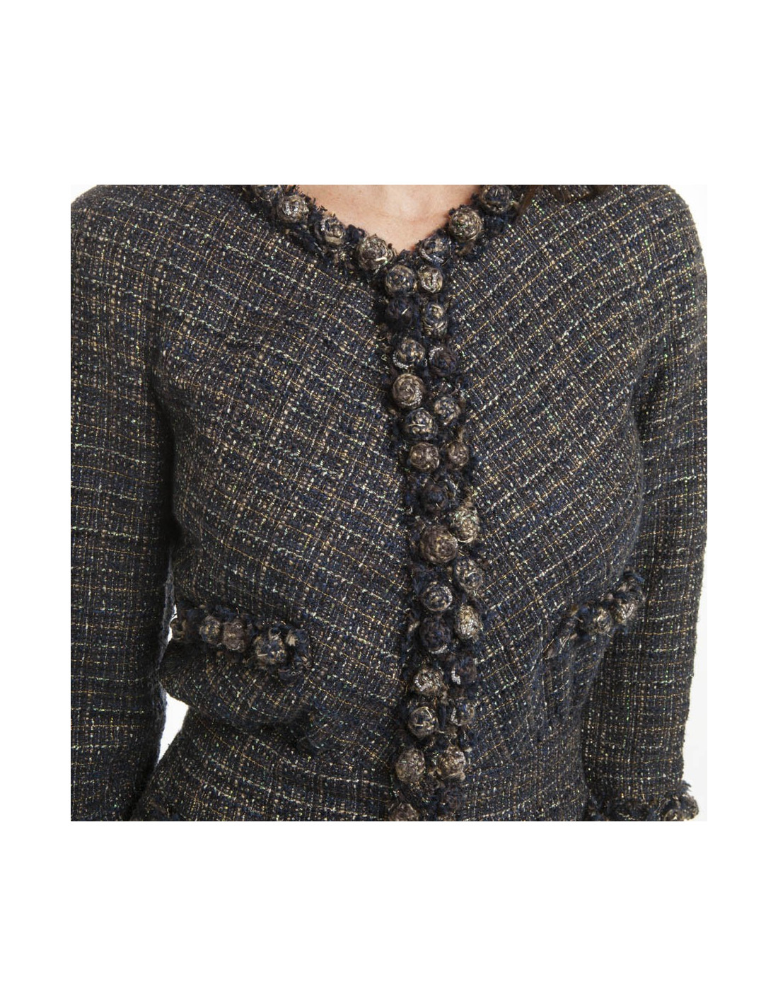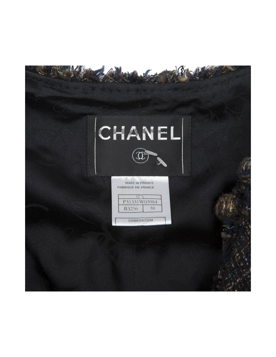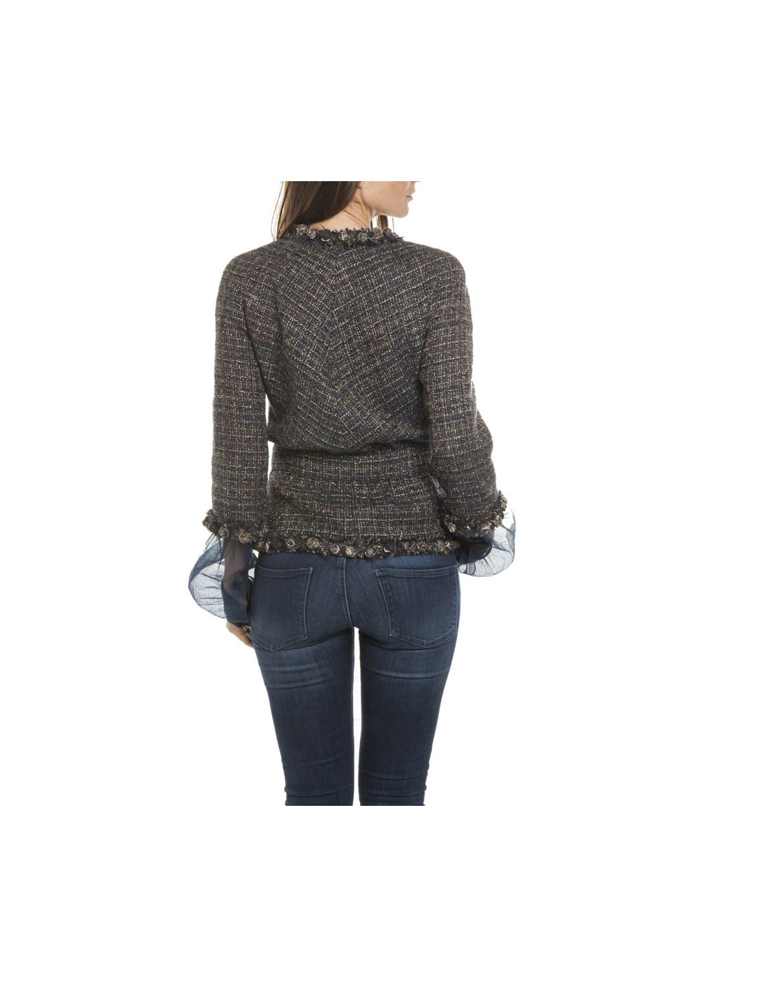 Veste avec cintrée à la taille, de la Maison Chanel en tweed multicolore bleu,marine, fils vert, argenté, gris, marron, violet, fils d'or, etc.... Fermeture centrale avec 7 crochets. Doublure monogram en soie bleu marine. Elle a 4 fausses poches. Elle est gansée par une chaîne de boutons boules sertis de perles minuscules. Les manches sont raglan et 3/4 avec des manches en soie transparentes bleu marine avec des boutons en métal argenté. Les manches en soie ont été retirées. En très bon état.