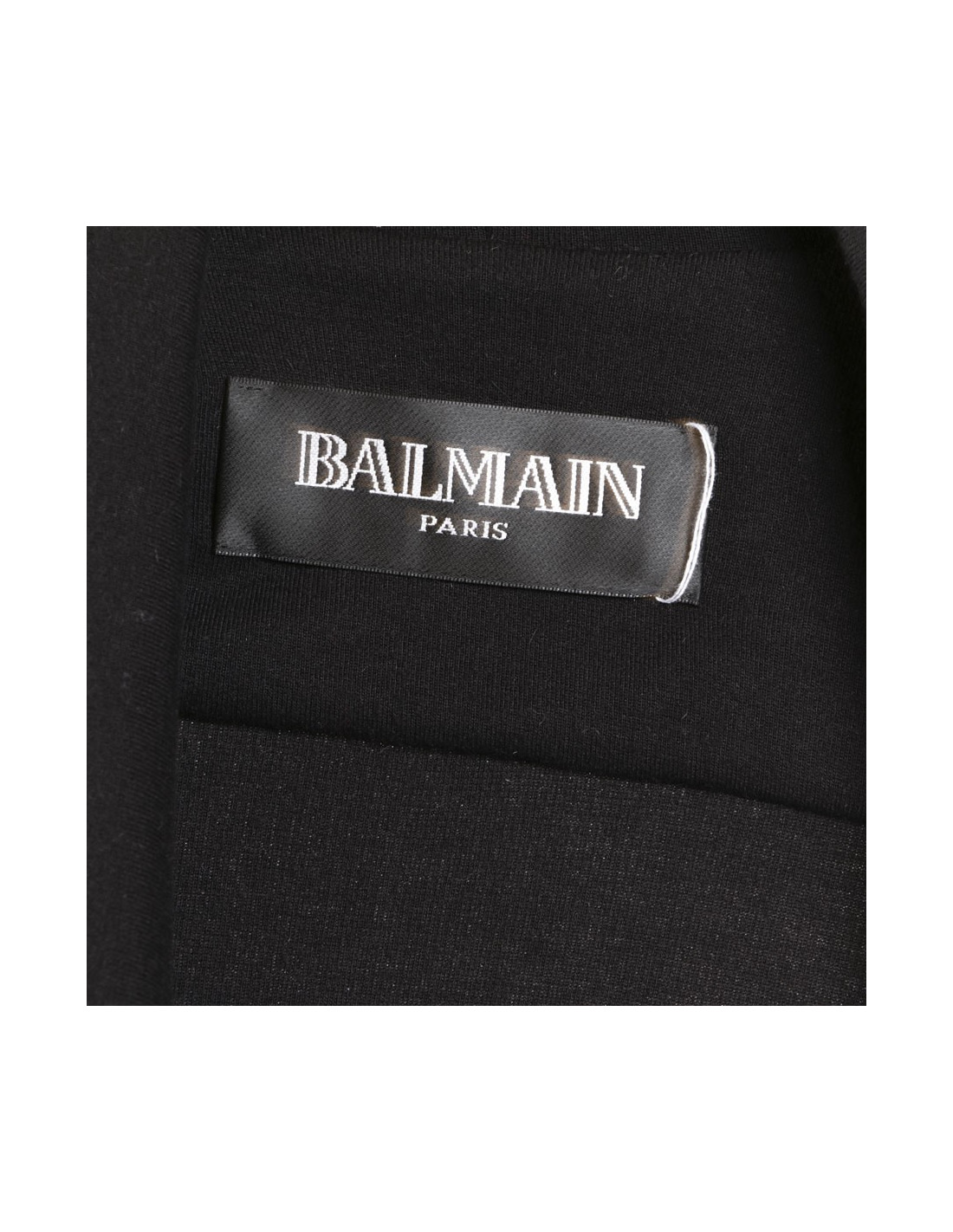 Long gilet ample noir BALMAIN avec des gros boutons dorés, représentant l'emblème ruse "Aigle". Les épaules sont matelassées.