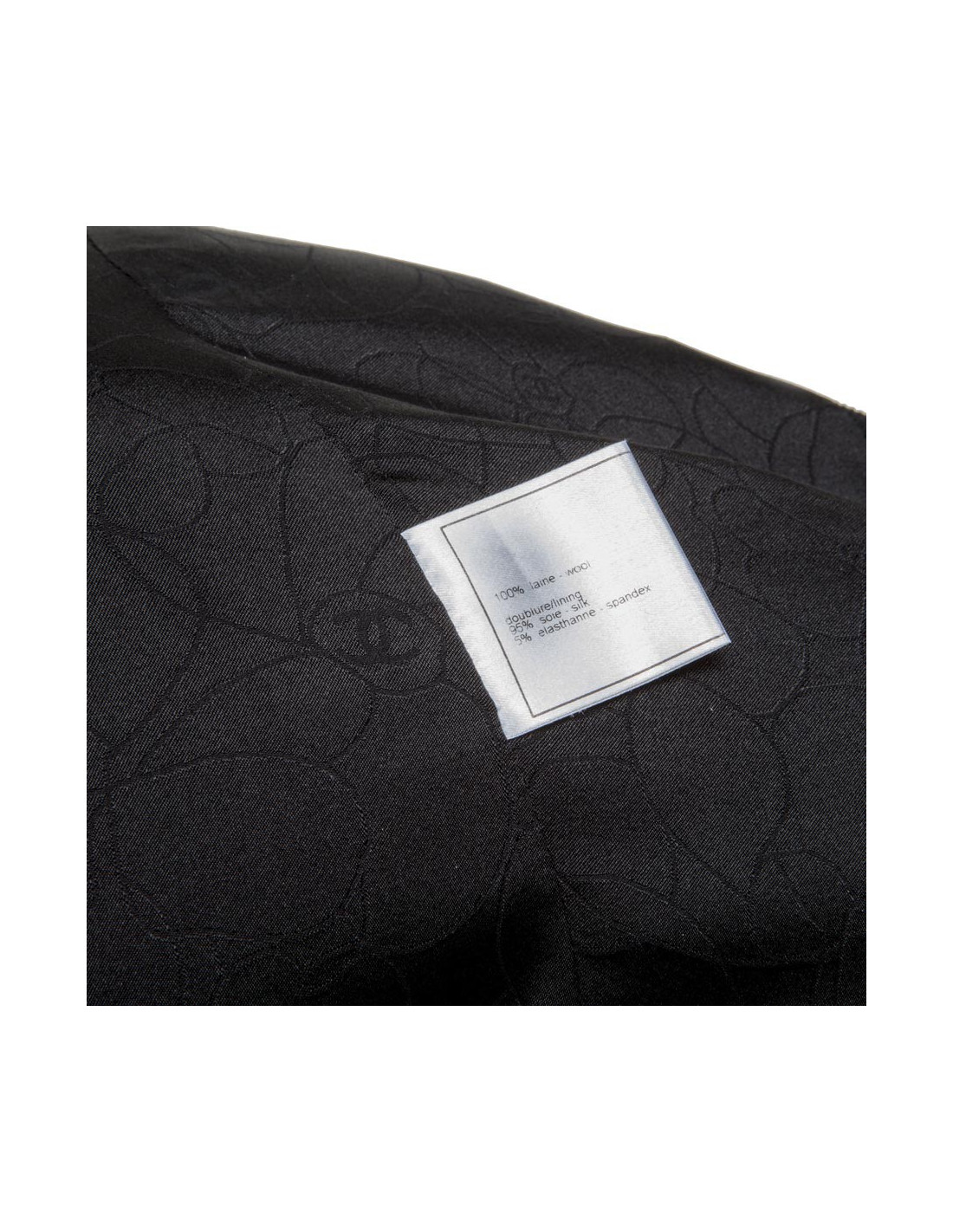Veste Chanel en laine noire taille 40. Ornée de boutons marqués "Chanel Paris", se ferme grâce à trois boutons en agrafe. L'intérieur de la veste, doublé de soie au monogramme Chanel, est bordé par une fine chaîne en argent. Elle comporte deux poches discrètes à l'avant.
