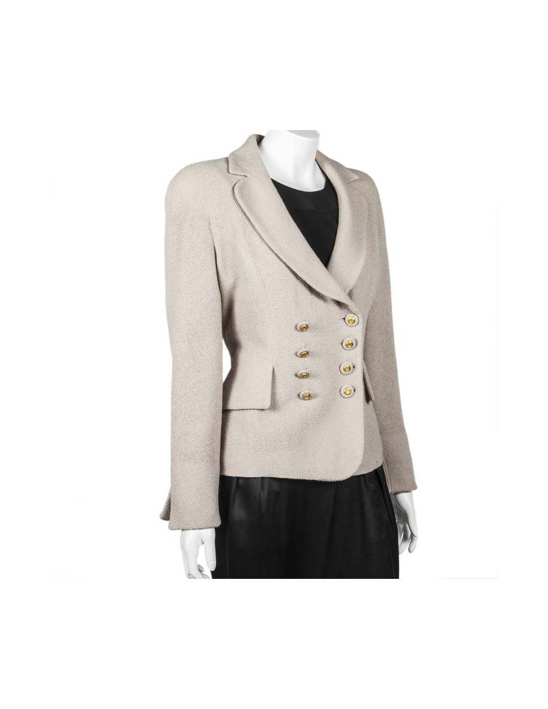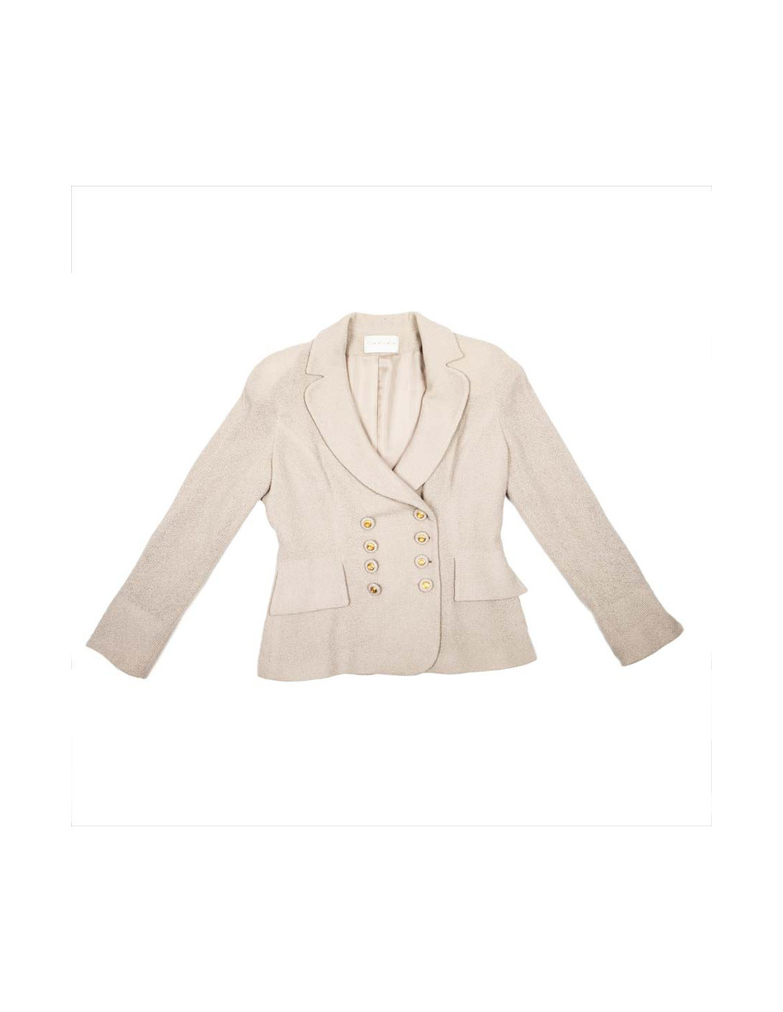 Veste en laine beige rosé Carven taille 40 FR. Doublée de soie beige, fermée par deux rangées de boutons ornés de sigles dorés "C". La veste est composée de deux fentes à l'arrière.