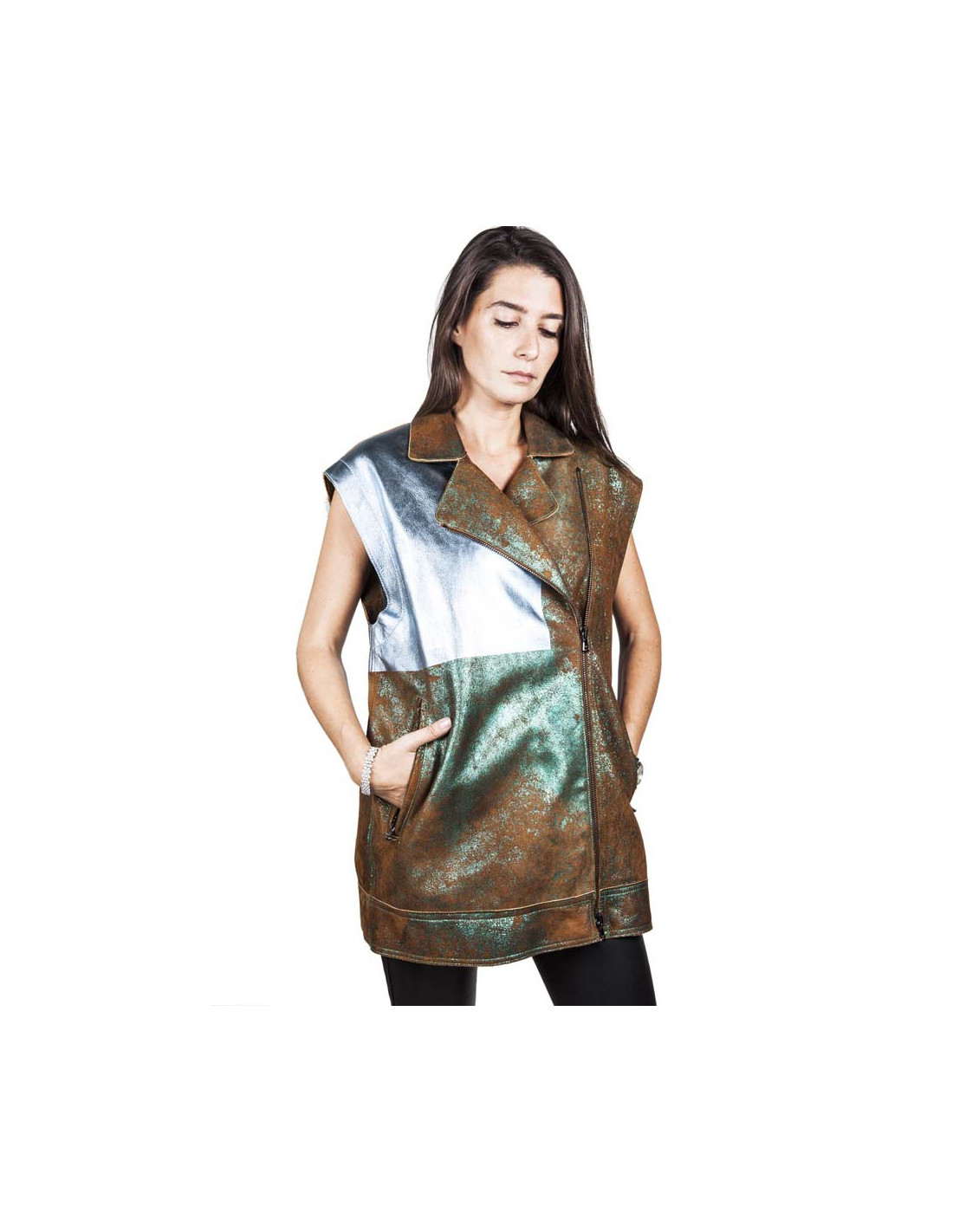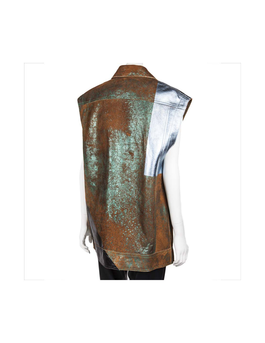 Veste ample en cuir sans manches à col croisé Phillip Lim taille 34. Composée de daim marron et turquoise ainsi que d'une partie en cuir grainé bleu irisé à l'avant et noire au dos. La veste est composée de deux poches zipées à l'avant, doublée de soie noire, col croisé côté gauche, se ferme grâce à un zip. Surpiqûres apparentes.