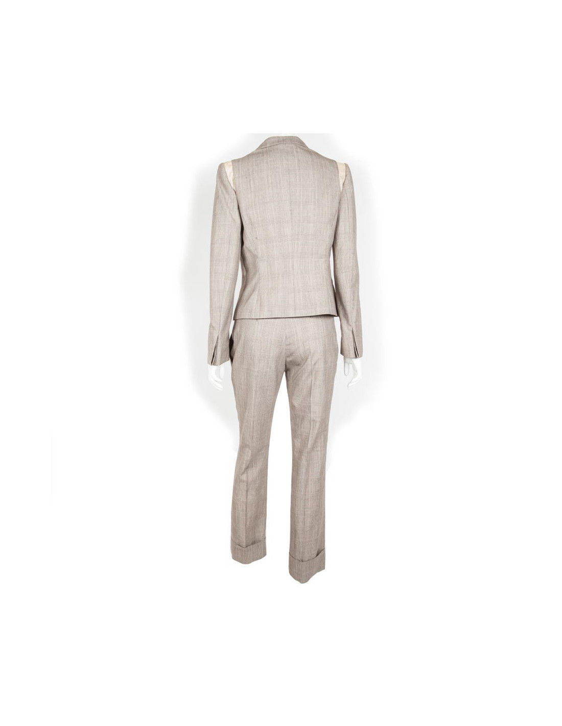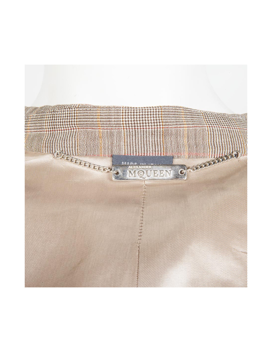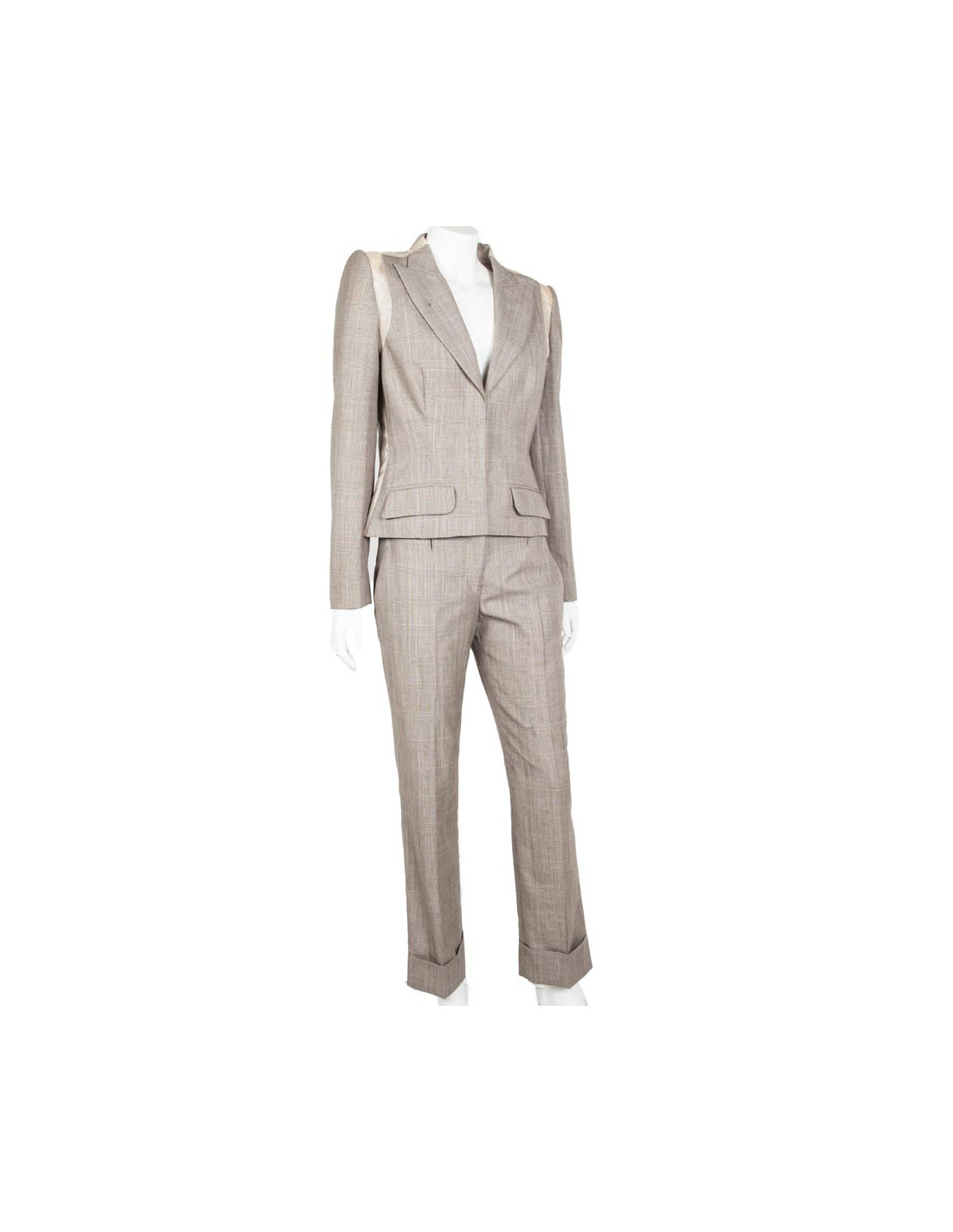 Ensemble tailleur beige en coton Alexander Mc Queen avec un motif Prince de Galles. La veste, taille 42 IT / 38 FR, est doublée de soie beige, apparente aux épaules. Se ferme grâce à une rangée de boutons dissimulés nacrés et une pression. Le pantalon, est lui aussi doublé de soie, composé de deux poches latérales et orné de revers de 7 cm. Fermeture zippée accompagnée d'une agrafe, contient des passants de ceinture discrets. Il est en bon