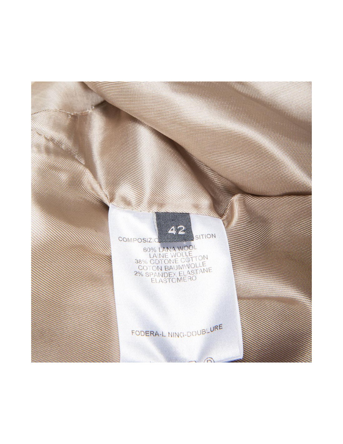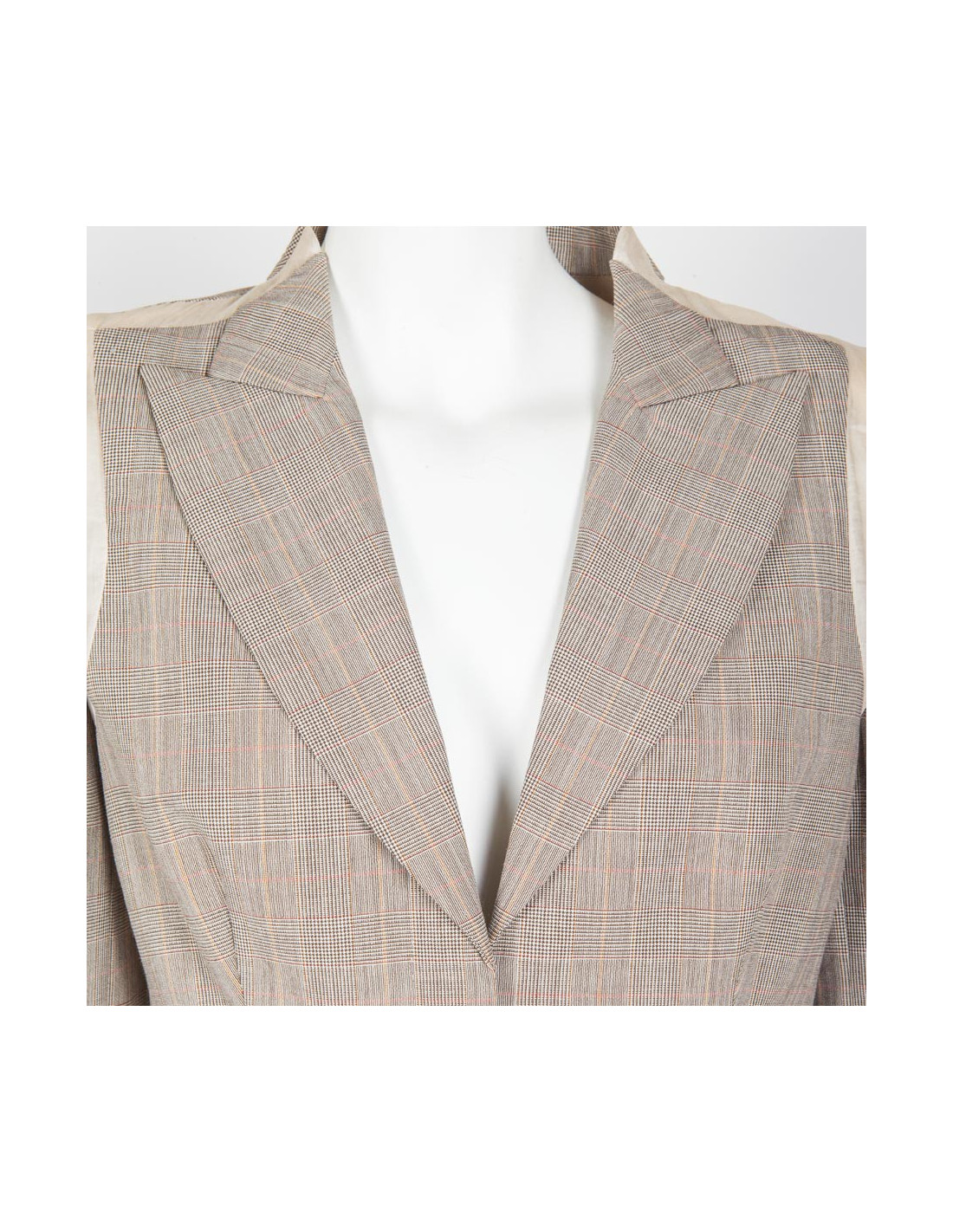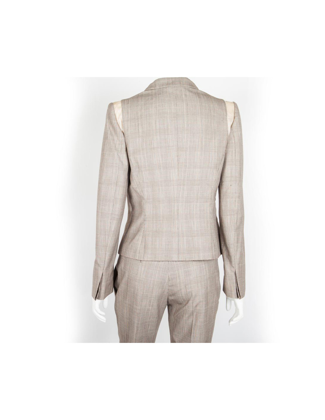 Ensemble tailleur beige en coton Alexander Mc Queen avec un motif Prince de Galles. La veste, taille 42 IT / 38 FR, est doublée de soie beige, apparente aux épaules. Se ferme grâce à une rangée de boutons dissimulés nacrés et une pression. Le pantalon, est lui aussi doublé de soie, composé de deux poches latérales et orné de revers de 7 cm. Fermeture zippée accompagnée d'une agrafe, contient des passants de ceinture discrets. Il est en bon