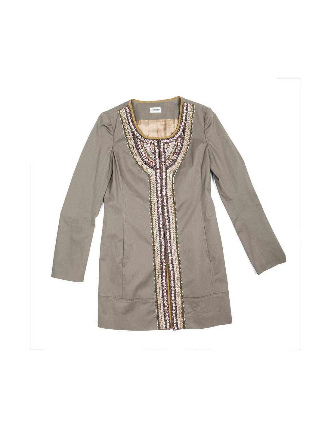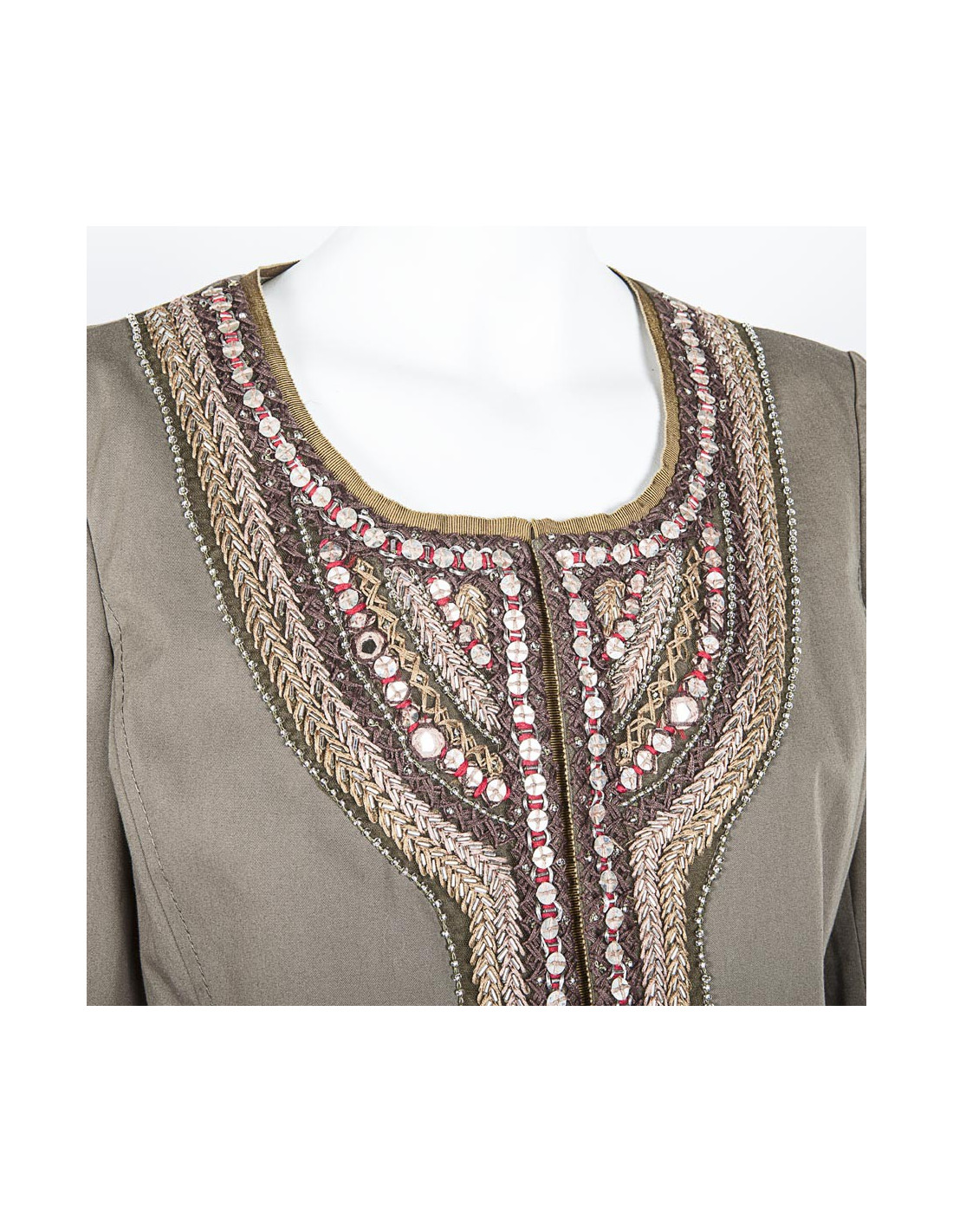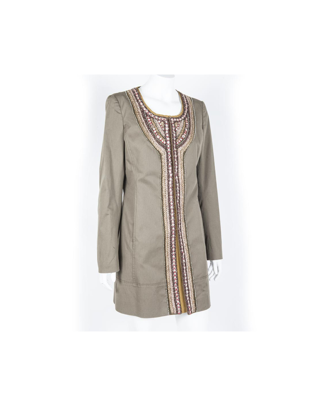 Veste longue en coton vert Kaki Alberta Ferreti, correspond à un 38 FR. Col brodé main de perles et sequins, doublée de soie marron, coupe cintrée, composée de deux poches latérales discrètes. En très bon état.