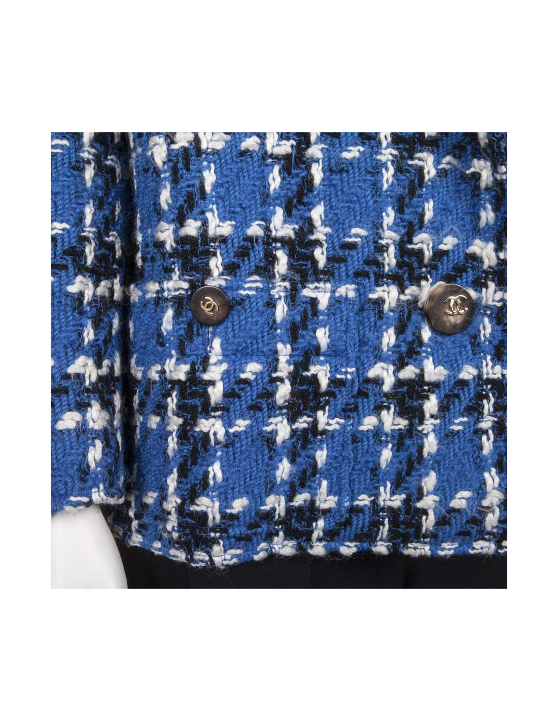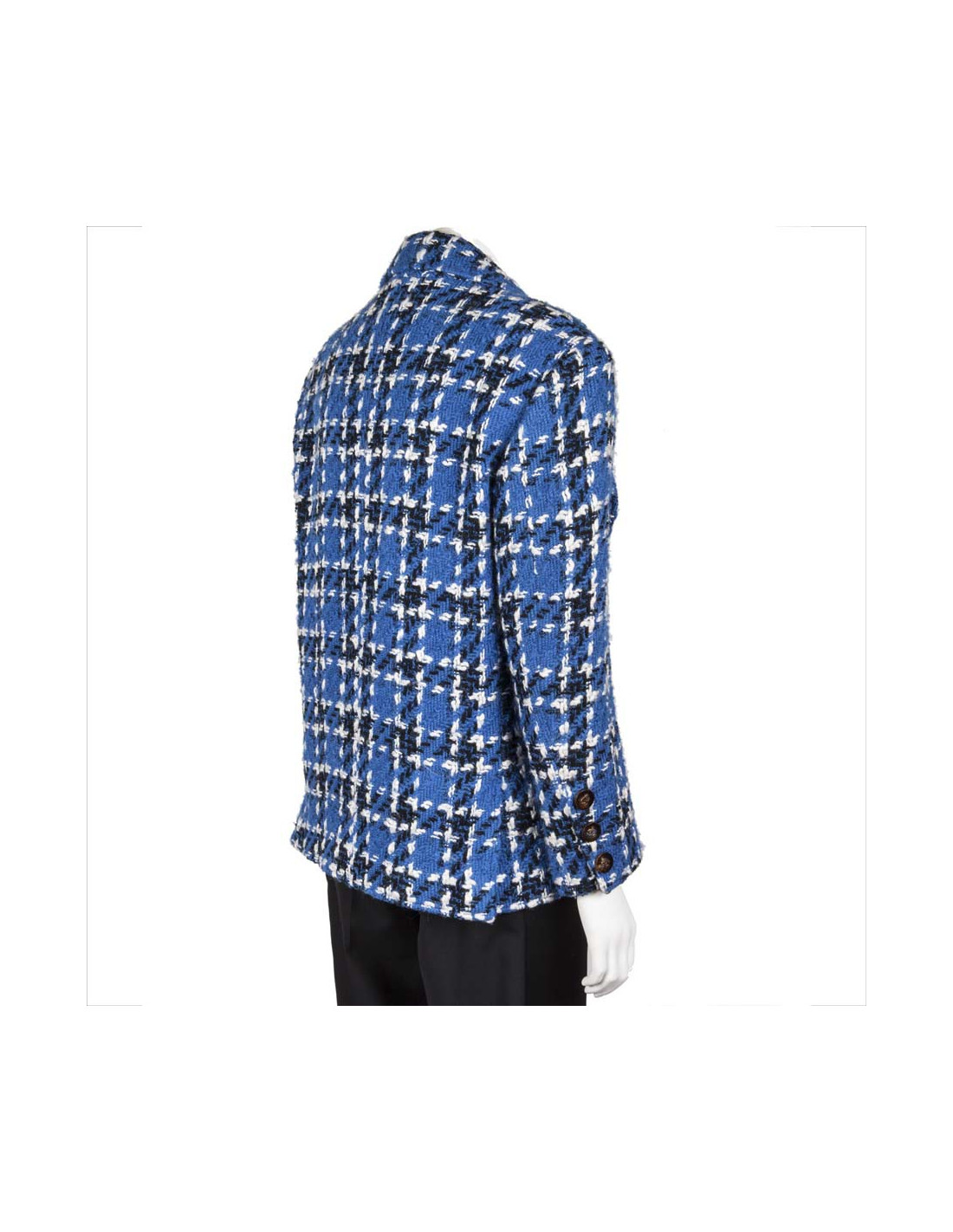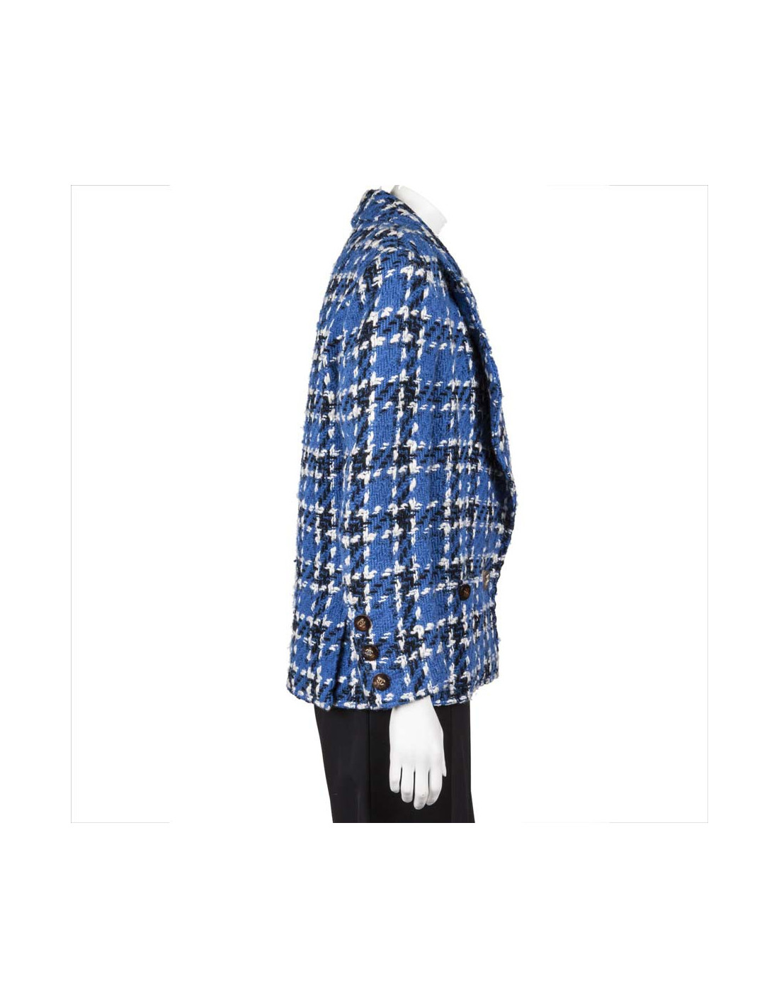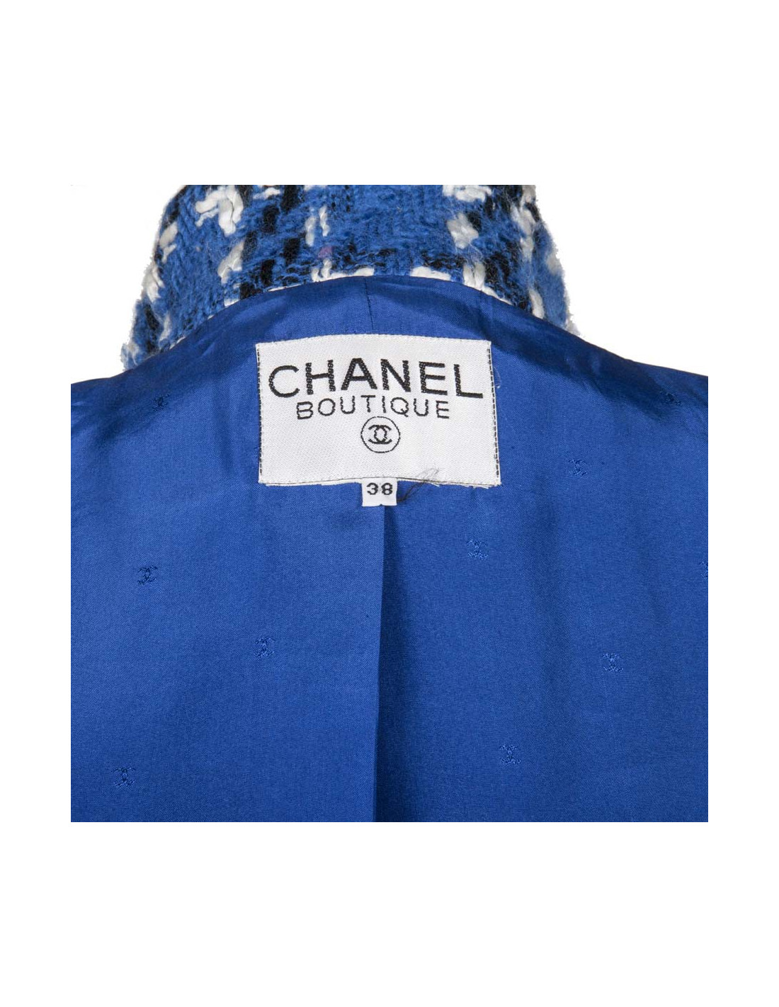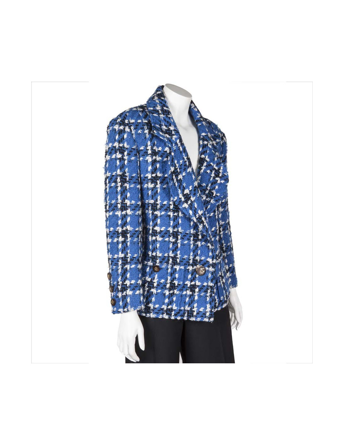 Vintage. Veste large en tweed bleu, noir, et blanc Chanel taille 44FR (pas d'étiquette de taille. Composée de trois poches, boutons de nacre marron au sigle doré double CC, deux fentes à l'arrière, doublée de soie bleu monogram;
