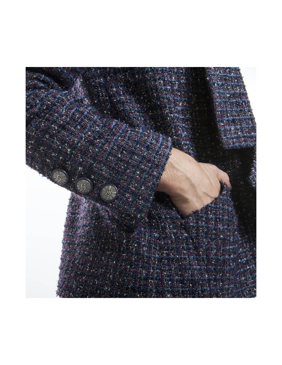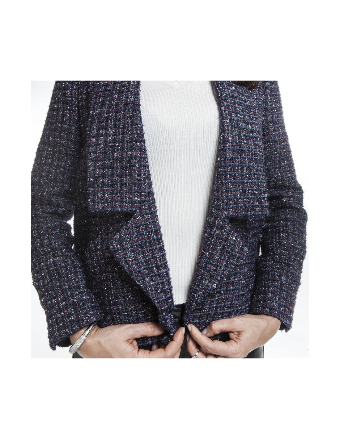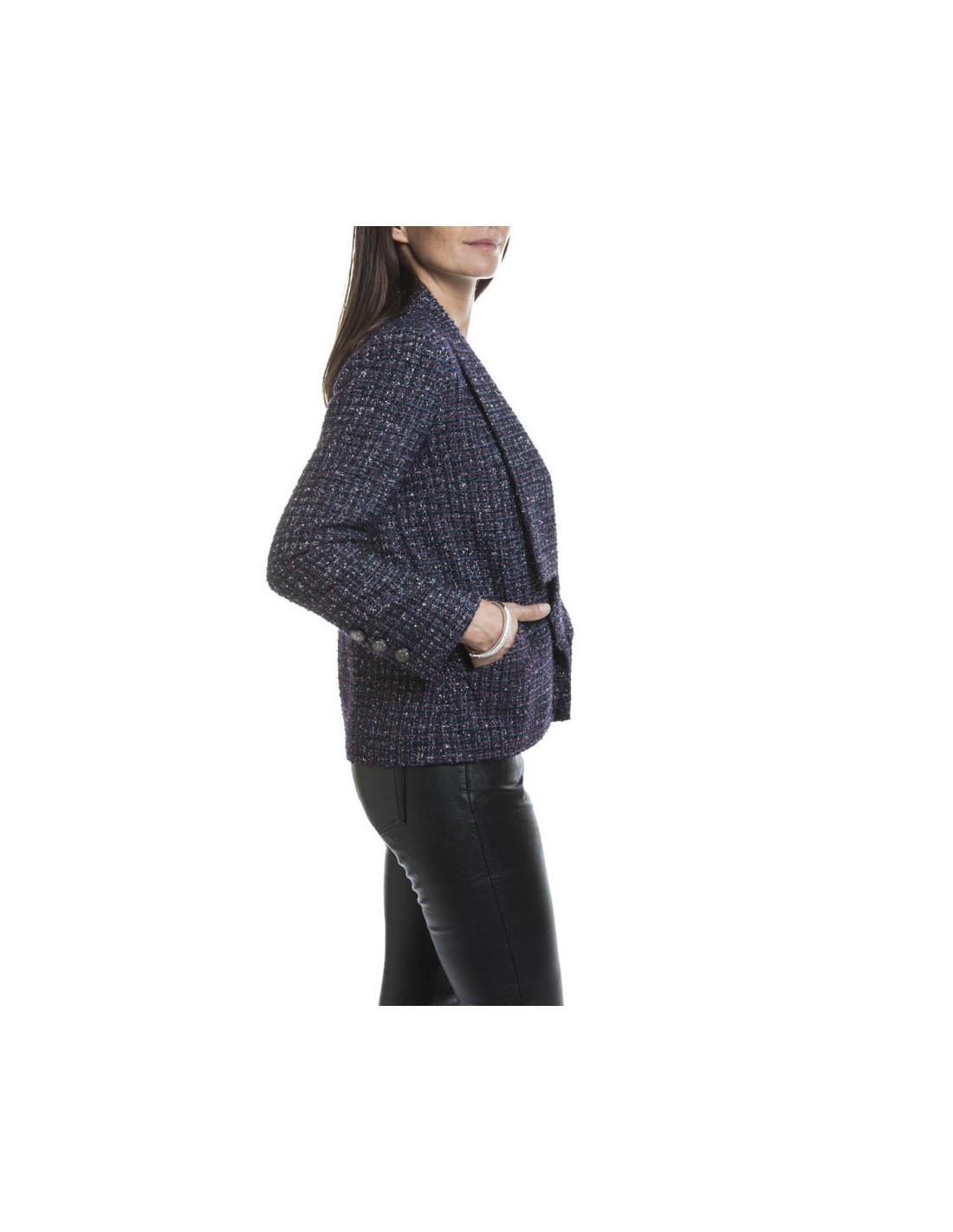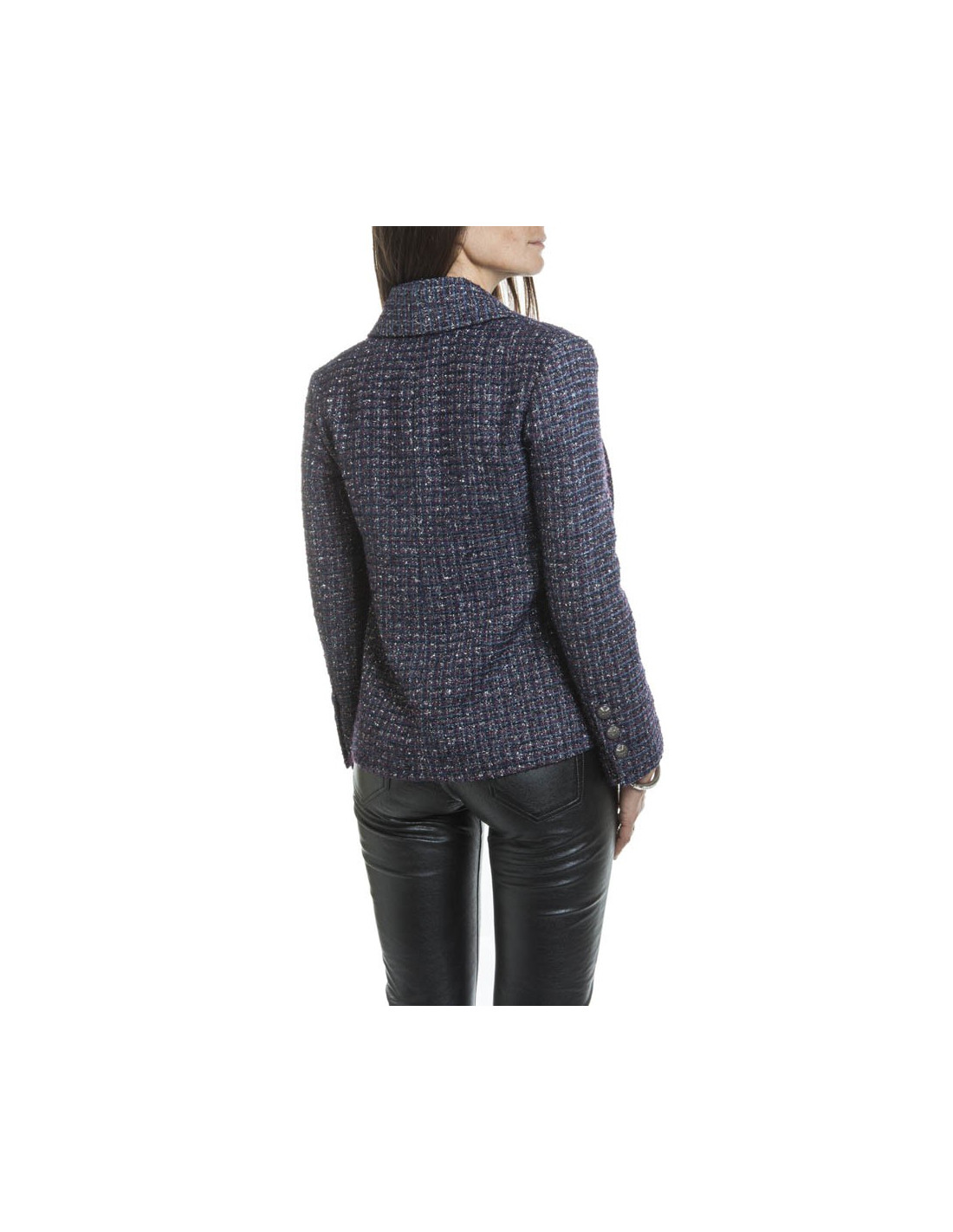 Veste de la Maison Chanel en tweed avec un dégradé de couleurs : bleu marine, violet, noir et fils d'argent. Ne se ferme pas. Deux poches en biais de chaque côté. Doublure bleu marine camélias en soie. En très bon état.