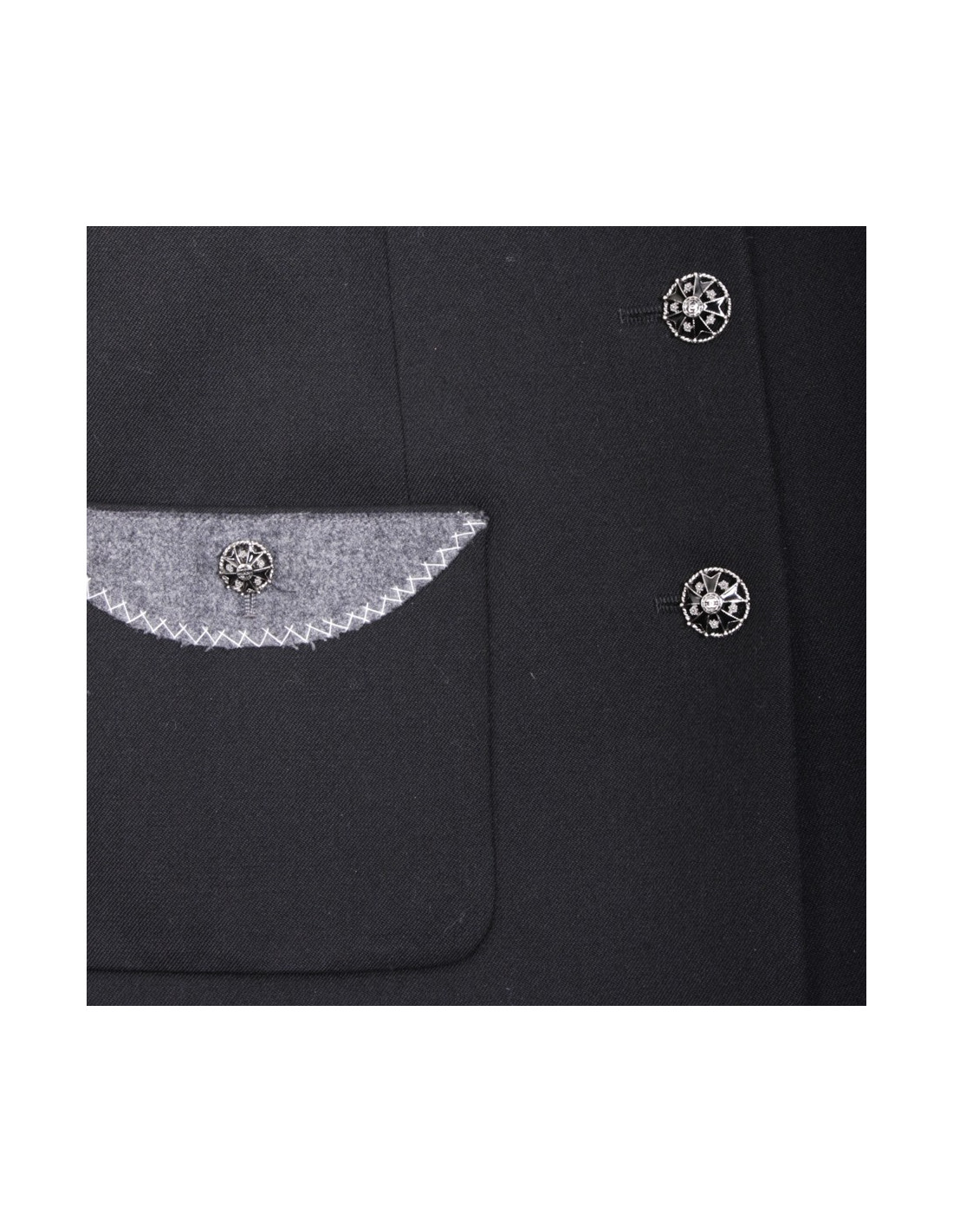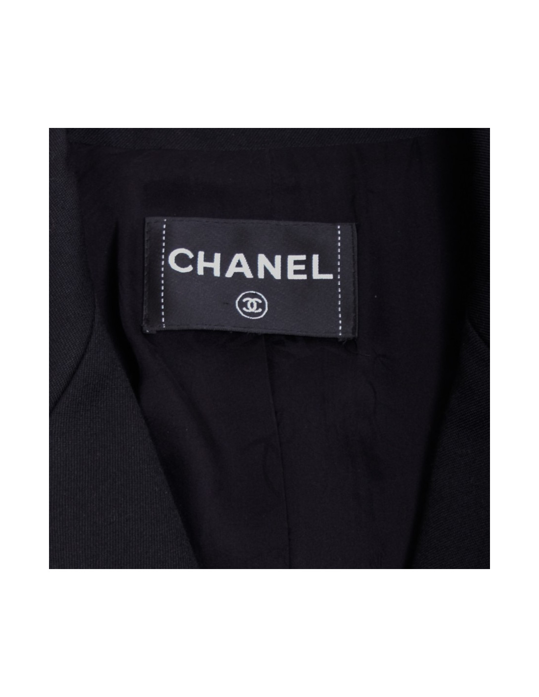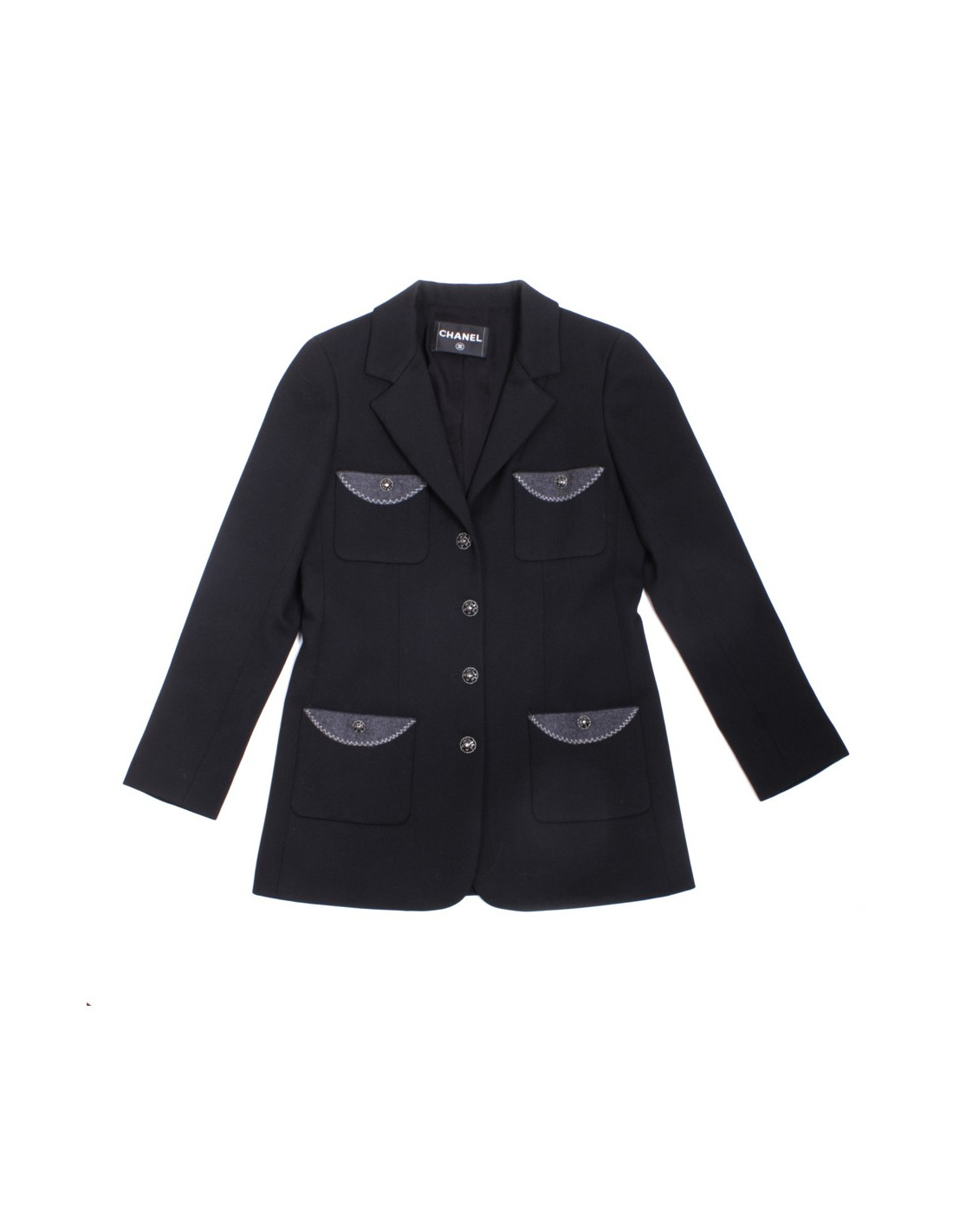 Veste Chanel en laine noire en très bon état avec 4 poches à l'avant et un revers appliqué en laine grise.