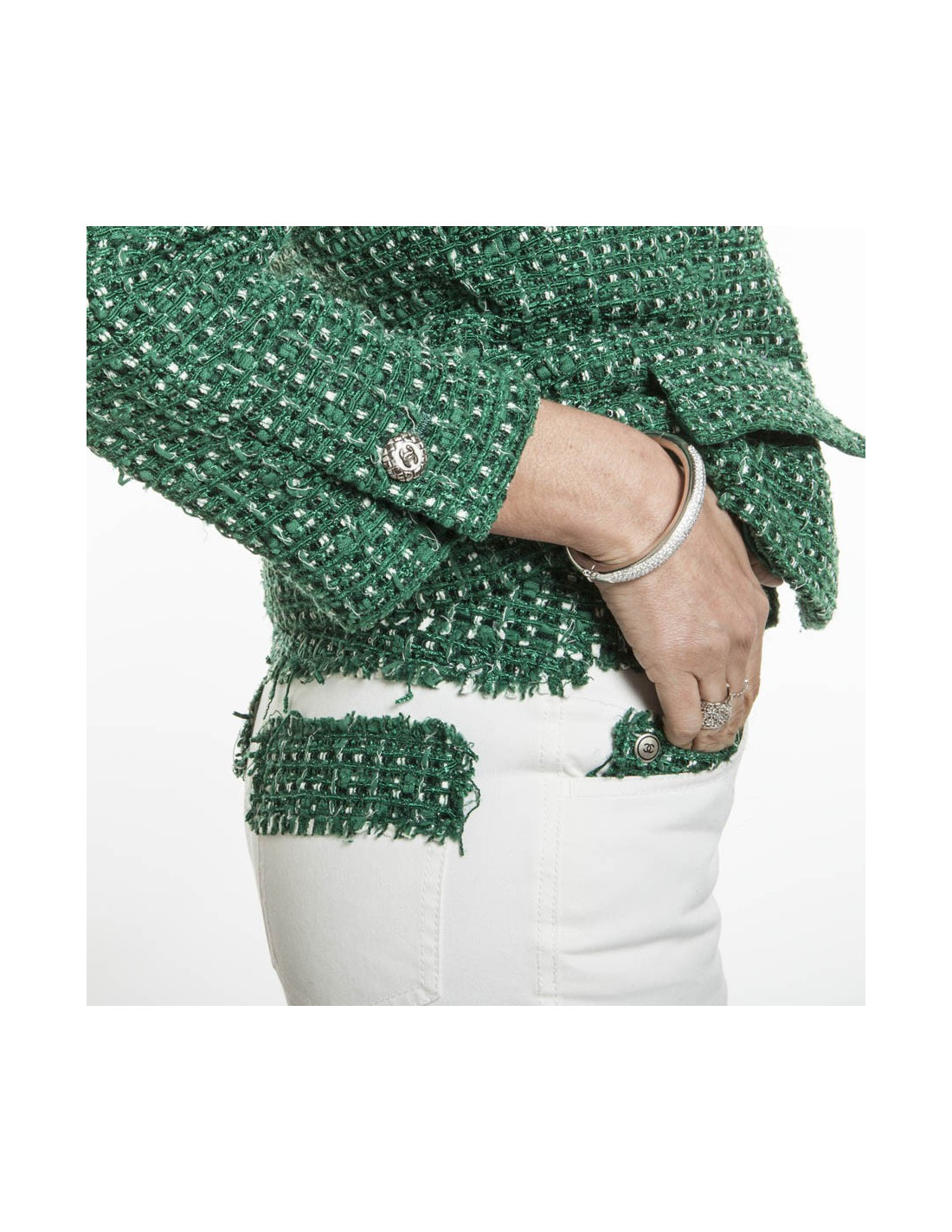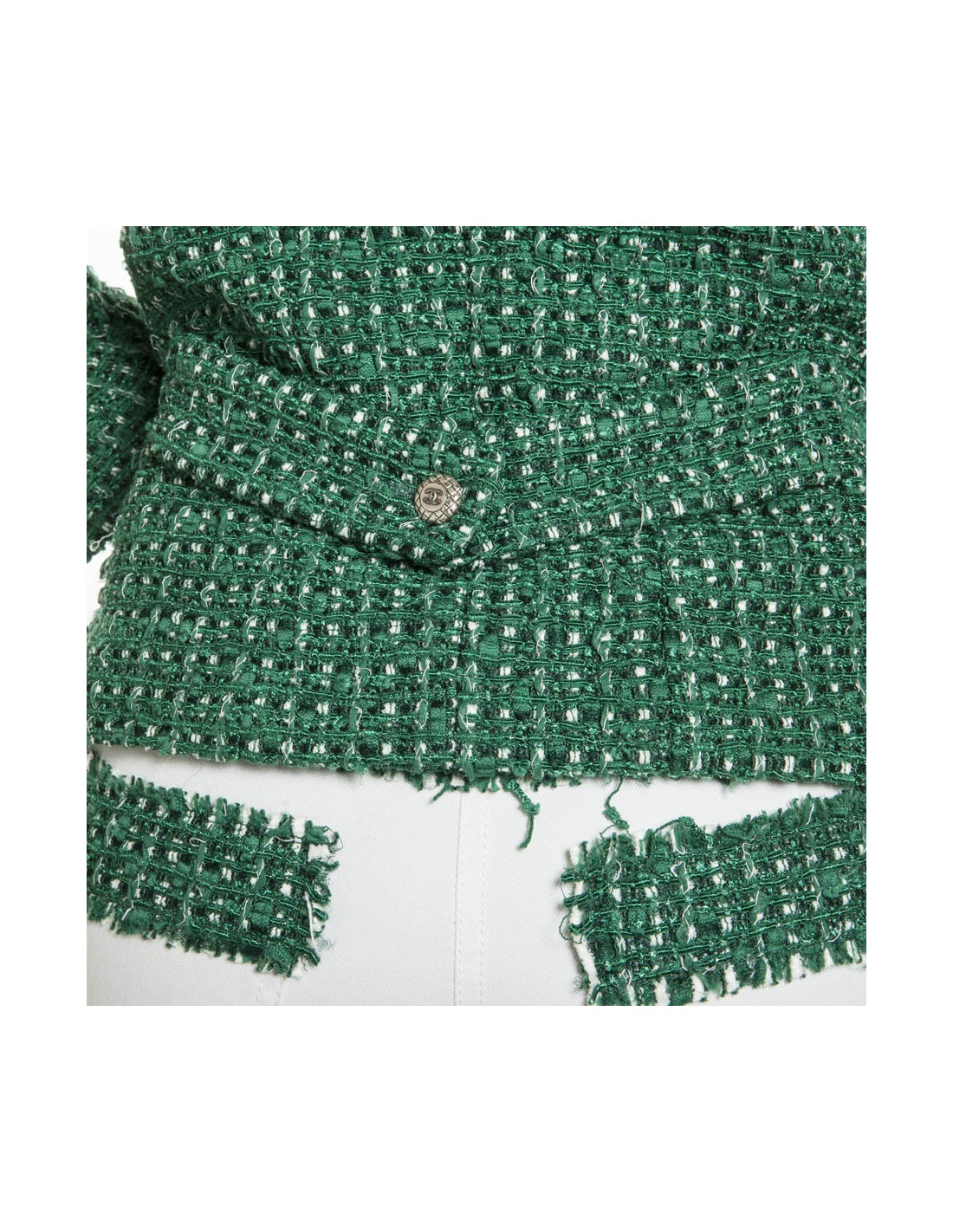 Superbe ensemble CHANEL en tweed vert et jean blanc.