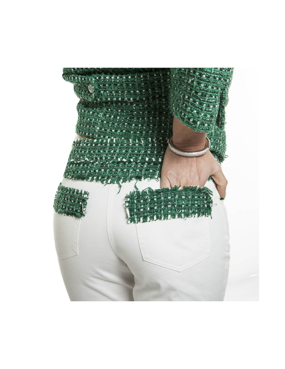 Le pantalon est en jean blanc gansé de tweed vert comme la veste au niveau de la taille et sur les poches. L'ensemble est en parfait état.