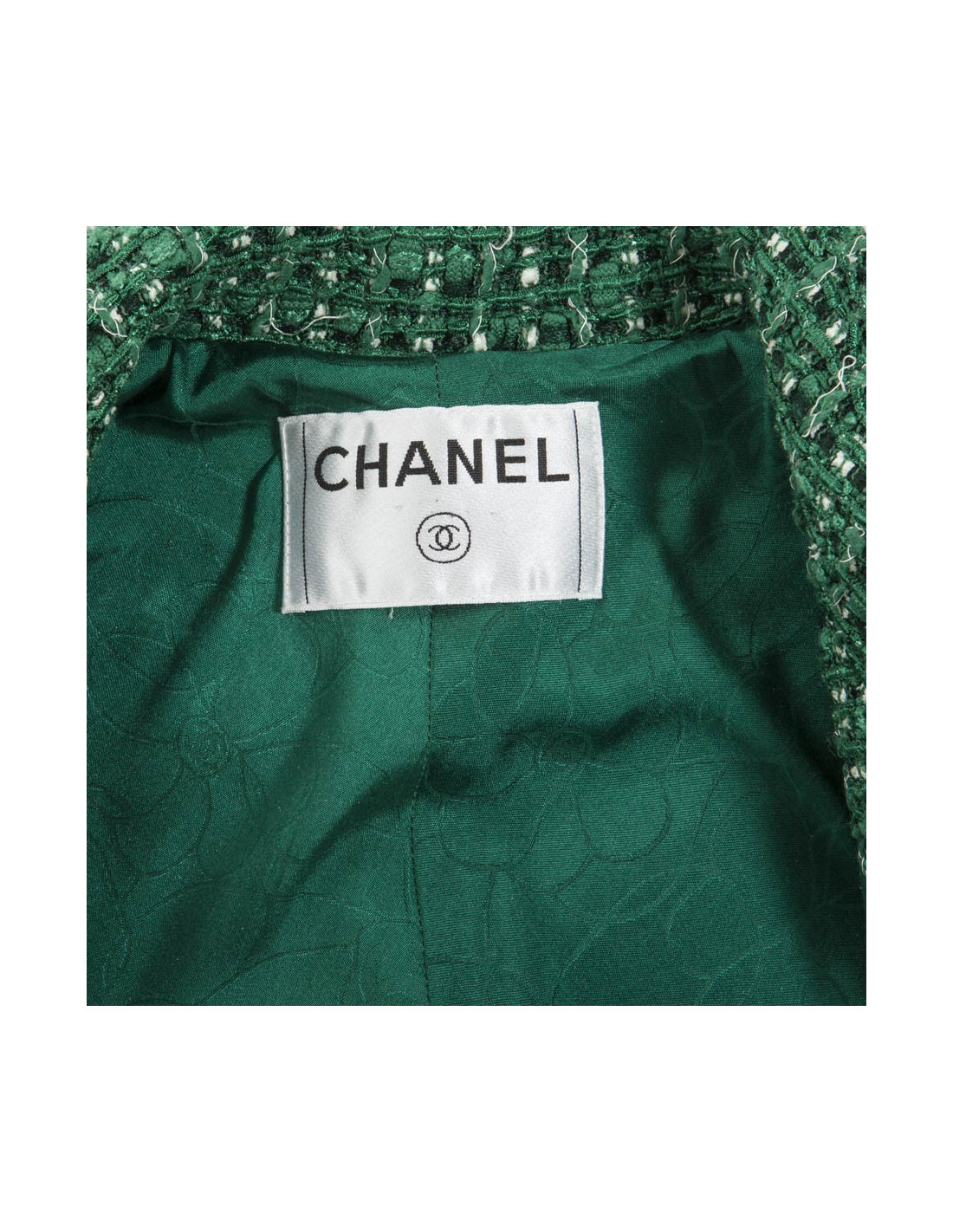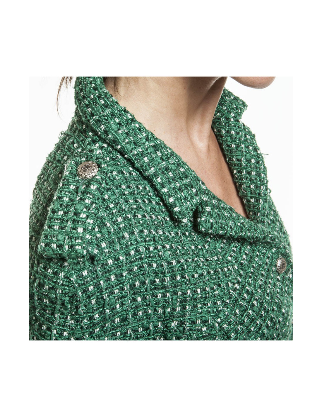 La veste est en tweed de coton vert et blanc, elle se ferme à l'avant à l'aide de 5 boutons en métal argenté et émaillé.La doublure est en soie verte monogramme.