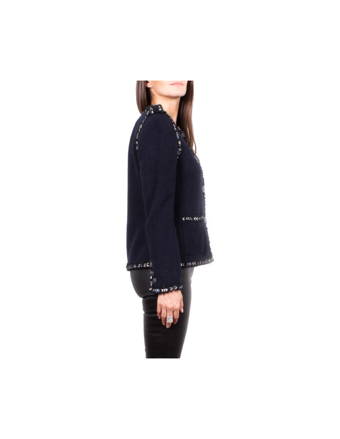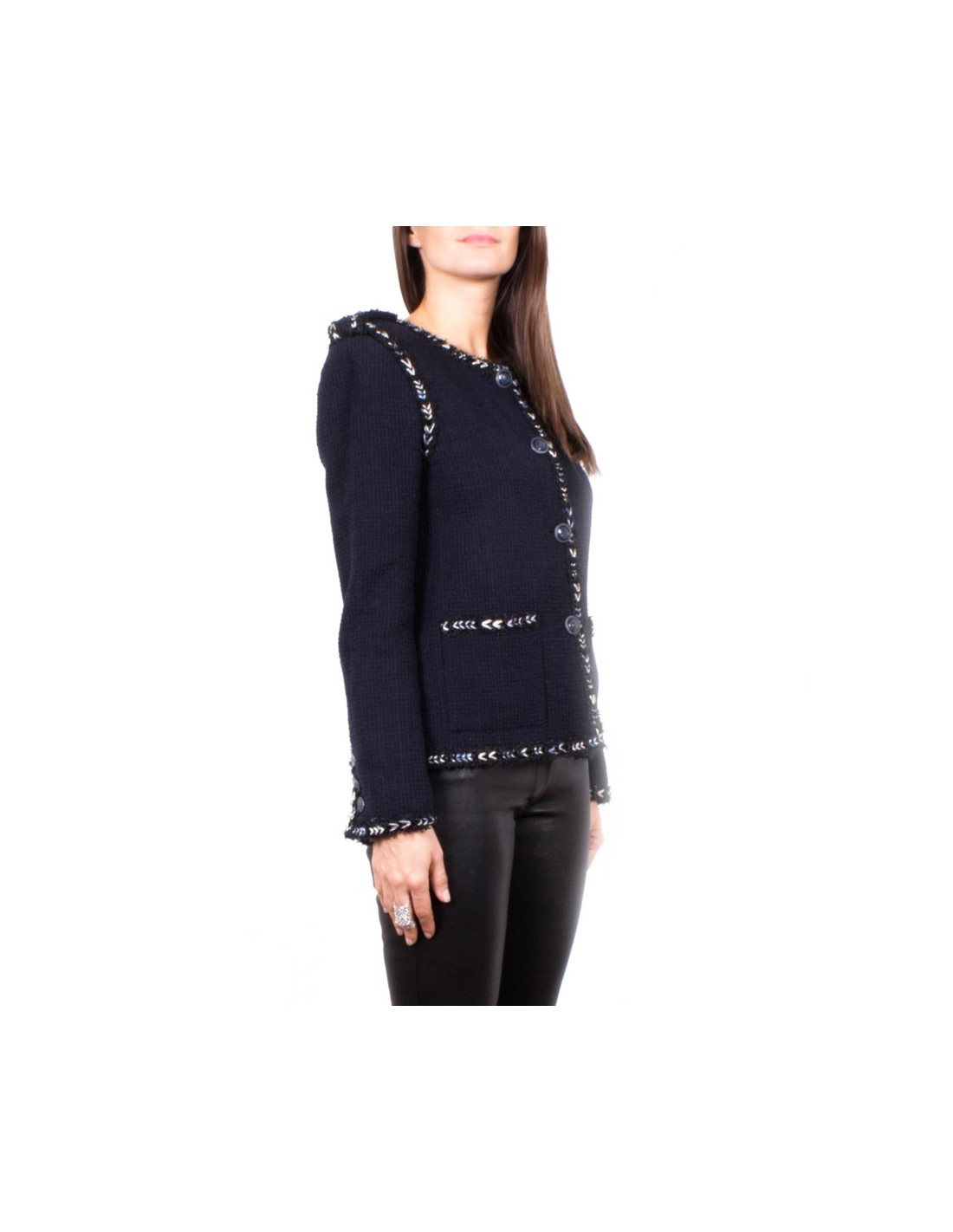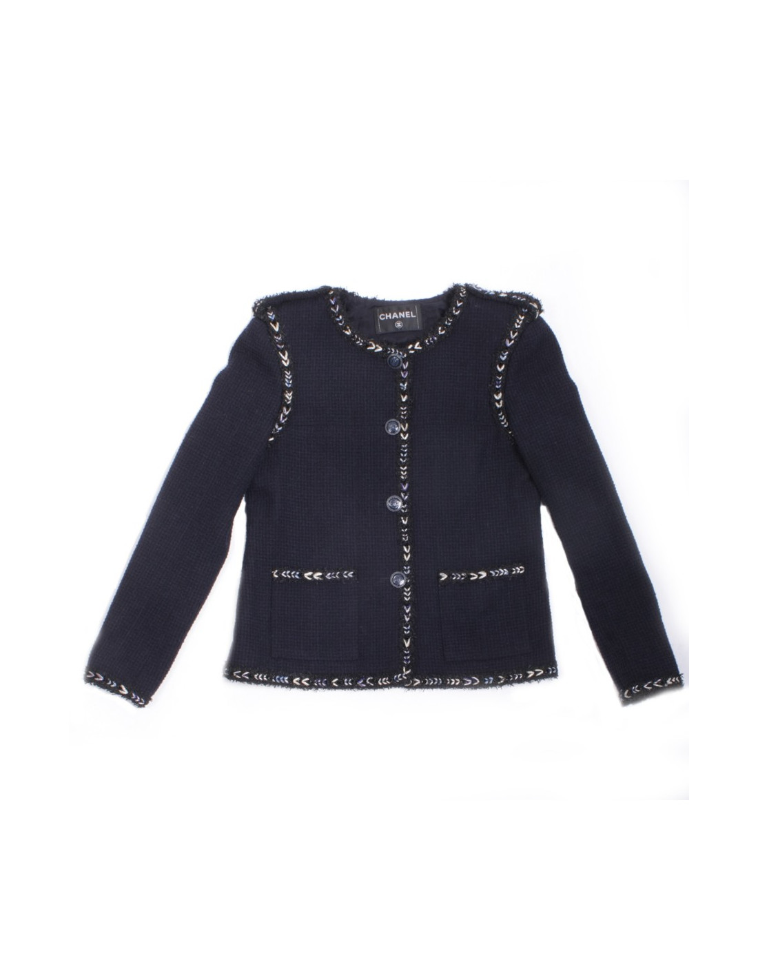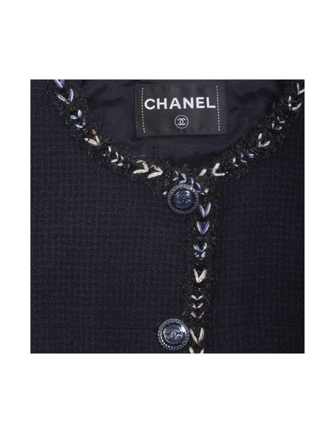 Elegante veste Chanel en tweed bleu marine en très bon état gansée de liseret tressé de fils noir et de lurex blanc, or, argent et bleu.