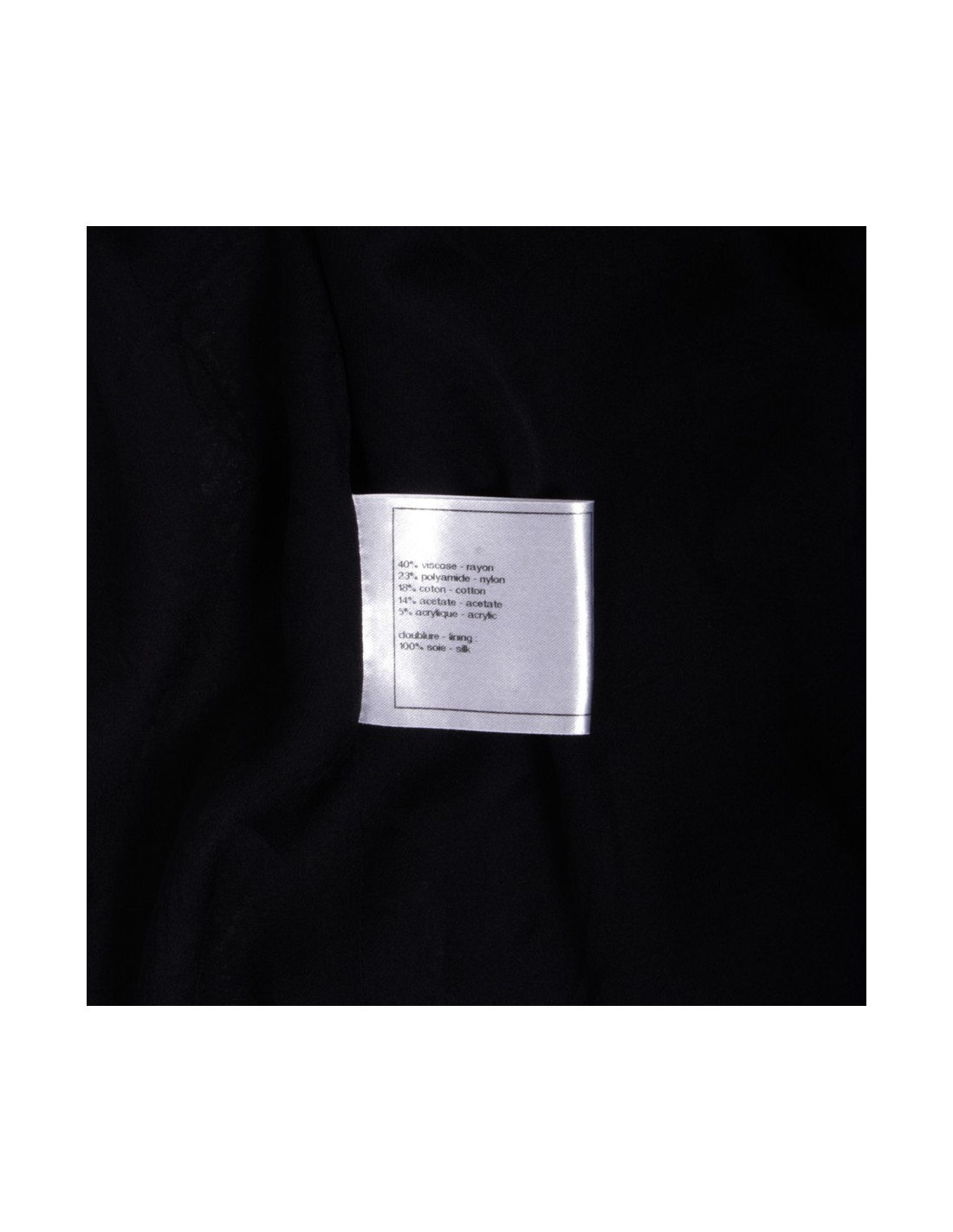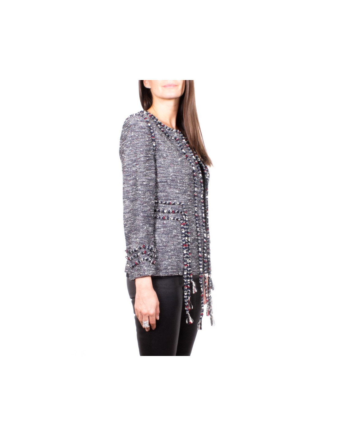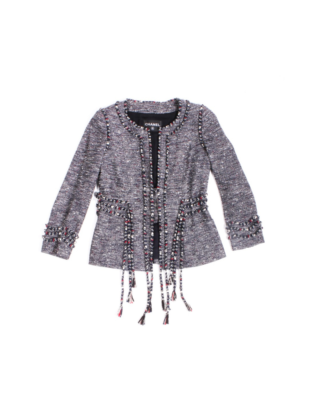 Magnifique veste Chanel en tweed noir, blanc, bleu marine et rouge, gansée de cordes fines dans la même matière ton sur ton, en très bon état, taille 38.