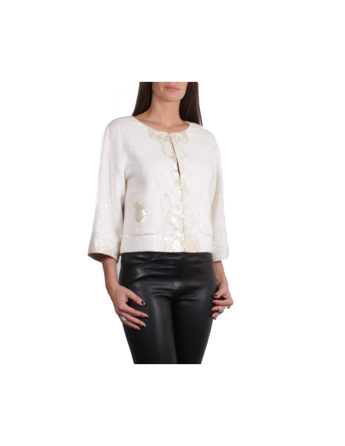 Karl Lagerfeld redoublait d'imagination à chaque nouvelle collection. Veste Chanel des Métiers d'art "Les fonds marins" défilé été 2012, de couleur ivoire entièrement brodée de fines paillettes irisées avec applications à motifs marins en nacre sur l'avant et sur les 2 poches appliquées sur les côtés. les manches sont 3/4. La doublure est en soie monogramme ivoire.