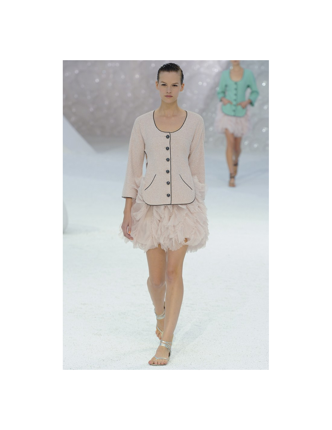 La veste est en tweed de coton rose pâle gansée d'un liseret fin noir, les manches sont 3/4 et les boutons sont en résine façon métal martelé palladium siglés CC.