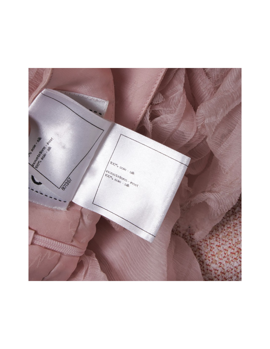 la jupe est en mousseline de soie rose pâle à multiples volants verticaux qui lui donnent un joli effet bouffant.