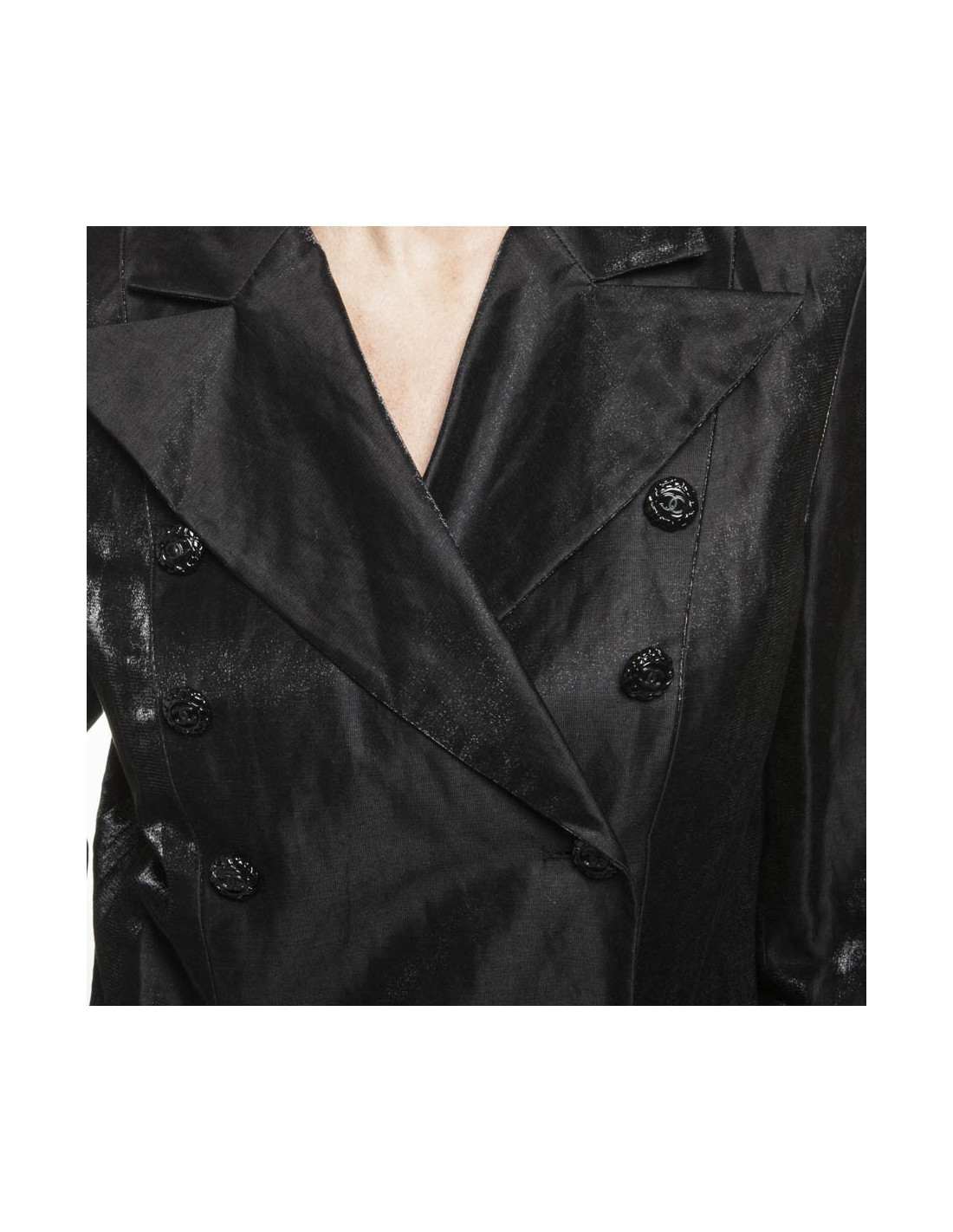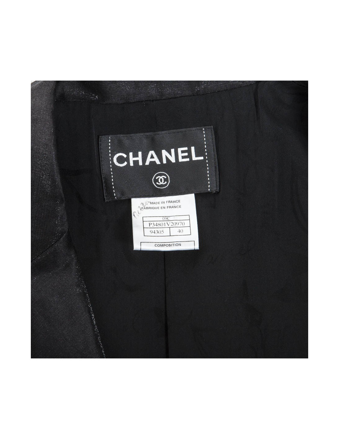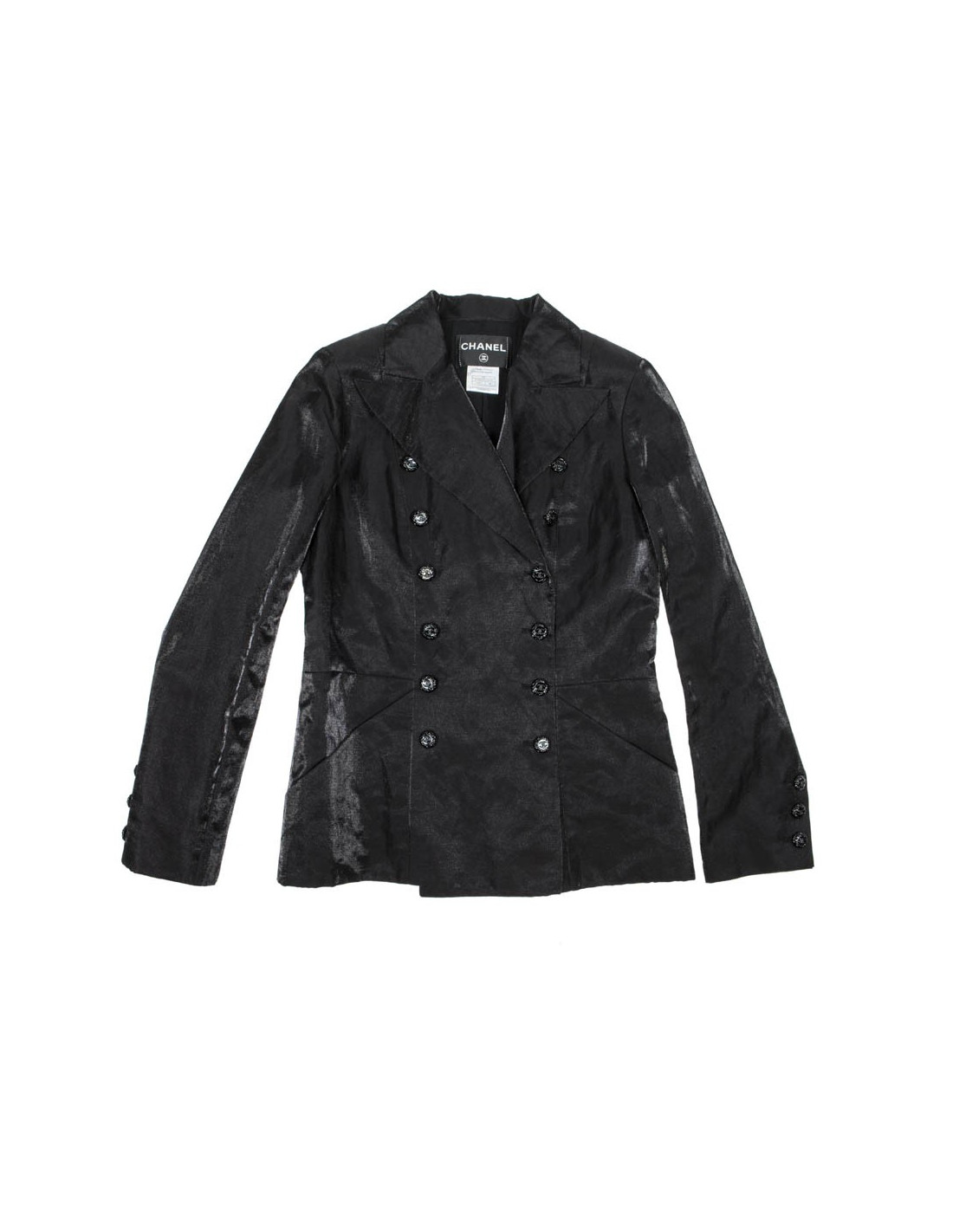 Blazer croisé Chanel, très chic, noir et brillant. Idéal dans son dressing. Il se porte aussi bien le jour qu'en soirée. les poignées ont de véritables boutonnières. Collection Croisière 2009-2010, taille 40 FR. En très bon état. Le défilé Croisière Paris-Miami a eu un véritable succès. Boutons noirs émaillés. Doublure en soie noire monogramme. Il a des poches fentes coupées en biais. Une particularité, cette veste est taillée près du corps et à l'arrière deux grands fentes boutonnées.