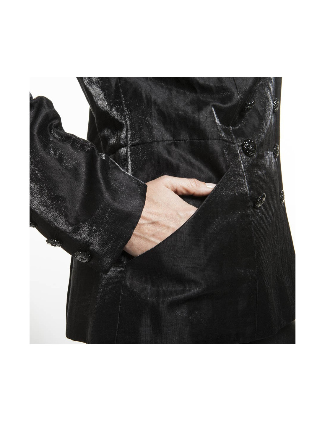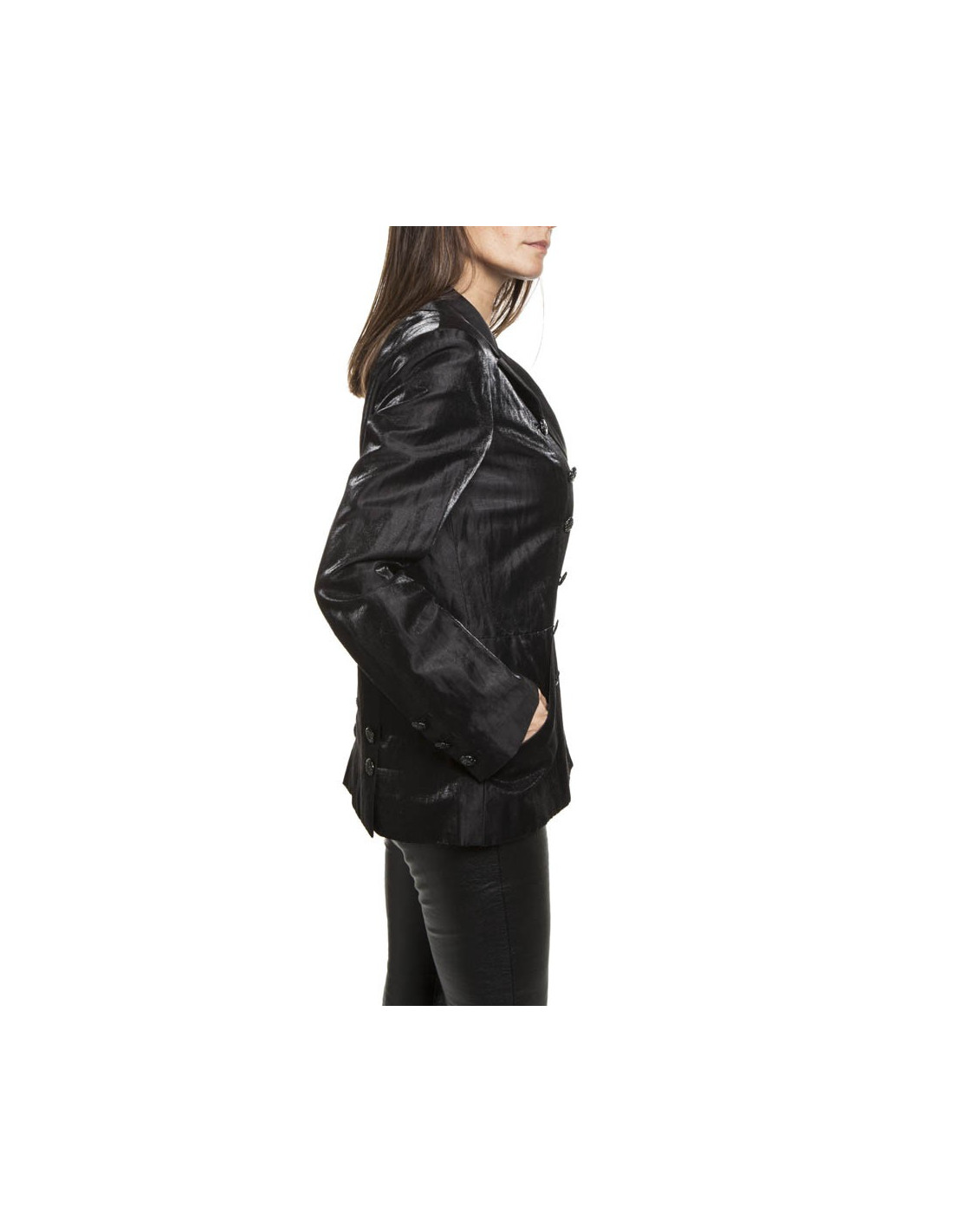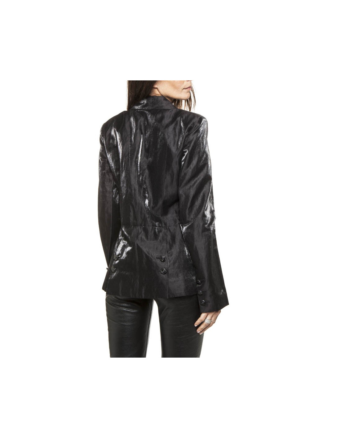 Blazer croisé Chanel, très chic, noir et brillant. Idéal dans son dressing. Il se porte aussi bien le jour qu'en soirée. les poignées ont de véritables boutonnières. Collection Croisière 2009-2010, taille 40 FR. En très bon état. Le défilé Croisière Paris-Miami a eu un véritable succès. Boutons noirs émaillés. Doublure en soie noire monogramme. Il a des poches fentes coupées en biais. Une particularité, cette veste est taillée près du corps et à l'arrière deux grands fentes boutonnées.