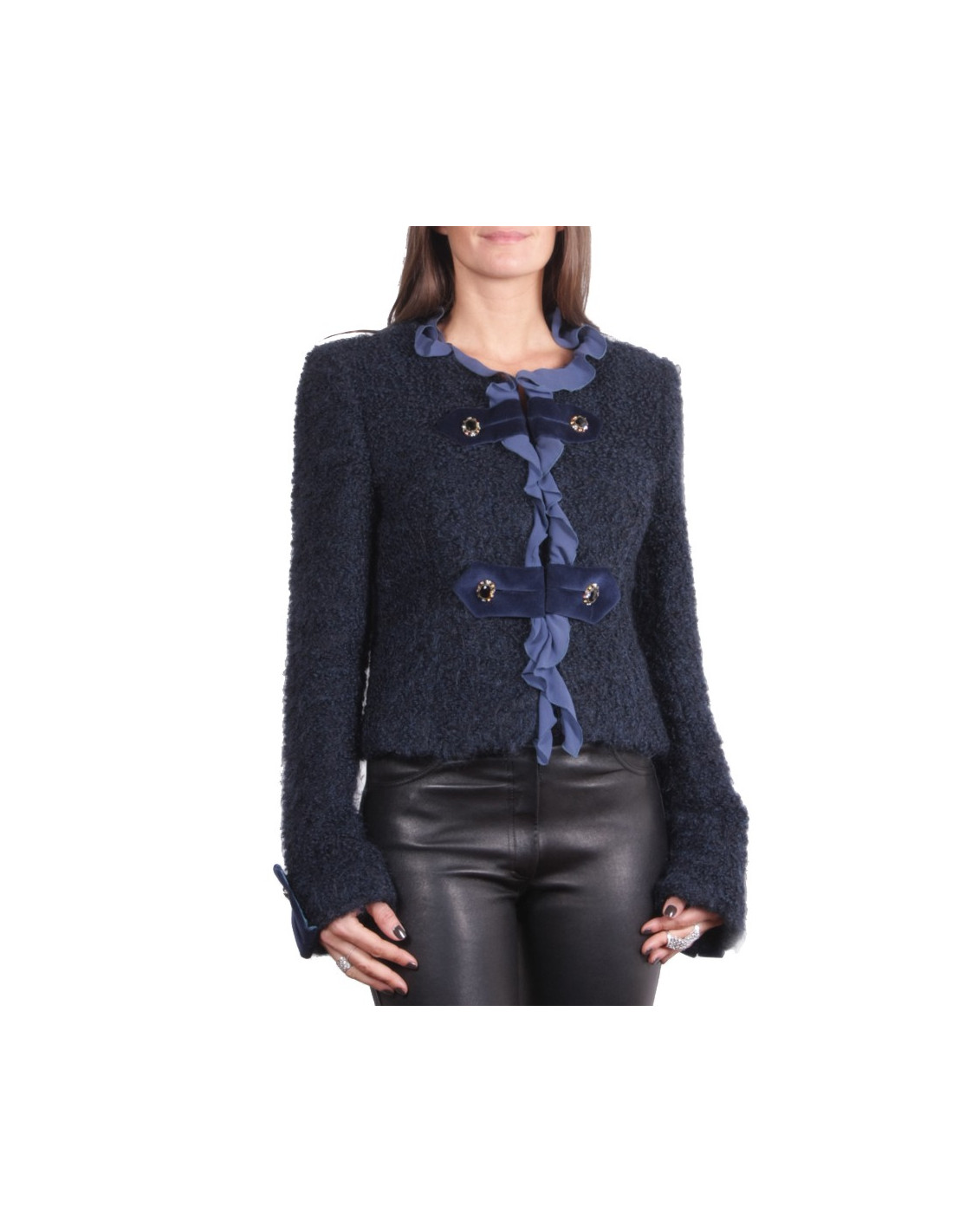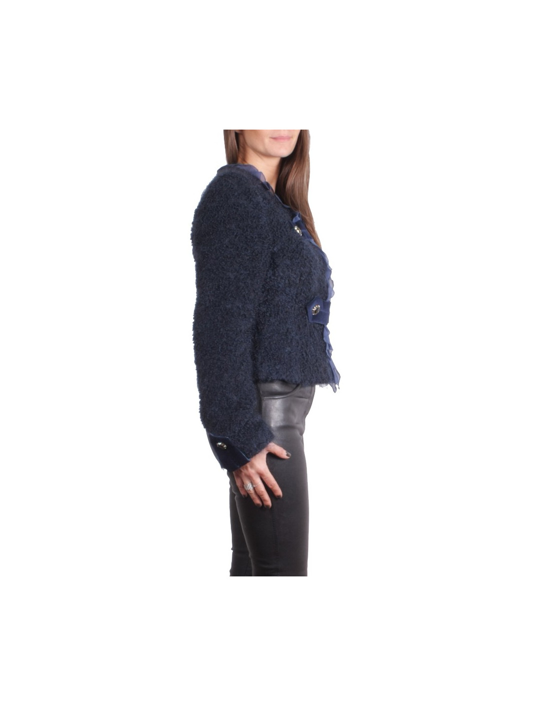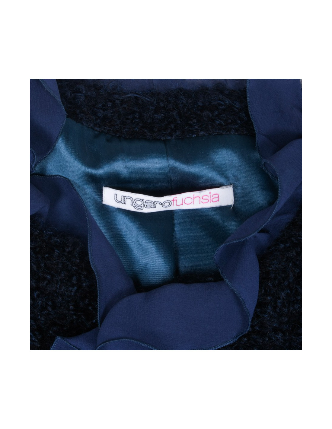 Veste UNGARO Fuchsia, en mohair et laine bleu nuit, gansée d'un volant de mousseline de soie bleu foncé; elle se ferme à l'aide de 2 agrafes invisibles.