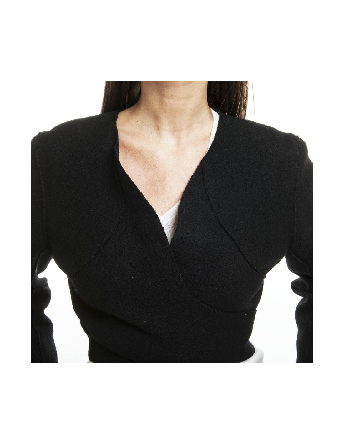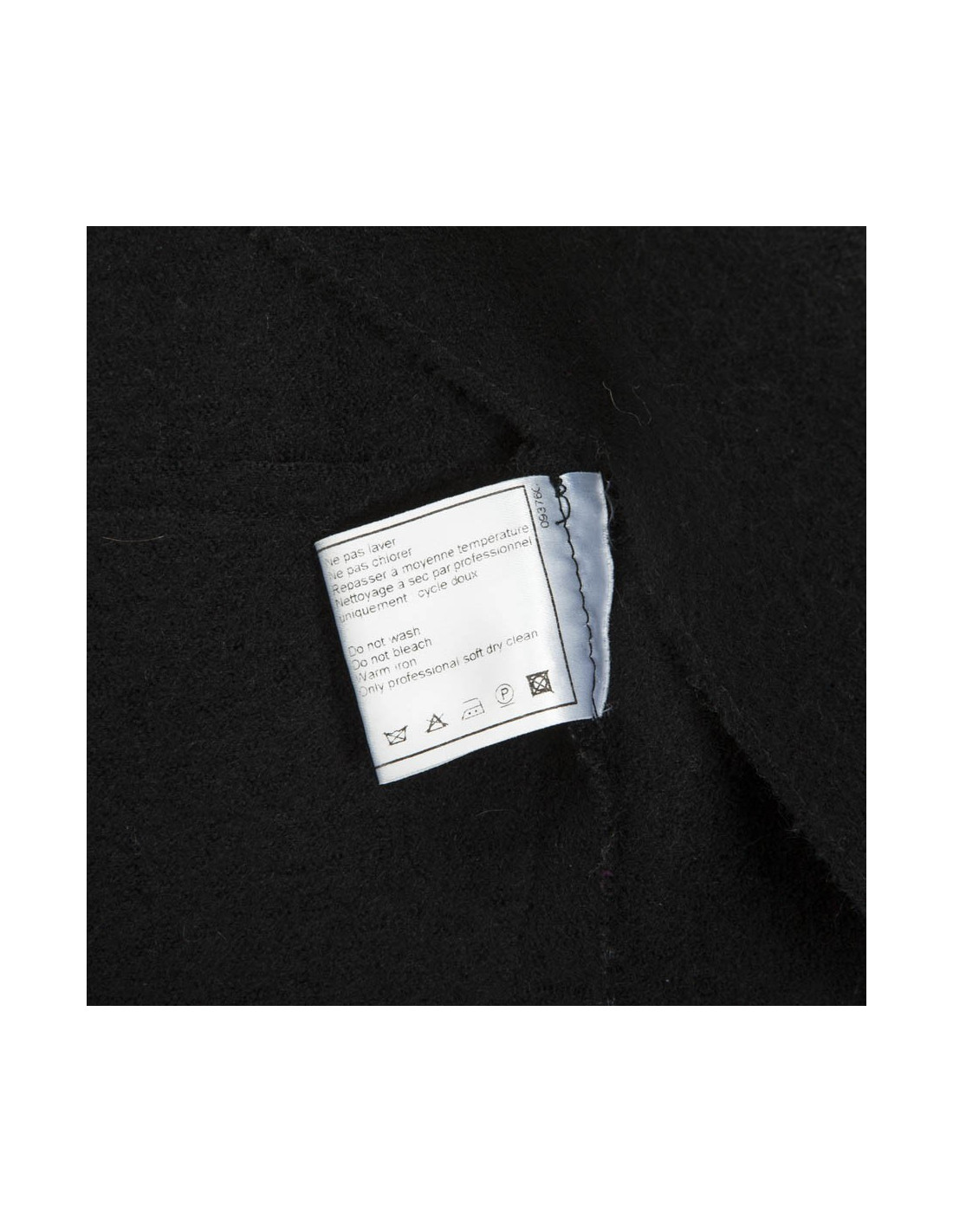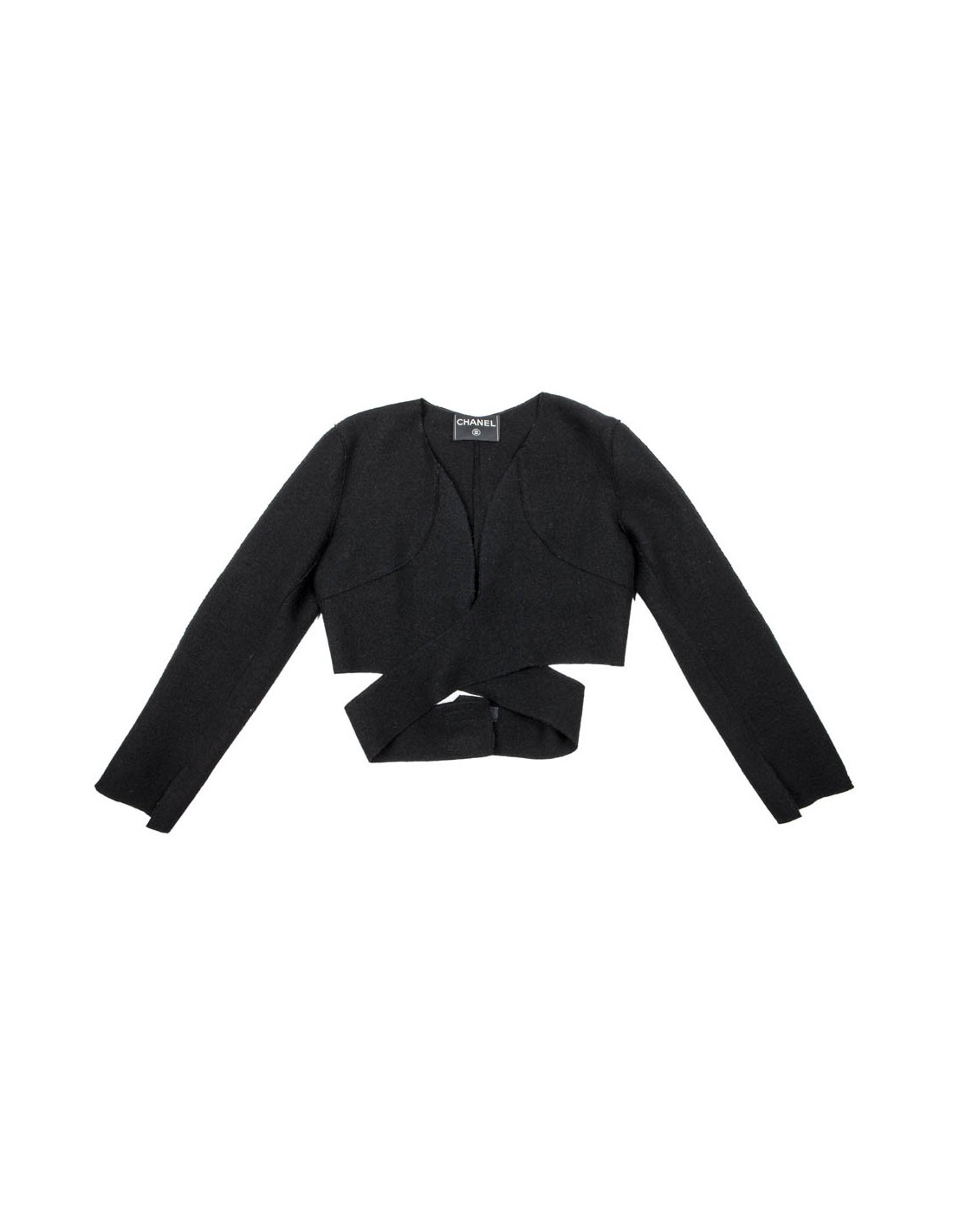 Boléro CHANEL en laine bouillie noire qui se ferme façon cache-coeur par 2 longues bandes avec du scratch au bout, brodé d'un mini sigle CC en métal noir.