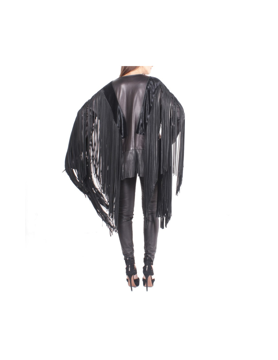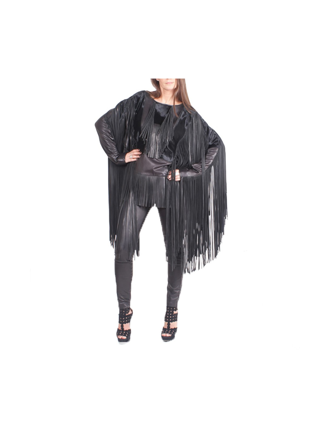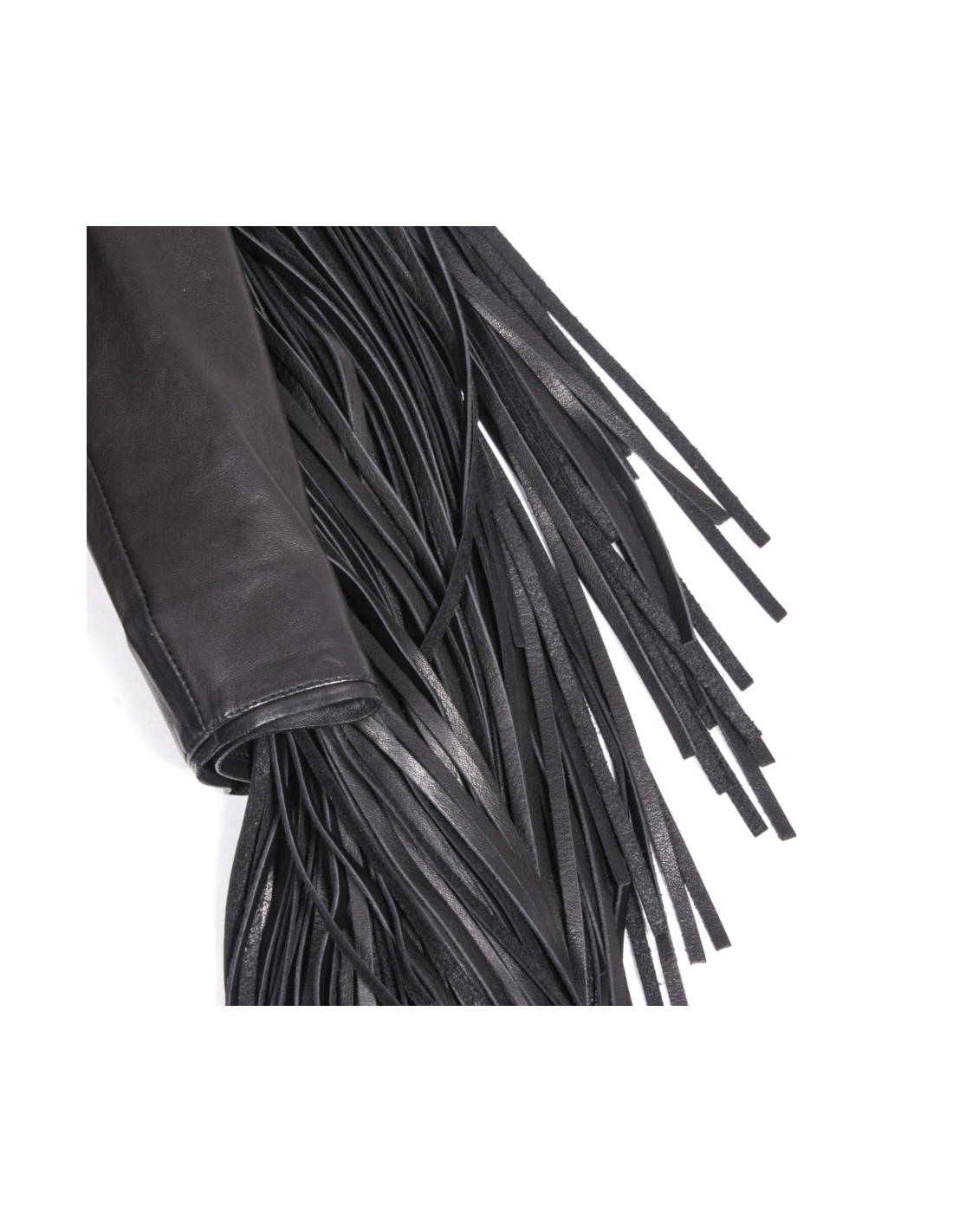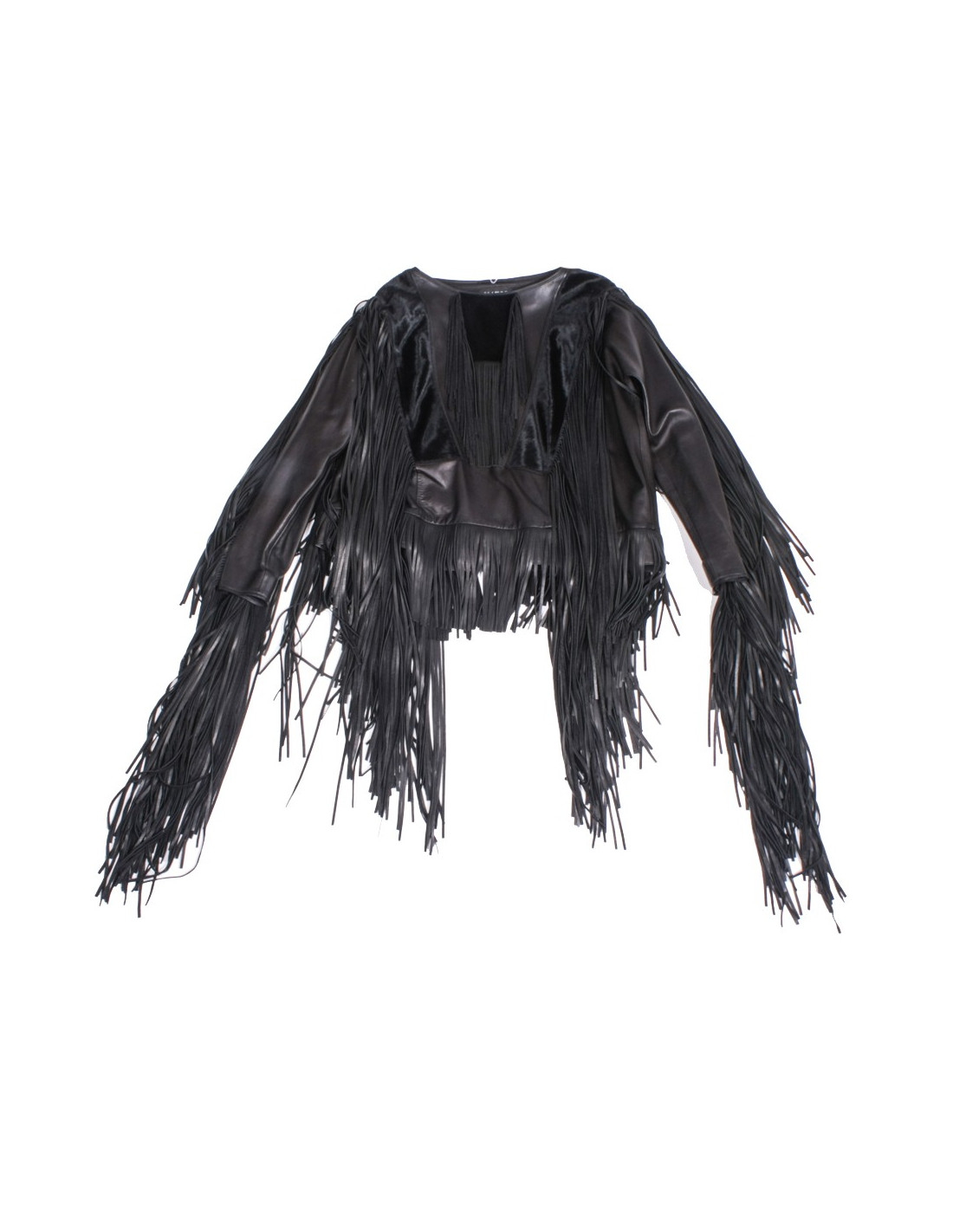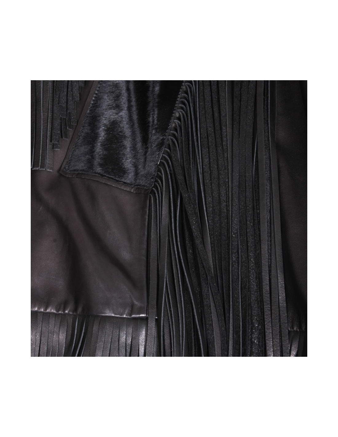 Exceptionnel Haut TOM FORD du défilé AH 2013 en agneau plongé noir avec applications en poulain noir ainsi que de longues franges tout le long des manches, du buste, dans le dos et sur le bas. Taille 38 fr.
