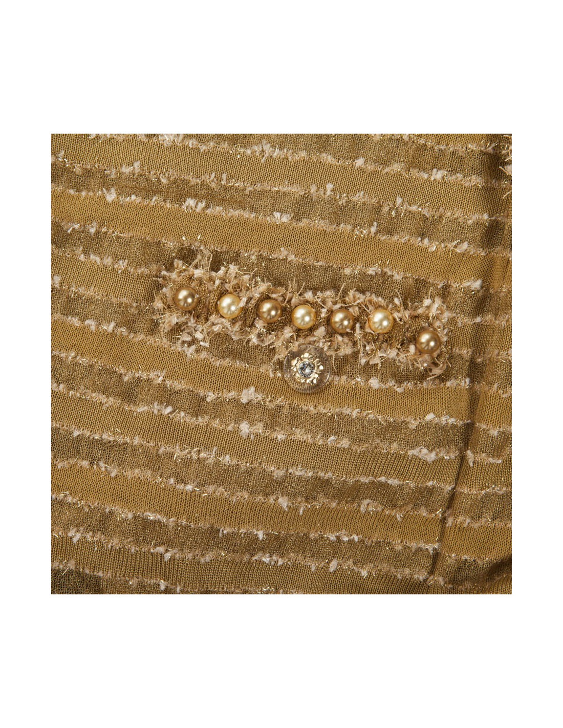 Veste Chanel, collection croisière 2015 à Dubaï, taille 38 FR, en très bon état. Elle est gansée de perles nacrées dorées et cuivrées. Entièrement dorée avec des fils d'or. Très près du corps. Idéale à porter comme un boléro.