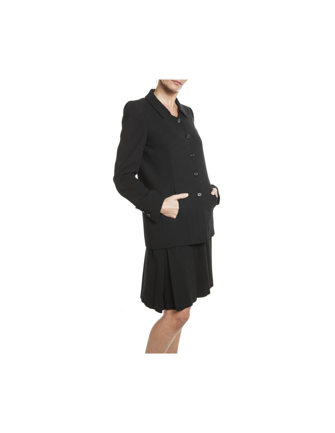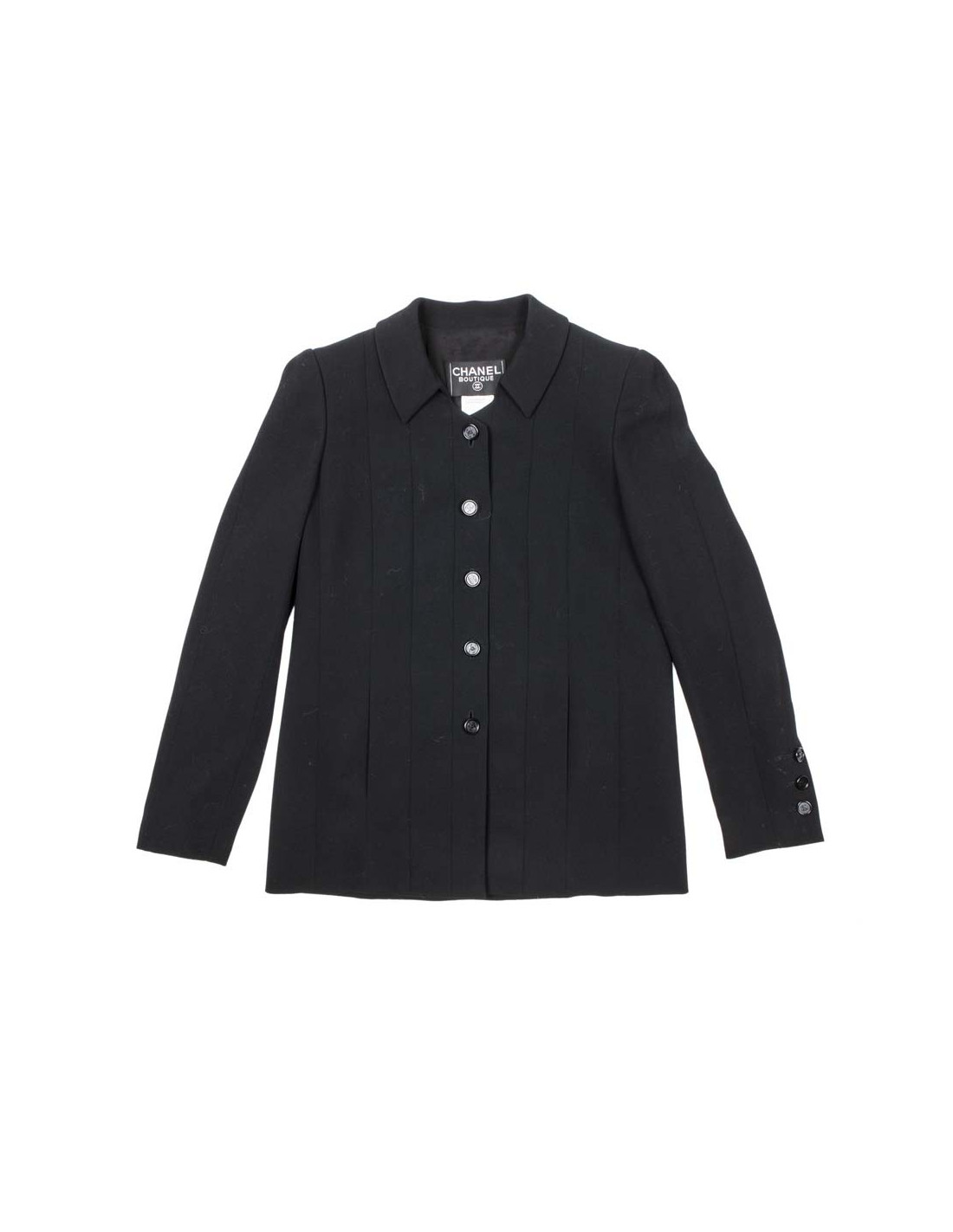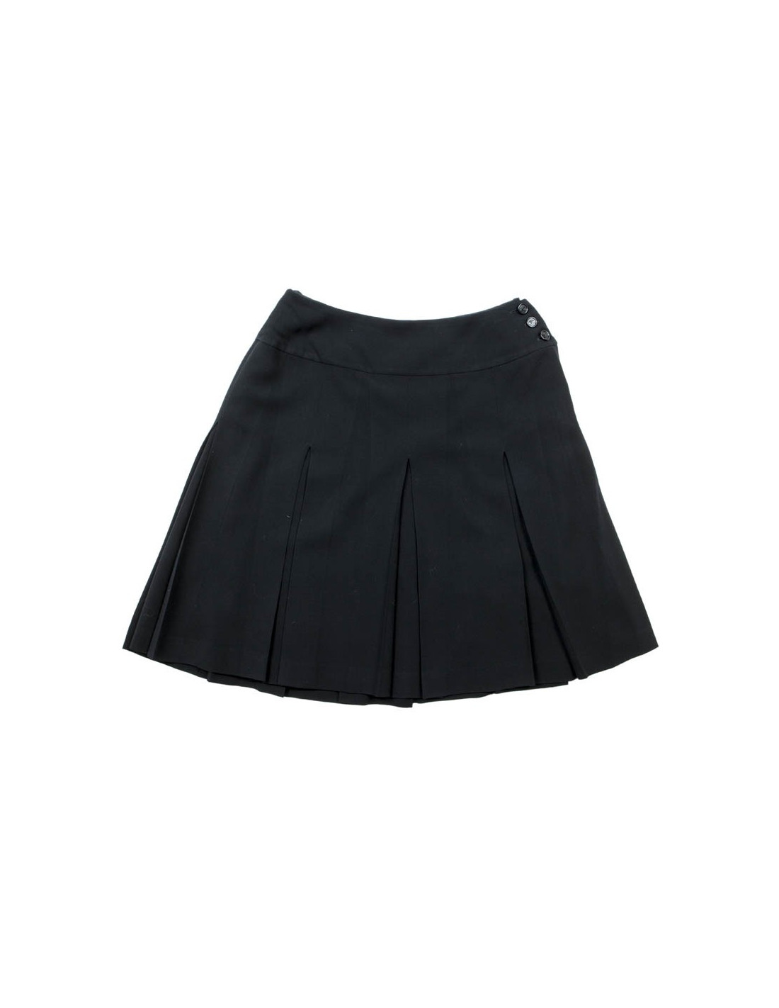 Printemps 1998. Ensemble CHANEL en laine noire composé d'une veste à la coupe parfaite avec 2 poches sur les côtés; elle se ferme à l'aide de 5 boutons noirs siglés CC et une ravissante jupe plissée fermée sur le côté par 3 boutons et une fermeture éclair. La doublure est en soie noire. Cet ensemble est en parfait état.