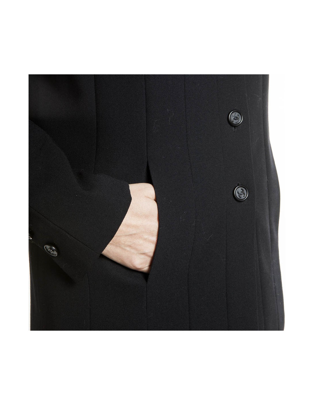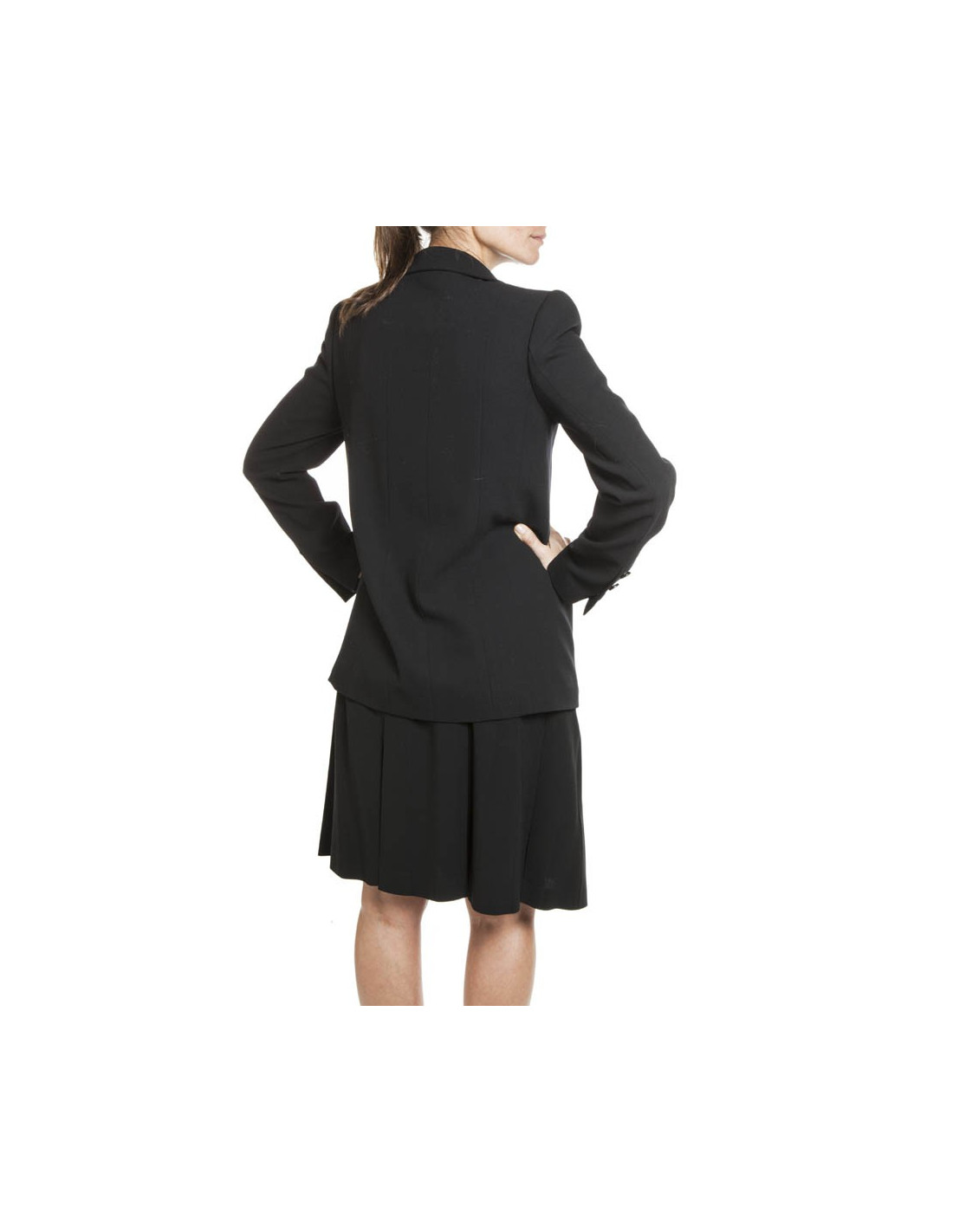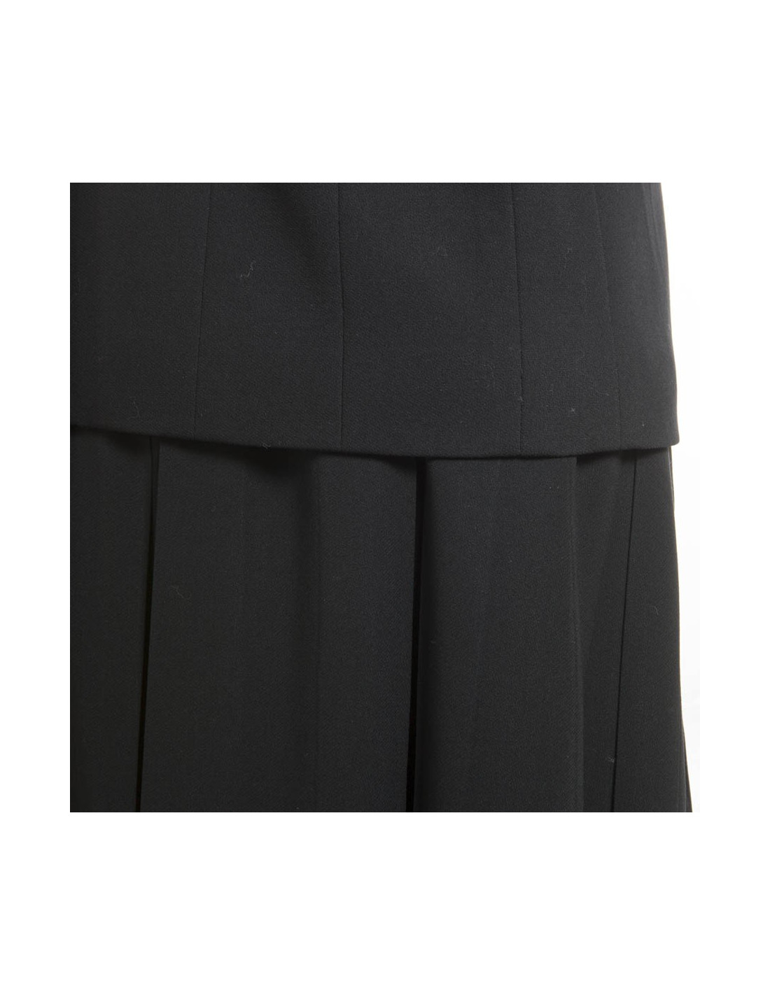 Printemps 1998. Ensemble CHANEL en laine noire composé d'une veste à la coupe parfaite avec 2 poches sur les côtés; elle se ferme à l'aide de 5 boutons noirs siglés CC et une ravissante jupe plissée fermée sur le côté par 3 boutons et une fermeture éclair. La doublure est en soie noire. Cet ensemble est en parfait état.