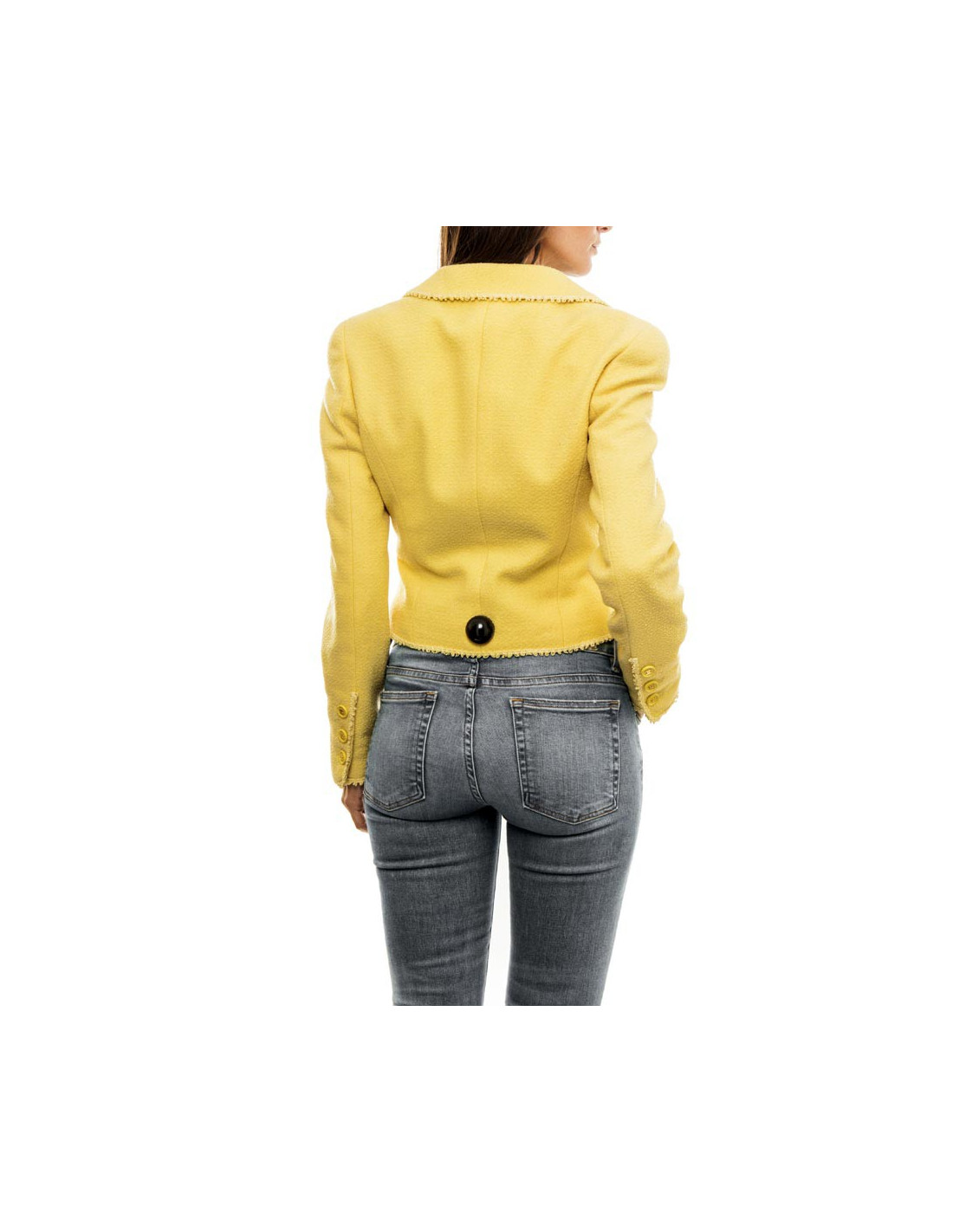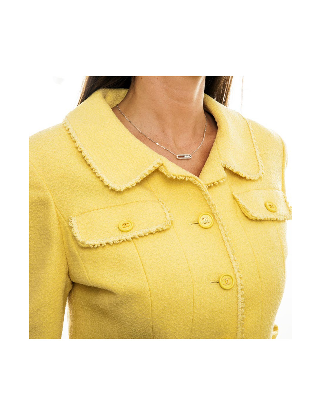 Collector. Veste Chanel courte T40 en laine jaune mimosa avec doublure en soie 100% monogram, Collection Printemps 97, fermée par quatre boutons siglés. Deux poches plaquées sur la poitrine fermées par deux boutons, les manches ont également trois boutons jaunes siglés "CC" dorés.