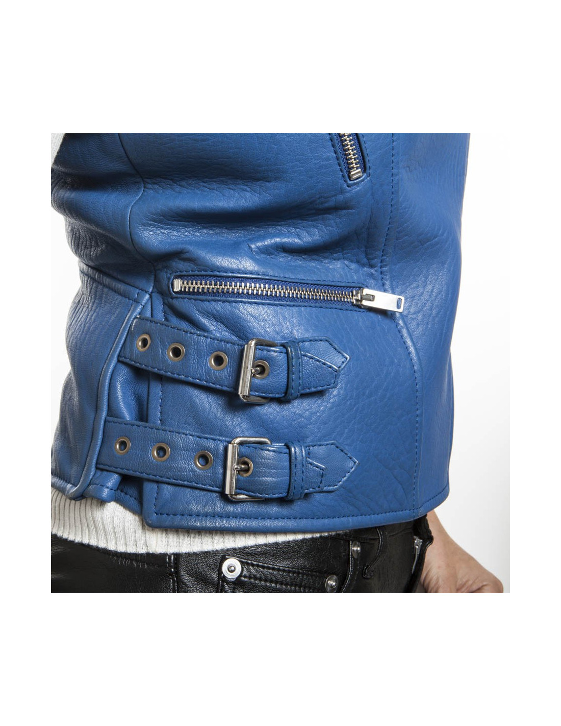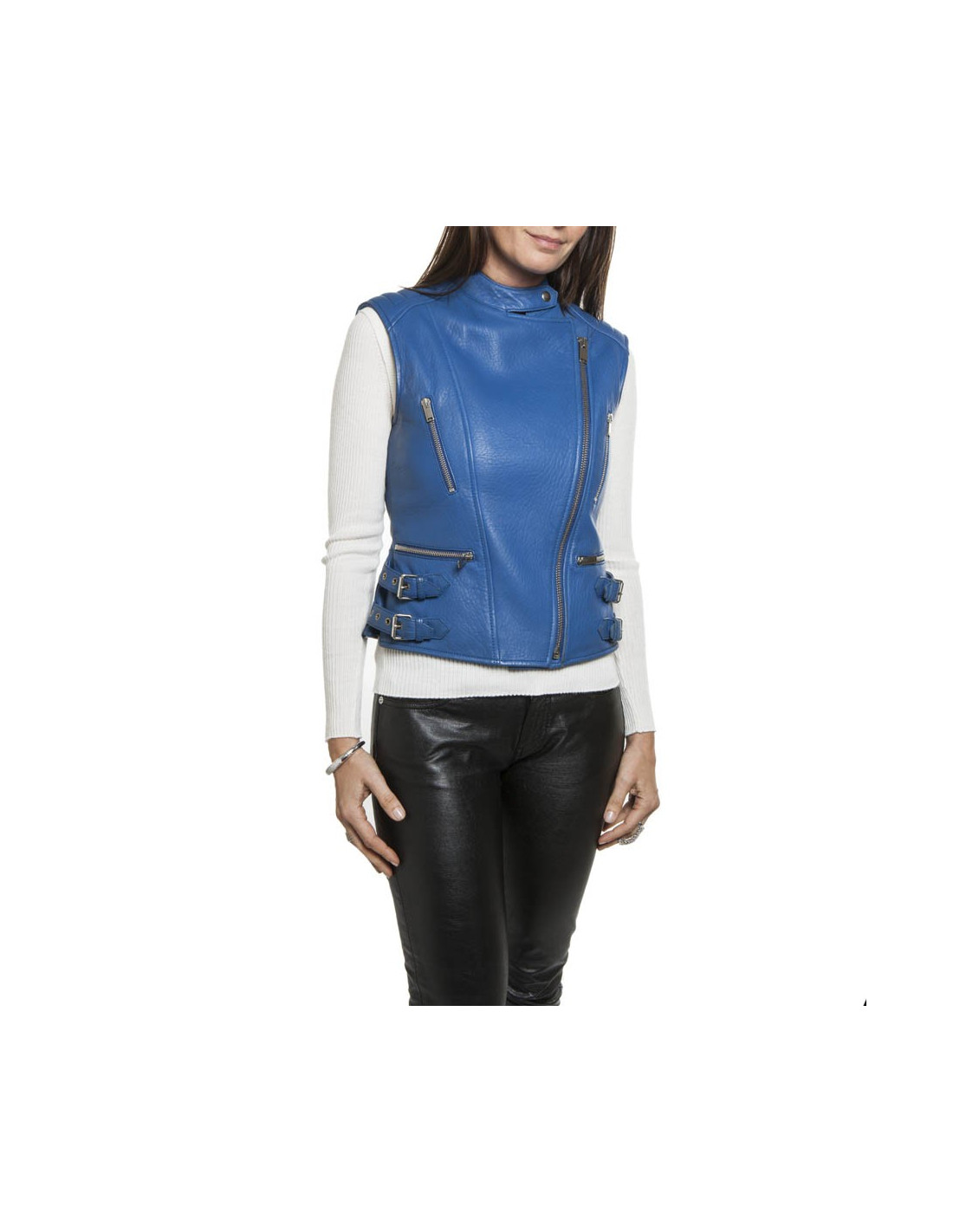 Veste Céline sans manches façon perfecto en agneau bleu électrique qui se ferme à l'aide d'une fermeture éclair en biais sur la poitrine.