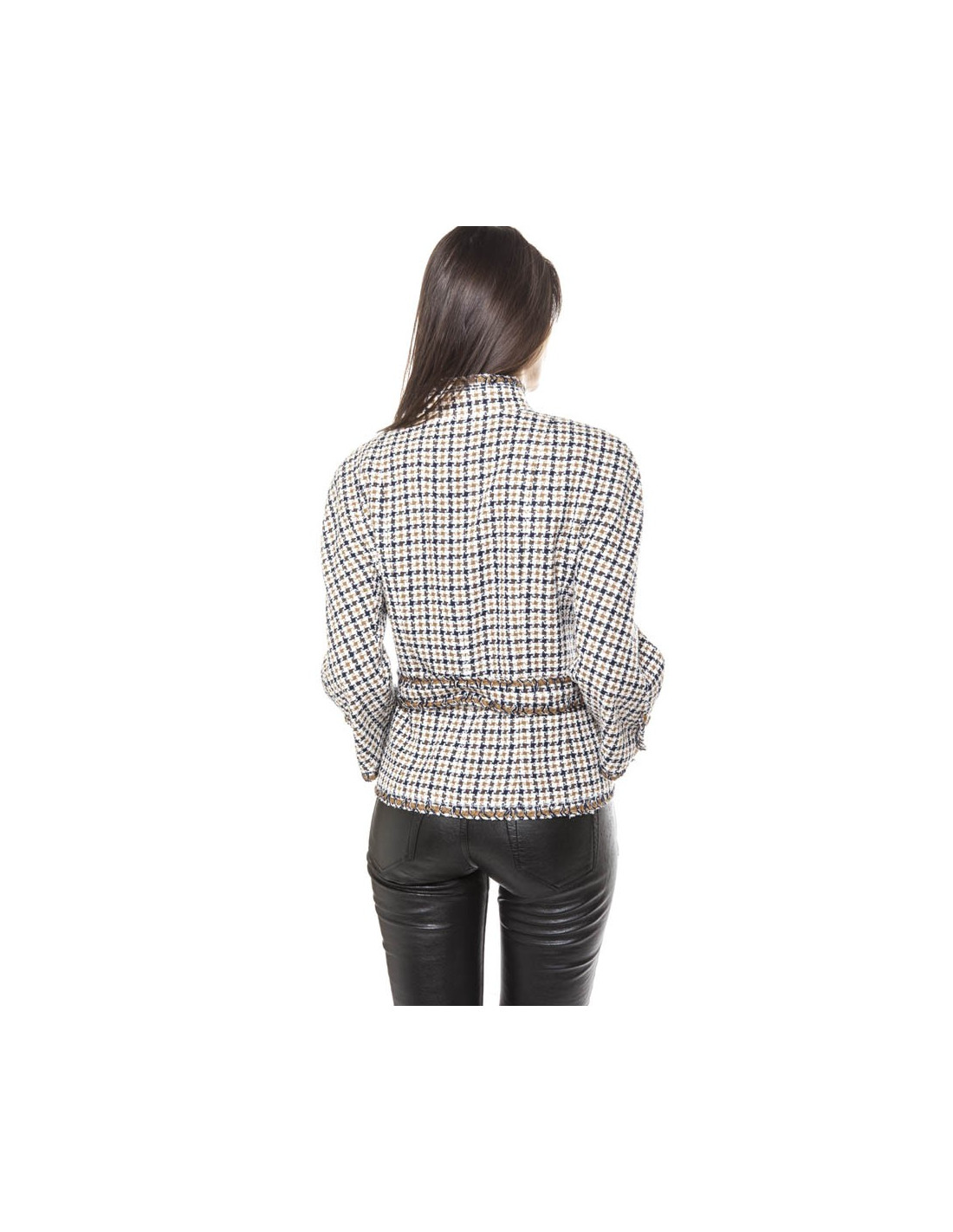 Ravissante veste CHANEL en tweed pied de poule beige et bleu se ferme à l'aide de 5 boutons en tweed et métal doré dissimulés à l'avant.