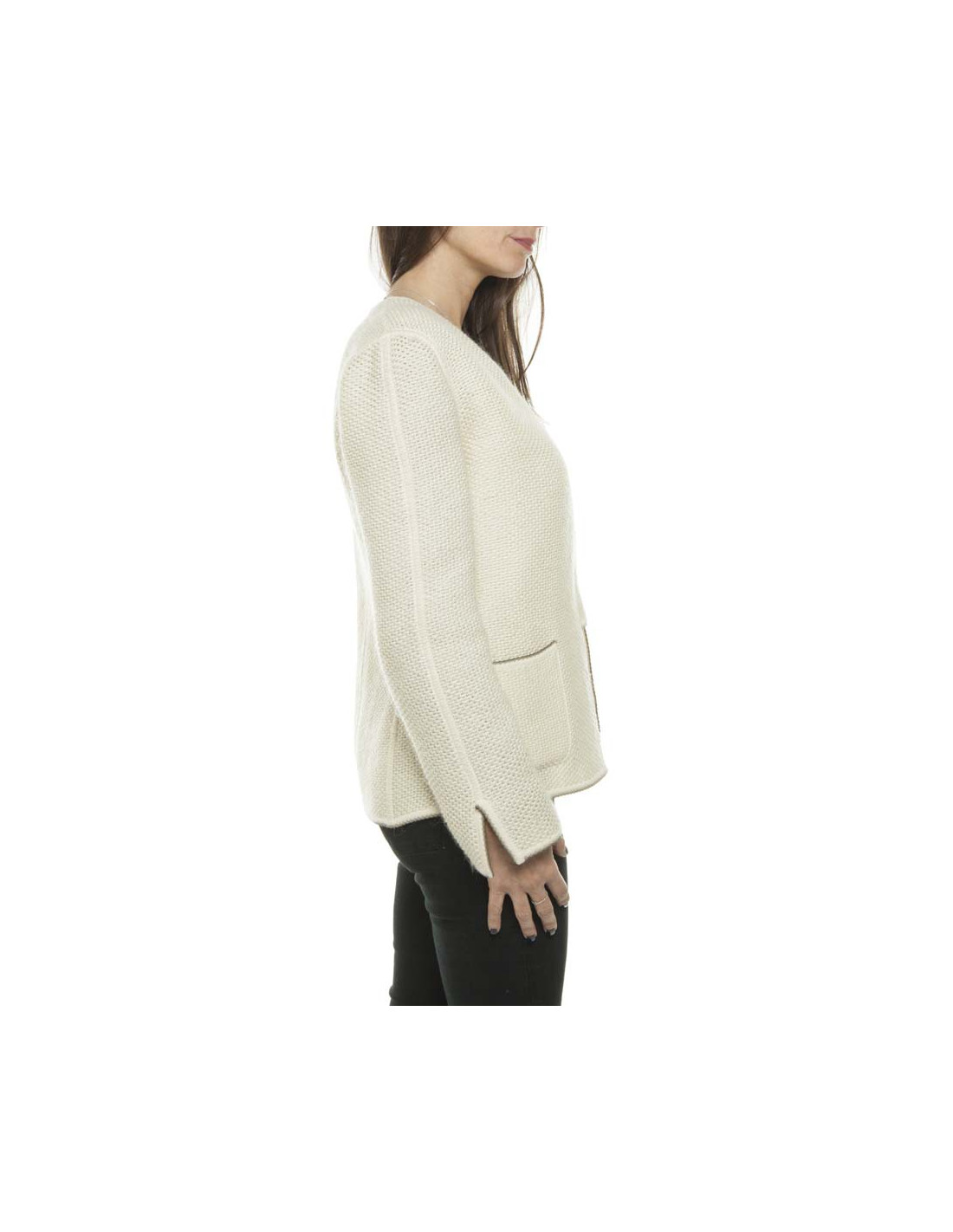 Veste sans boutons avec 2 poches : épaules 42 cm, aisselles 46 cm, hauteur totale 63 cm, longueur des manches 59 cm, tour de poignet 26 cm.