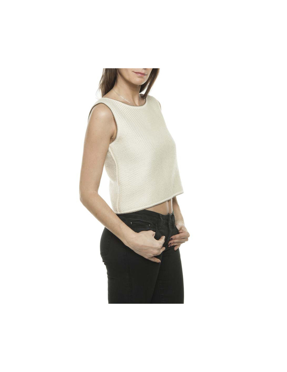Pull sans manches : épaules 34 cm, sous les aisselles 44 cm, hauteur totale 45 cm
