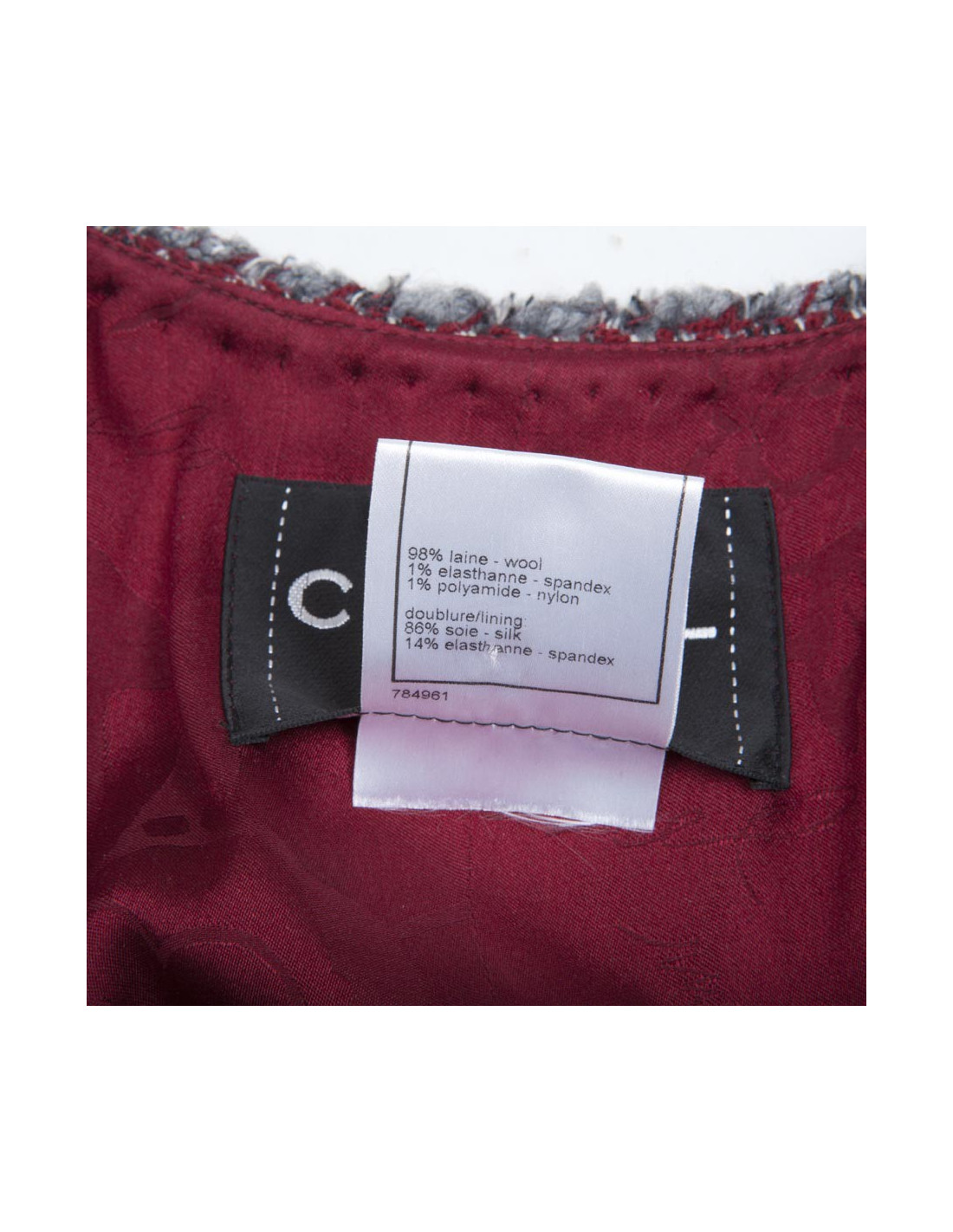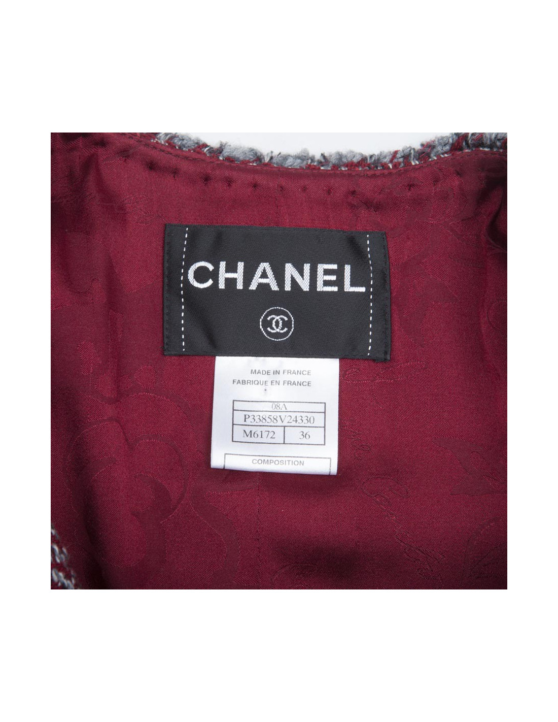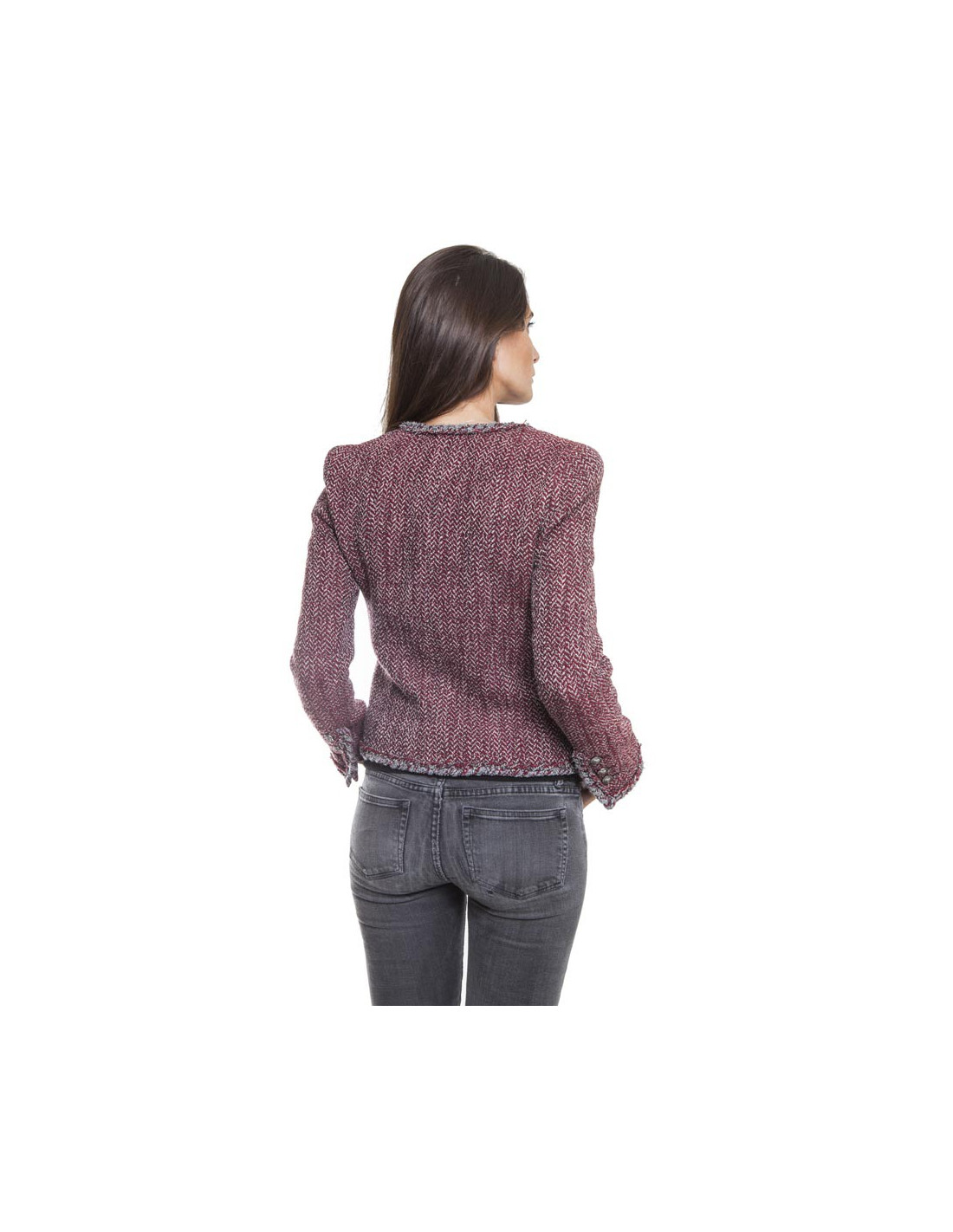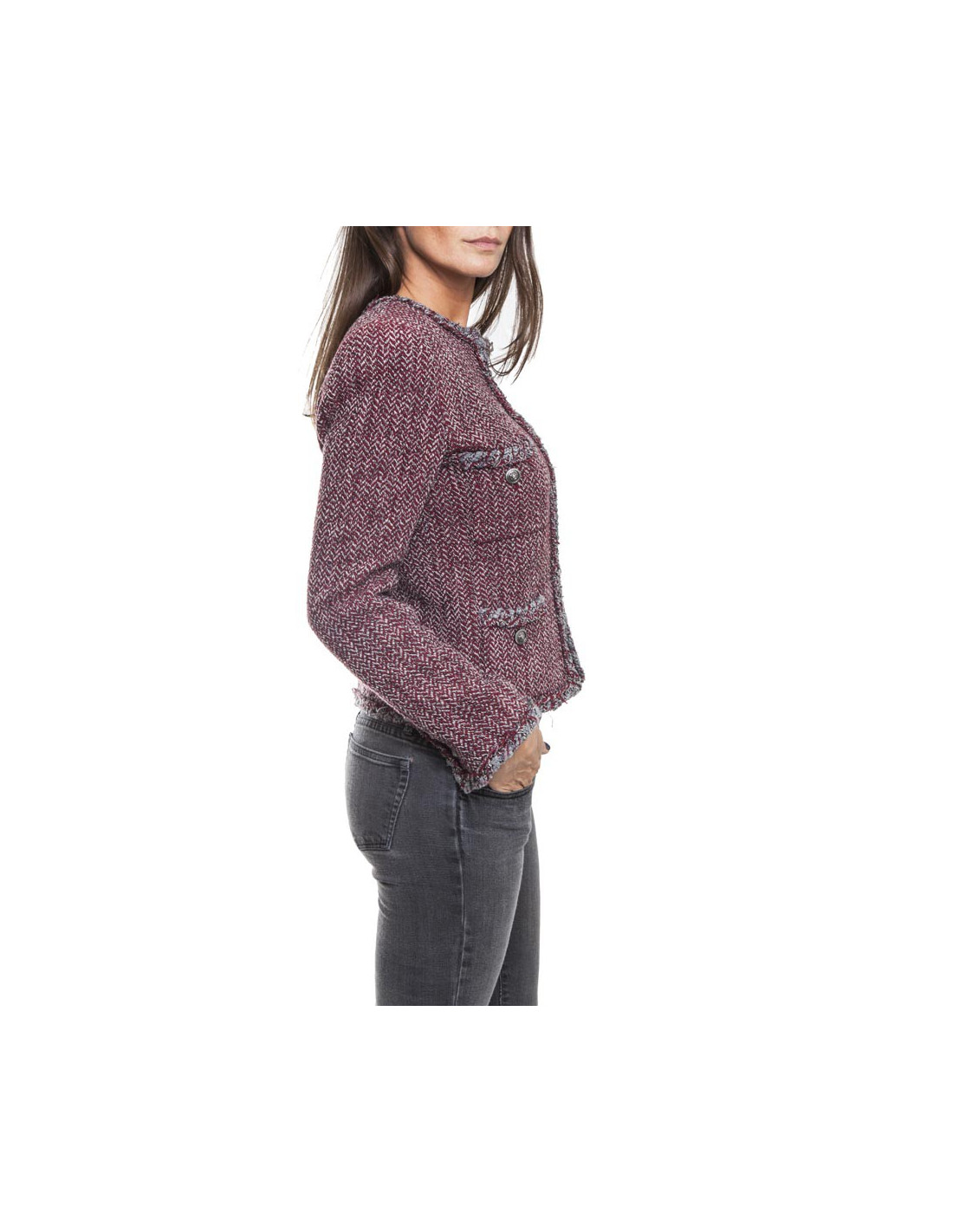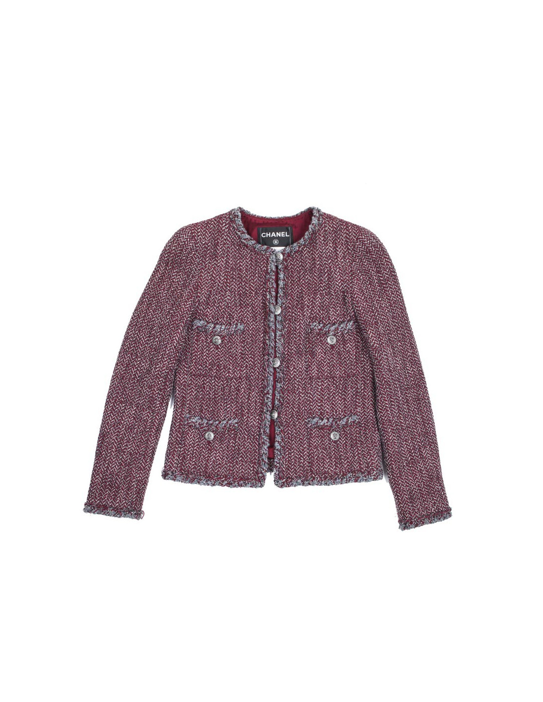 La petite veste par excellence. Veste CHANEL T 36 "Paris-Venise" en tweed à chevrons rouge blanc et gris.Elle se ferme par 4 boutons métal gris mat siglés "tête de lion".