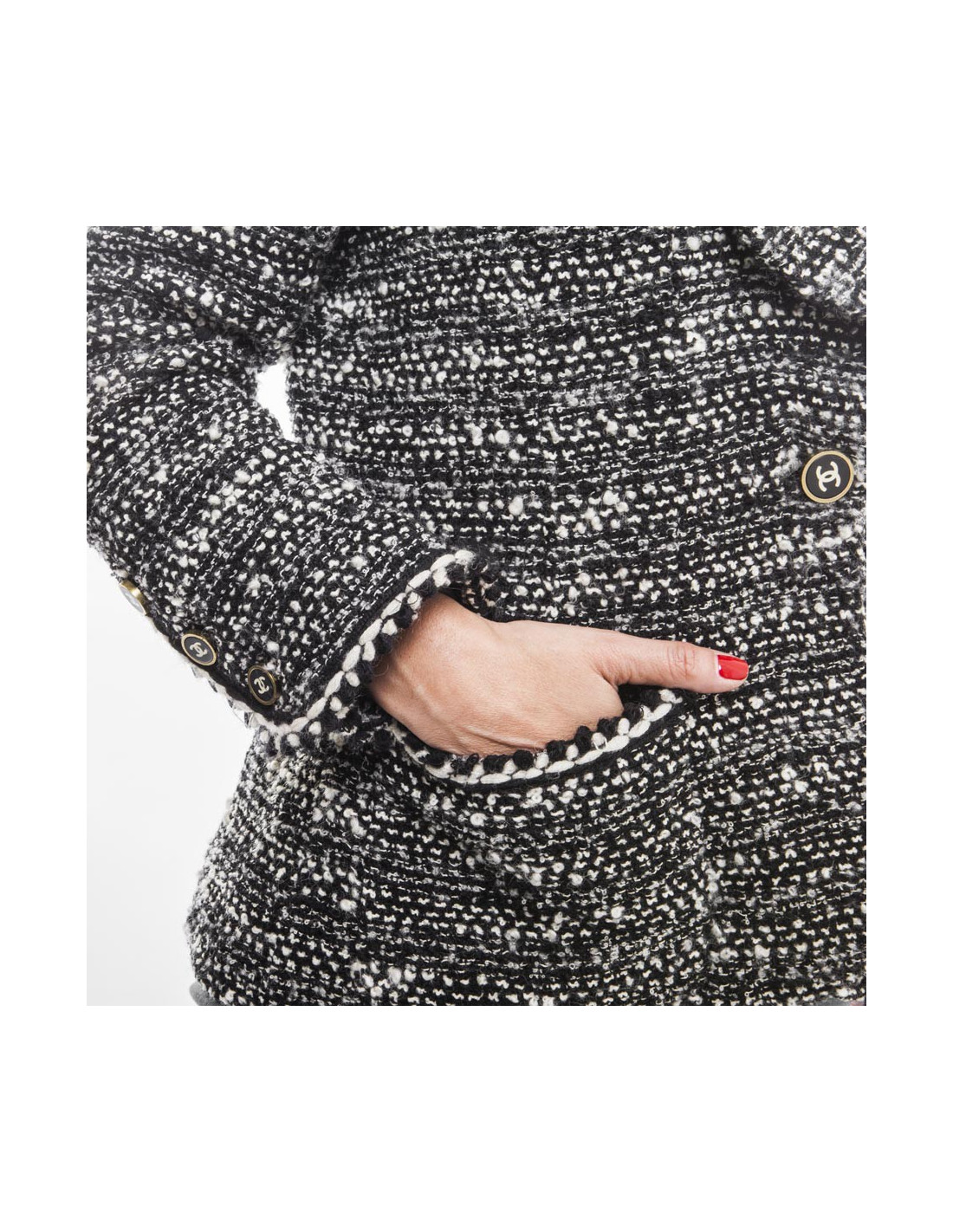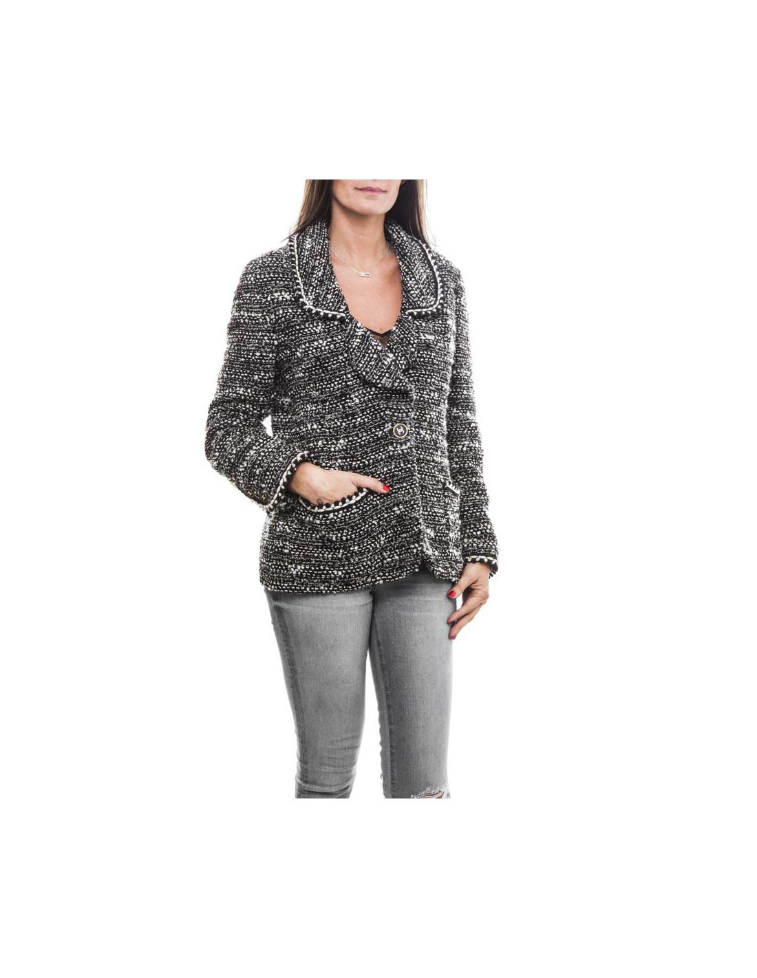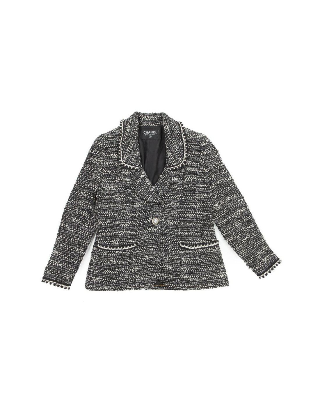 Veste Chanel en laine tweed chinée noir et blanc, taille 42/44 EU (absence d'étiquette de taille et de matière), fermée par un bouton noir siglé double "C" beige et doré vieilli (signé à l'arrière Chanel , deux poches plaquées bordées d'un galon de même couleur ainsi qu'au tour des manches. La doublure est en soie 100 % noire monogram.