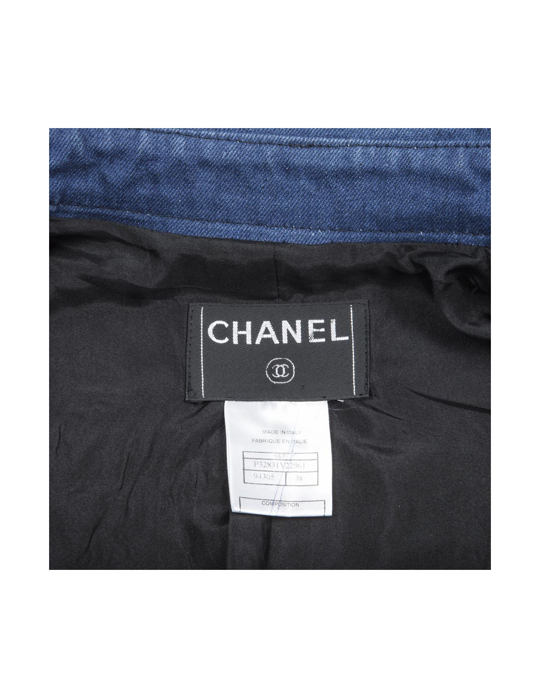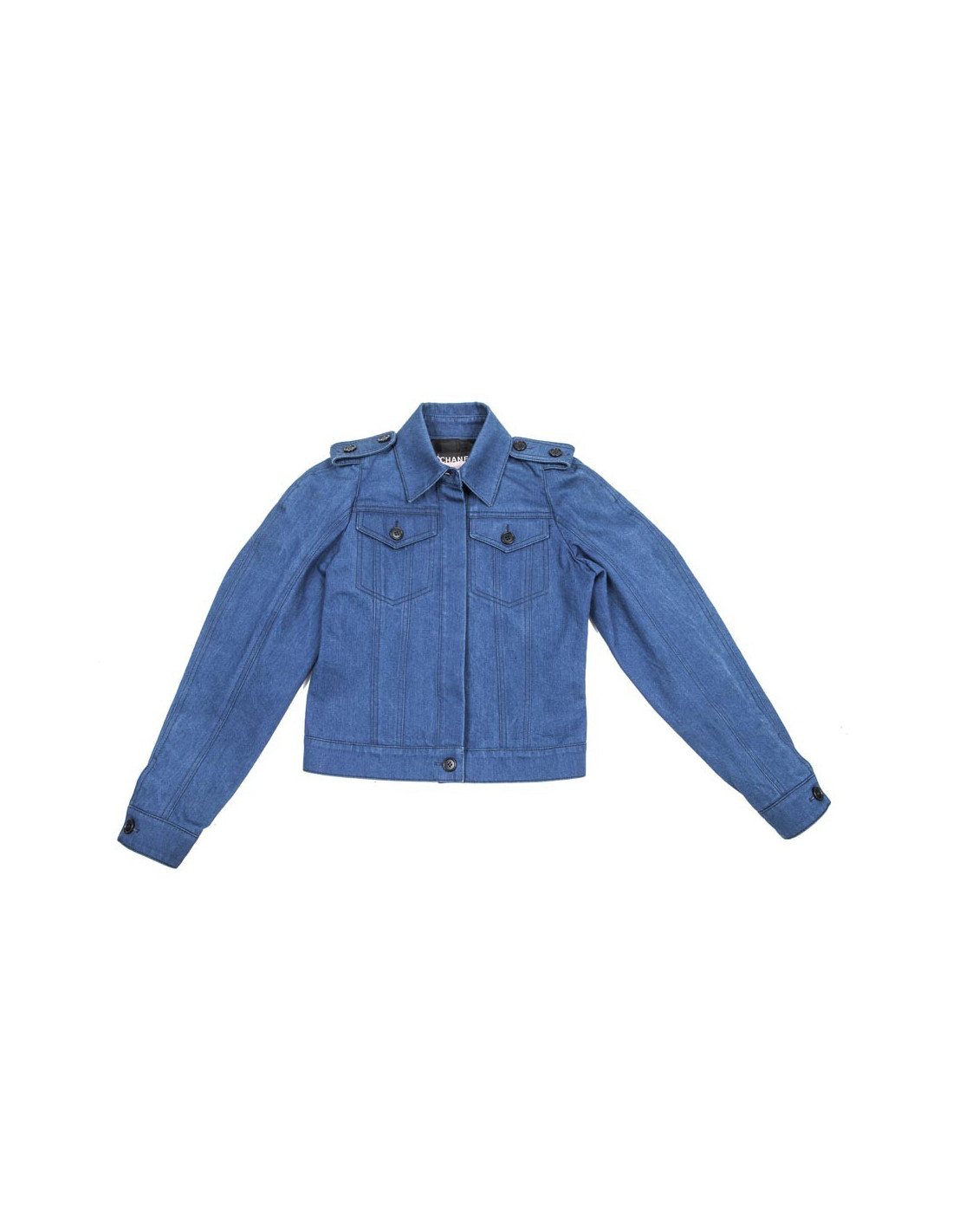 Veste T 38, en toile denim bleue Chanel en coton. Collection Printemps été 2008. Fermeture par boutons noirs.