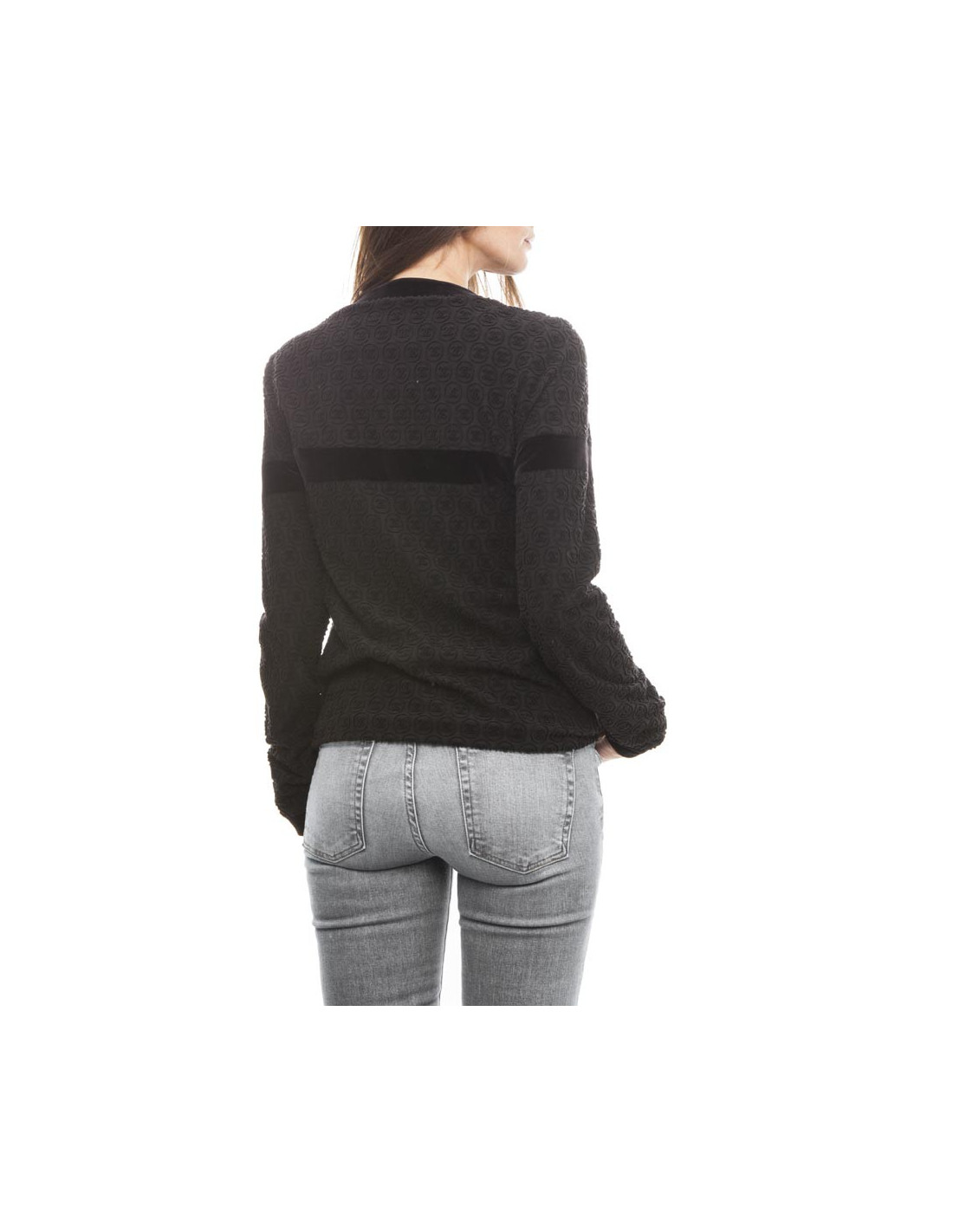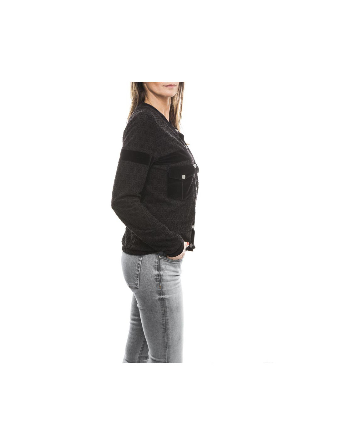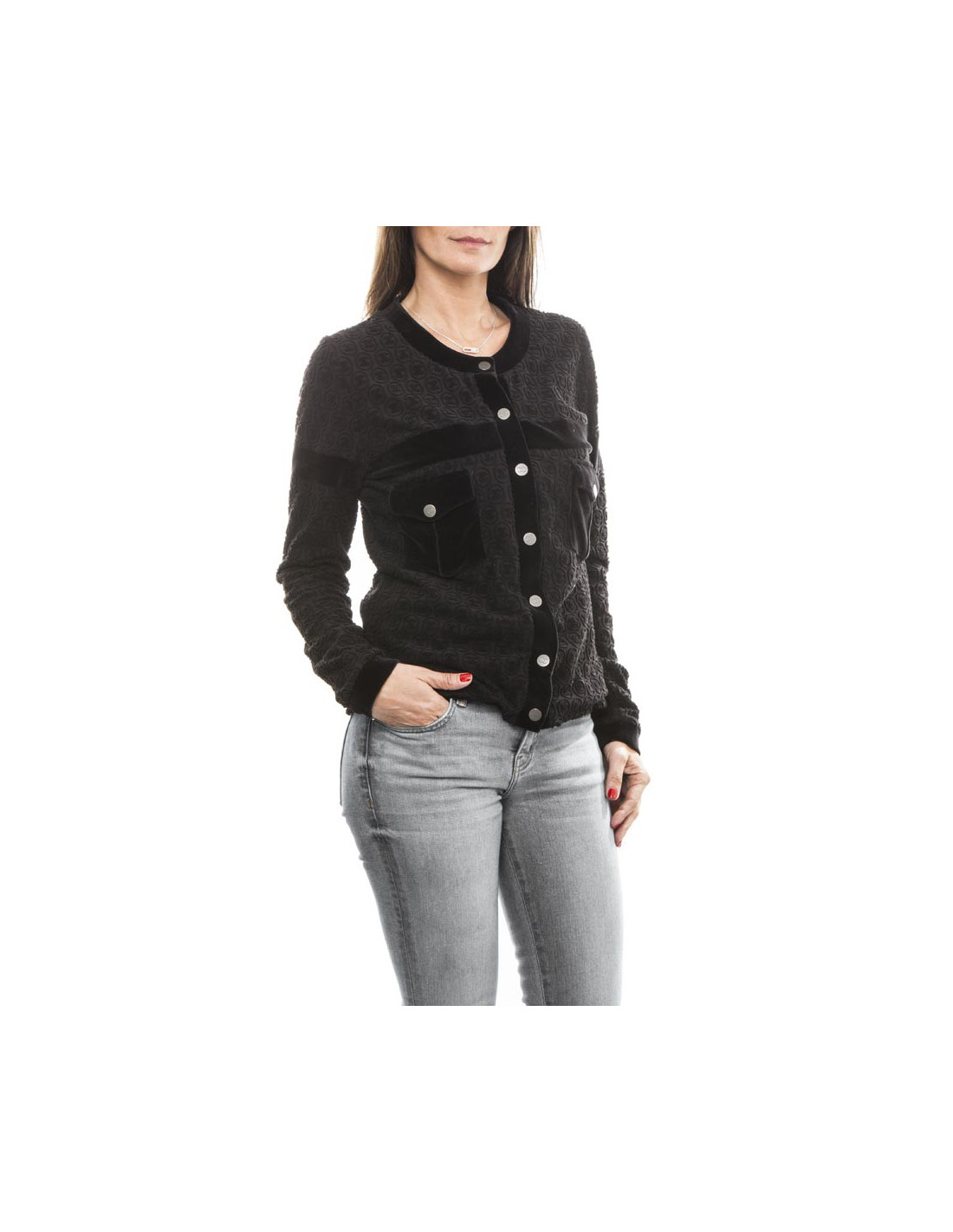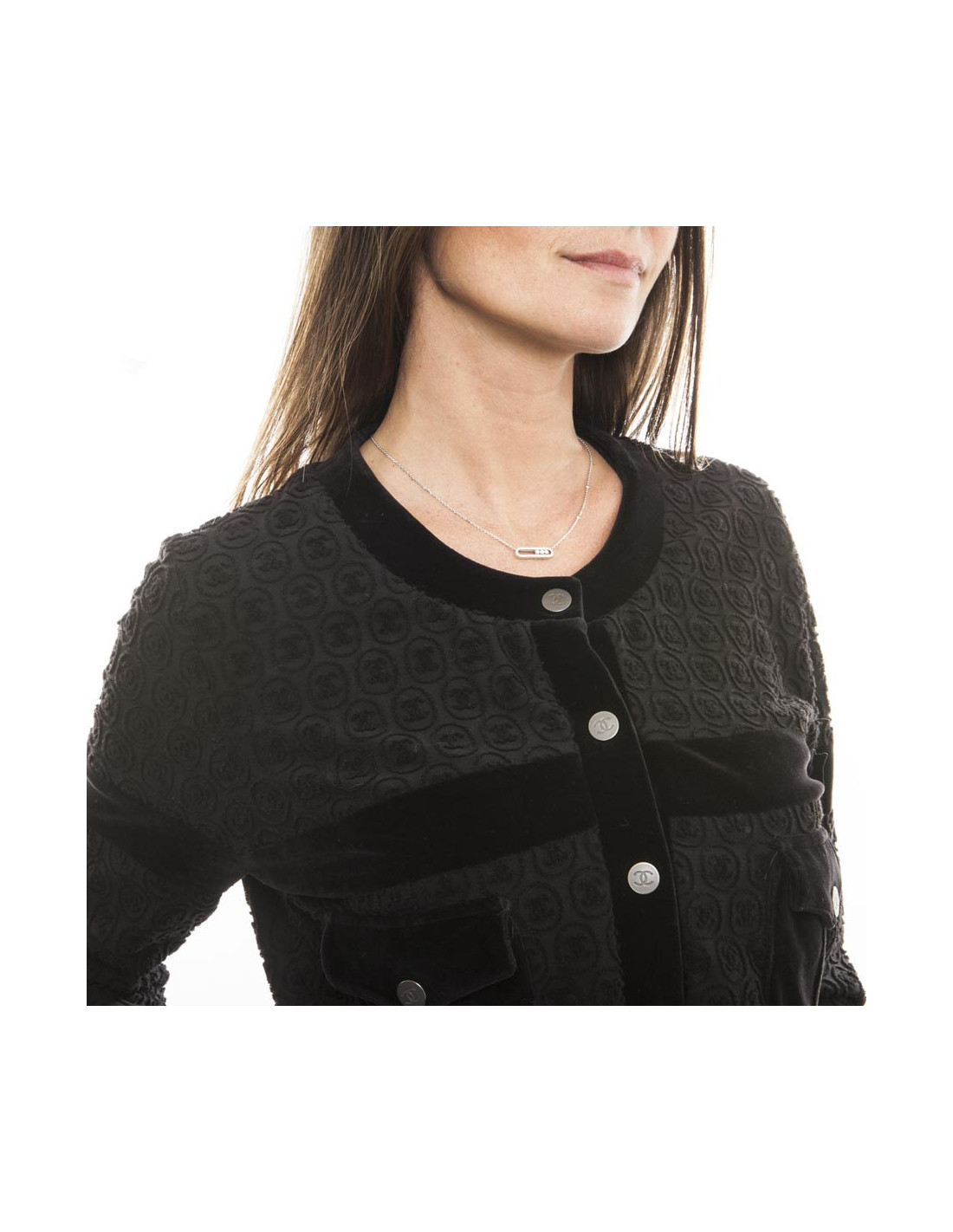Blouson de la maison Chanel en coton noir siglé "CC". Fermeture par boutons pression "CC", avec deux petites poches au niveau de la poitrine (fermeture par pression) et est entièrement siglé "CC". Doublure en modal et coton noir.