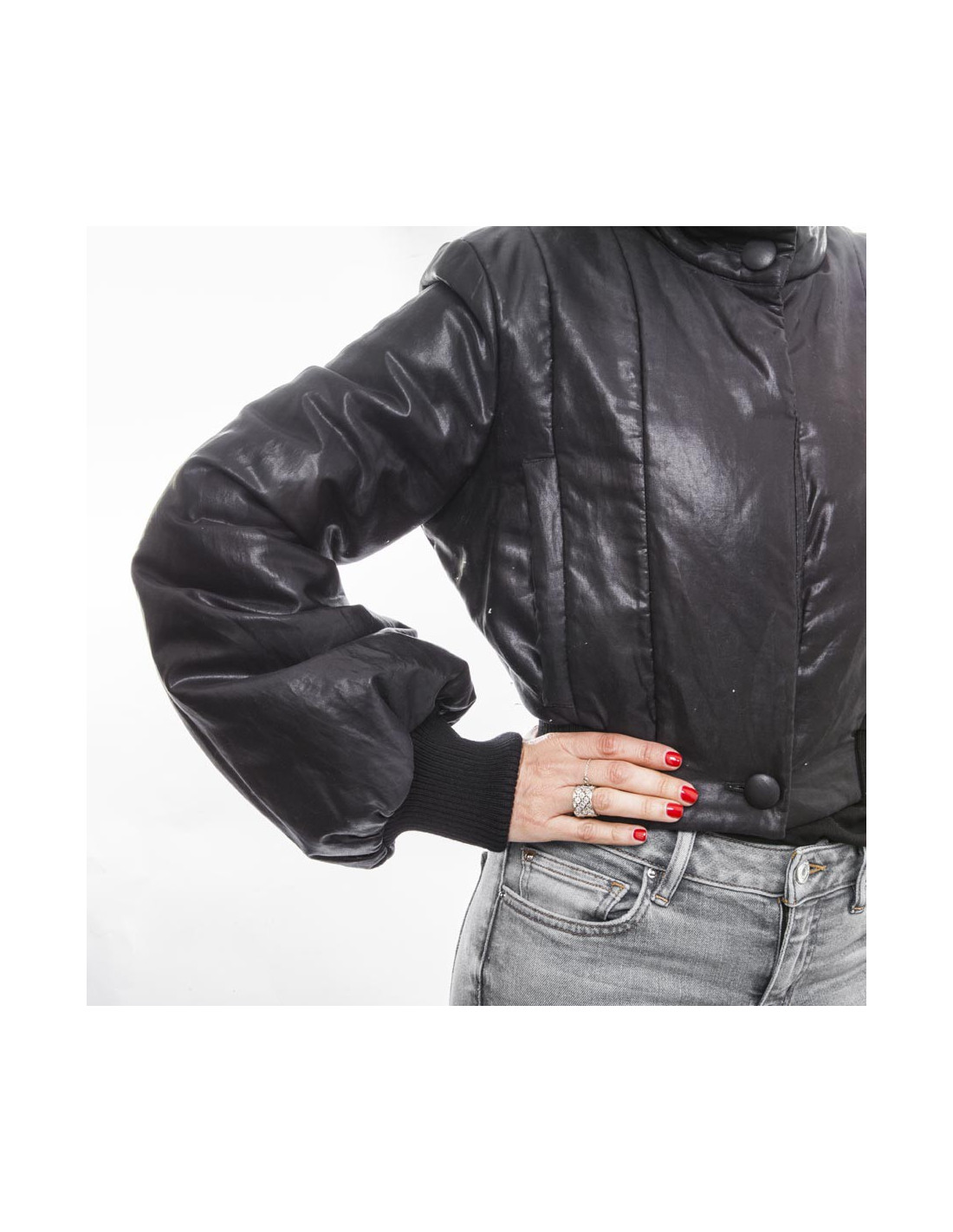 Blouson zippé court, taille 42, Chanel en polyethylene et coton noir effet irisé. Il y a sur le col et le bas du blouson des boutons et des pressions qui cachent la fermeture éclair. Il a 2 poches (fentes) extérieures et une poche intérieure zippée. La doublure est en tissu noir. En très bon état d'usage. Une particularité : les manches s'évasent au niveau du coude et se resserent au poignet.