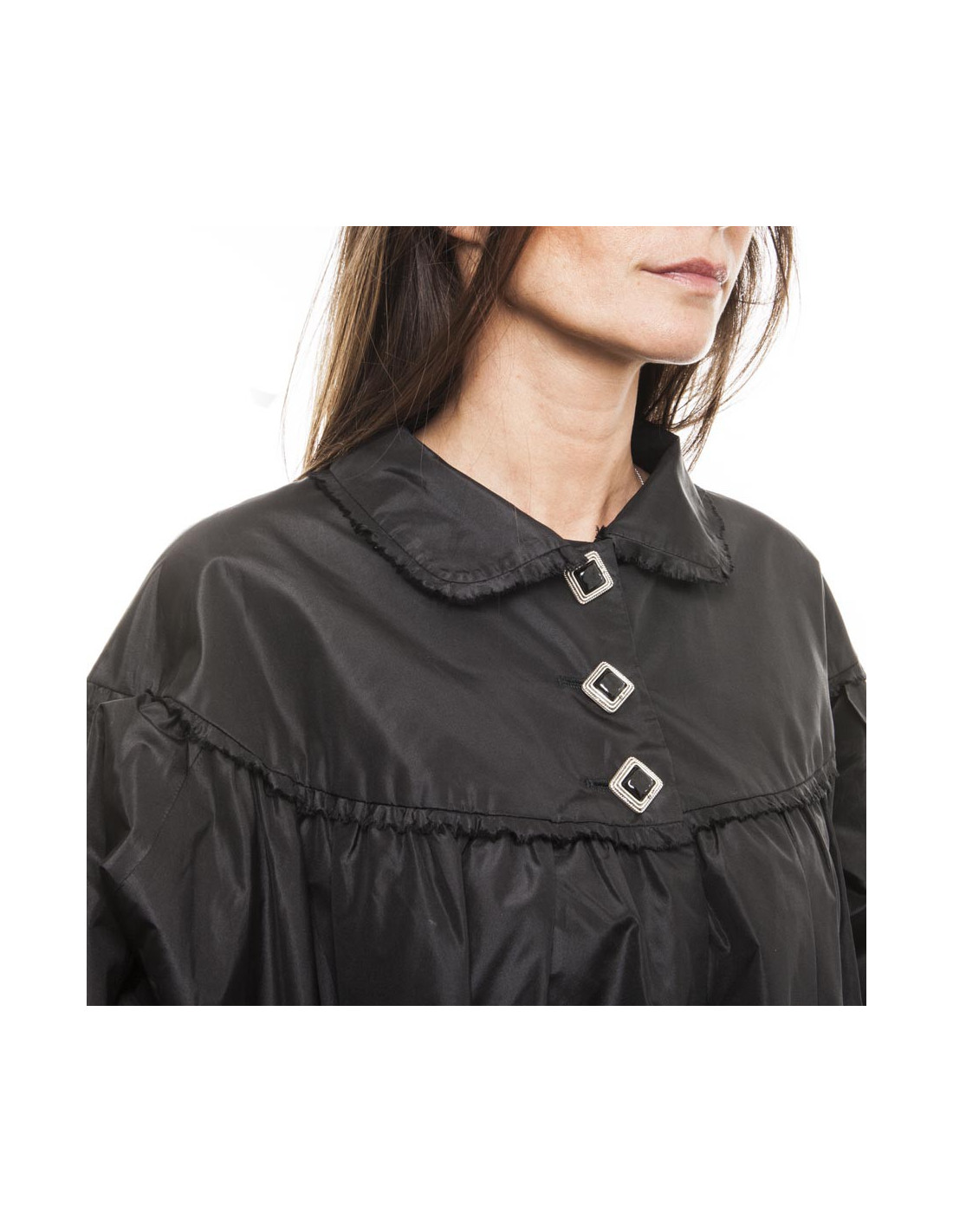 Veste longue de cocktail Chanel en soie noire. Collection Automne Hiver 2008. Se ferme avec une boutonnière au niveau du col, les boutons sont de forme carrée en métal argenté avec une pierre noire et un petit sigle "CC". Deux grandes poches non fermées et des bandes de détails sur les épaules, poches, le dos et le bas. Poignets serrés par élastique. Doublé dans la même matière, provient des soldes.